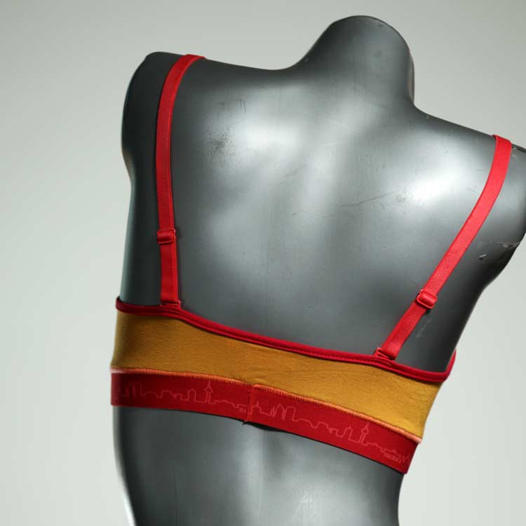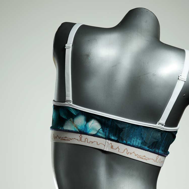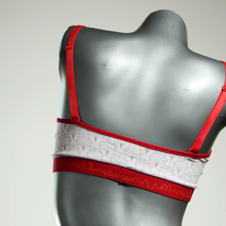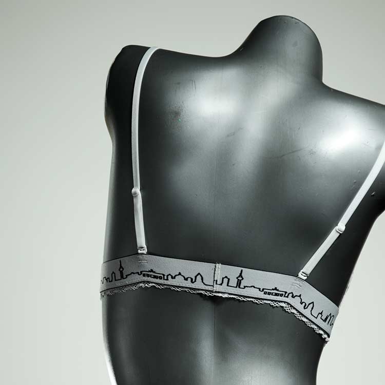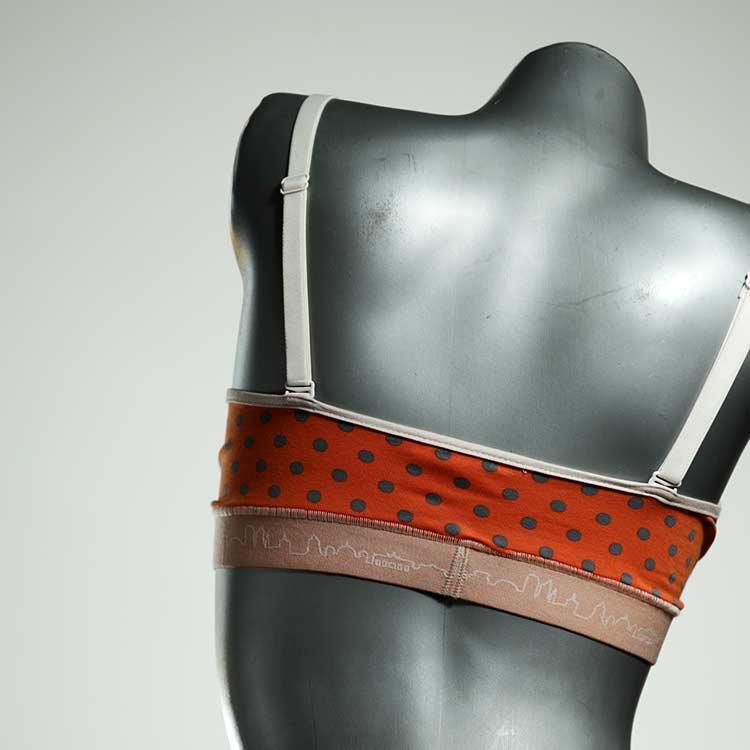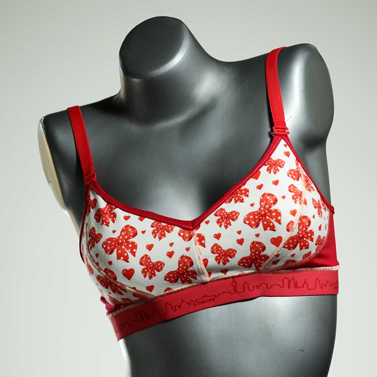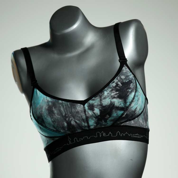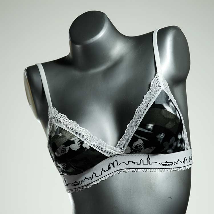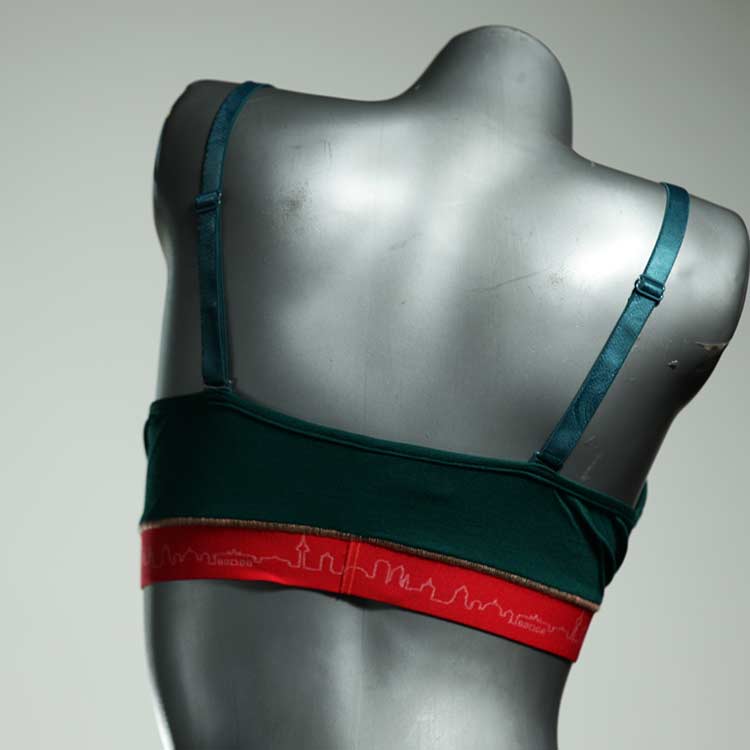 Kuschelig-weiche BHs aus atmungsaktivem Baumwolljersey mit einzigartigen Designs. Echte Einzelstücke, die wir nach ihren Wünschen entworfen haben. Bügellos, ohne Kissen und Verschluss, sind sie angenehm zu tragen und passen sich so perfekt an ihren Körper an. Die Träger sind 16mm breit, die Körbchen sind doppellagig und innen aus Biobaumwolle. BHs von Berlin Underwear sind nicht in erster Linie sexy, sondern sollen bequem sein. Sie eignen sich auch als Still-BHs.