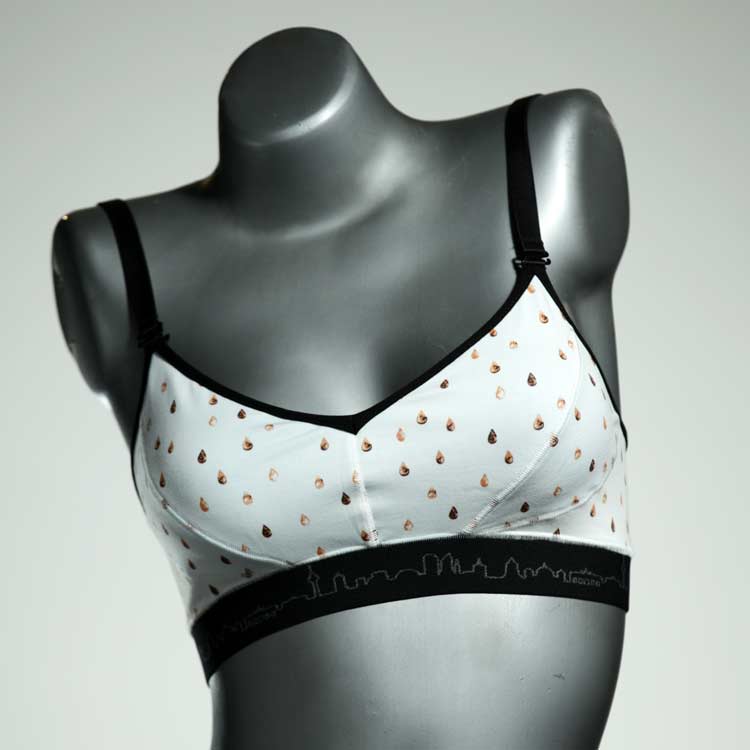 Kuschelig-weiche BHs aus atmungsaktivem Biobaumwolljersey mit einzigartigen Designs. Echte Einzelstücke, die wir nach ihren Wünschen entworfen haben. Bügellos, ohne Kissen und Verschluss, sind sie angenehm zu tragen und passen sich so perfekt an ihren Körper an. Die Träger sind 16mm breit, die Körbchen sind doppellagig und innen aus Biobaumwolle.