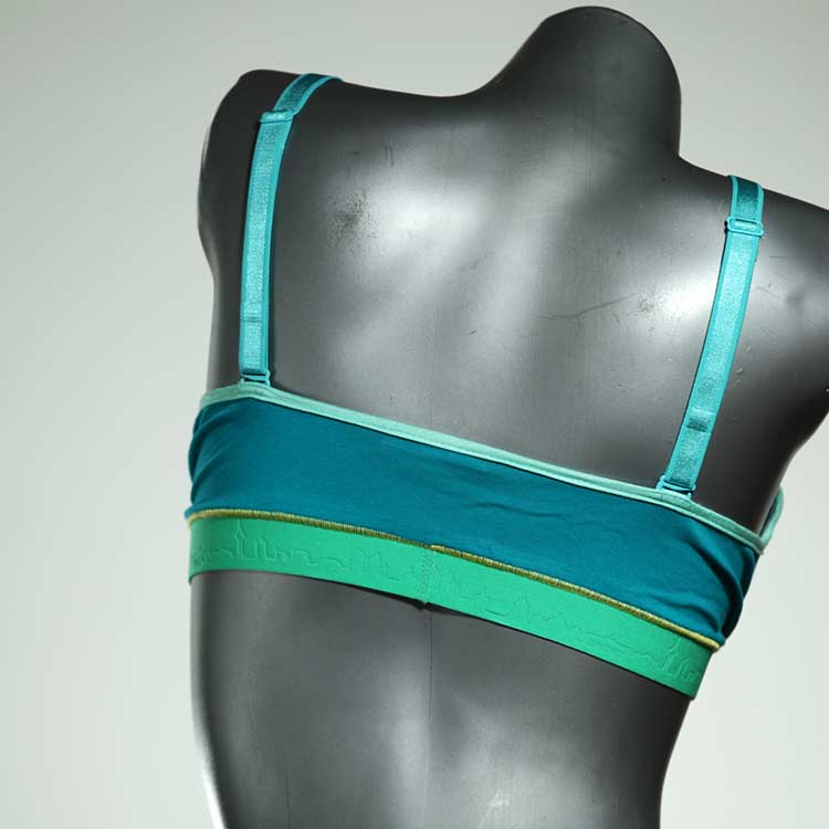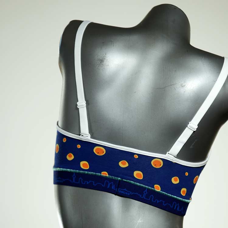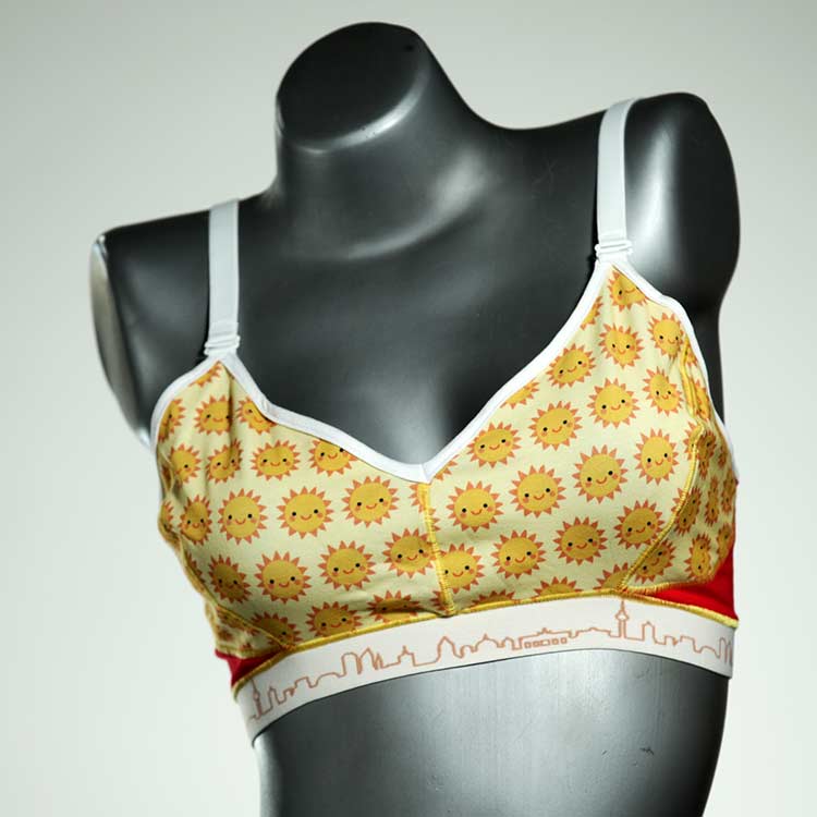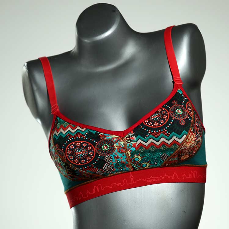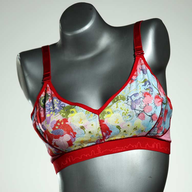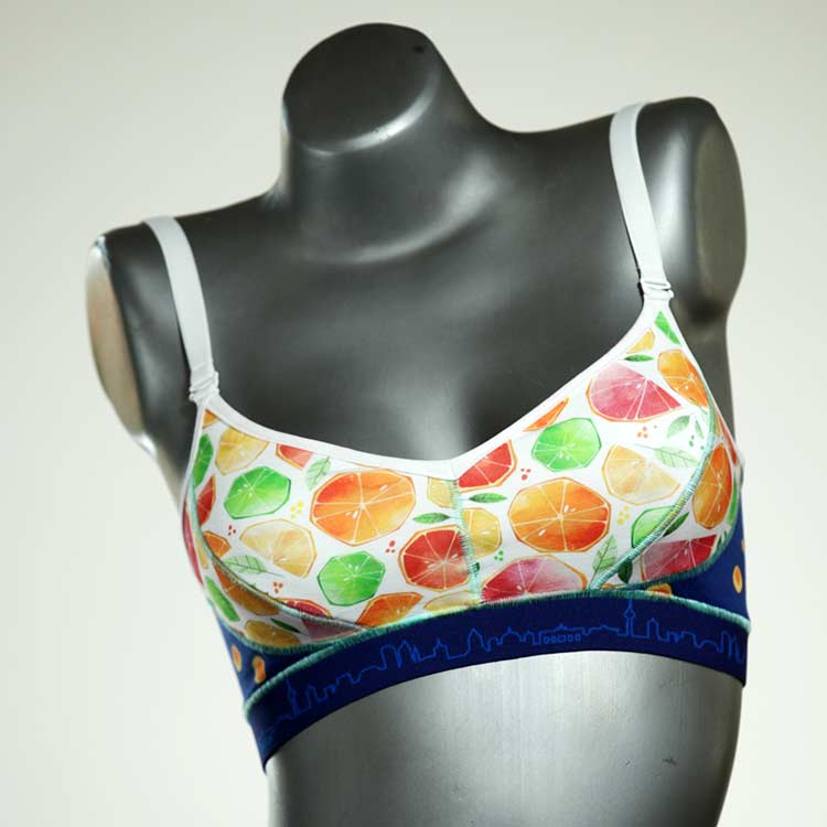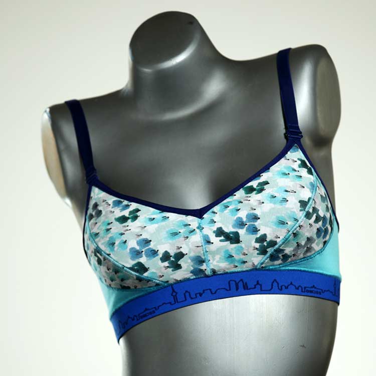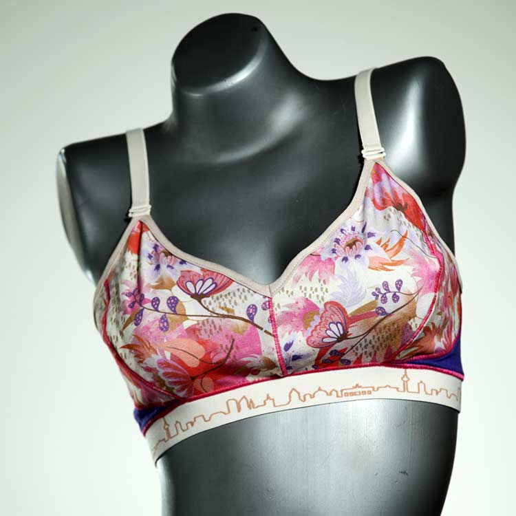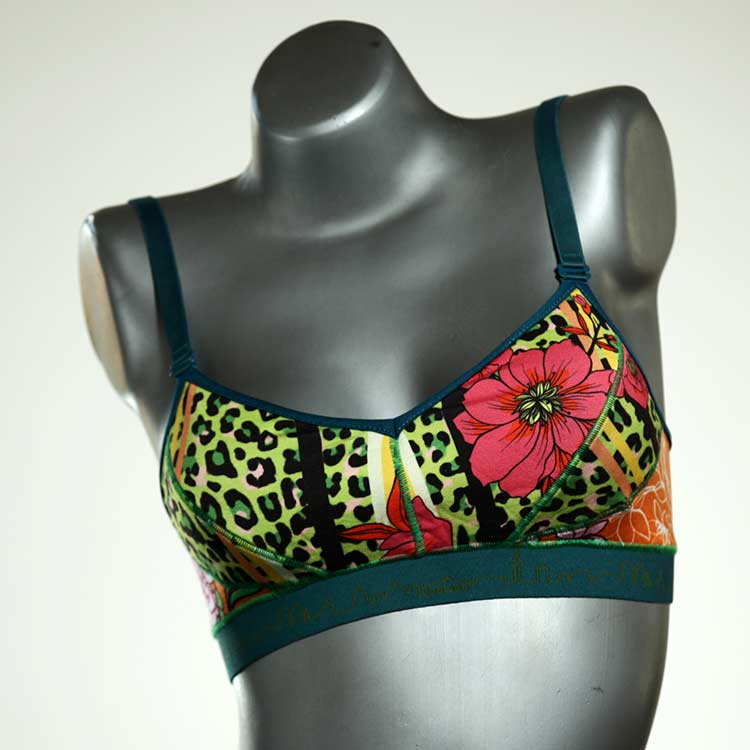 Diesen schönen und bequemen BH aus GOTS-zertifizierter Baumwolle gibt es nur einmal und er wurde in unserem Atelier in Berlin für Sie zugeschnitten, entworfen und genäht. Wir erschaffen täglich neue Unterwäsche-Einzelstücke aus weichen kunterbunten Baumwoll-Jerseys.