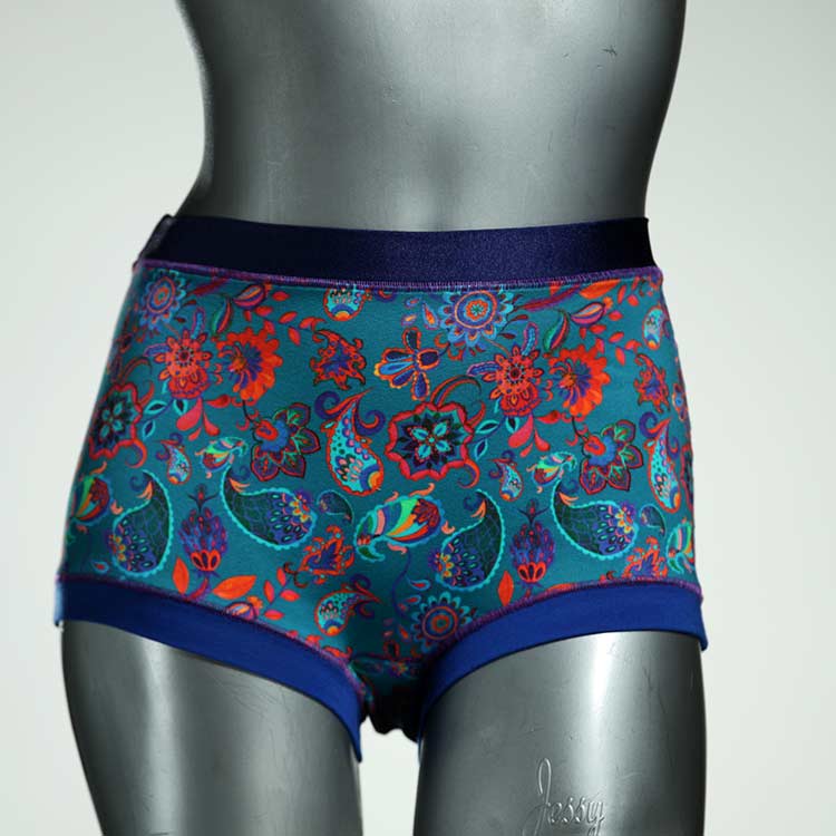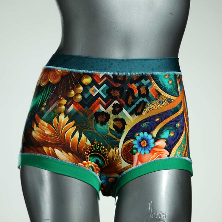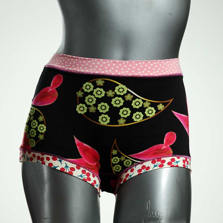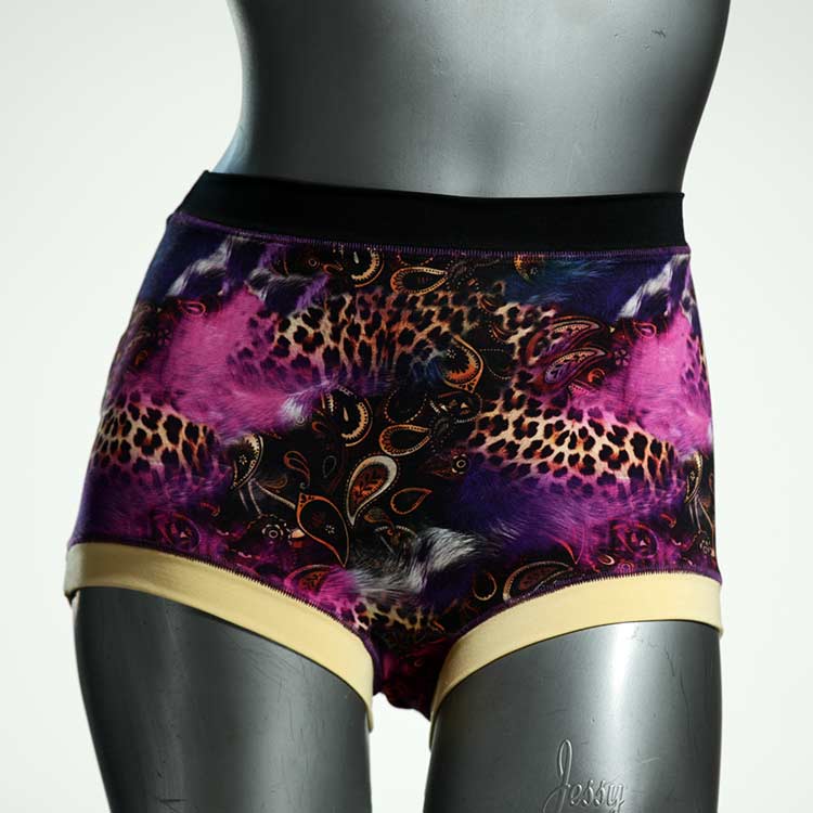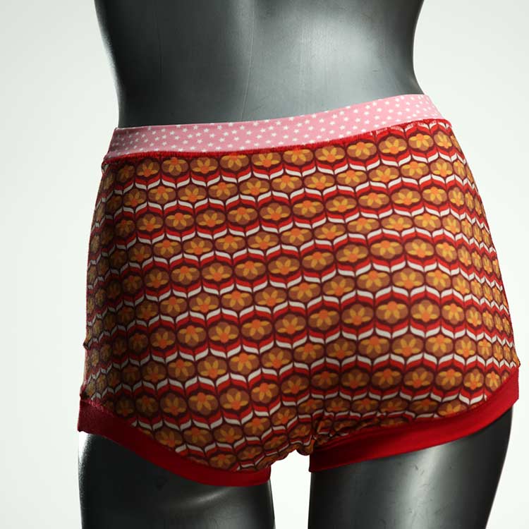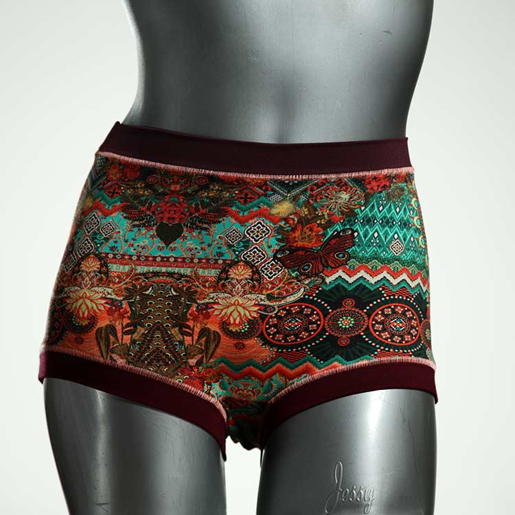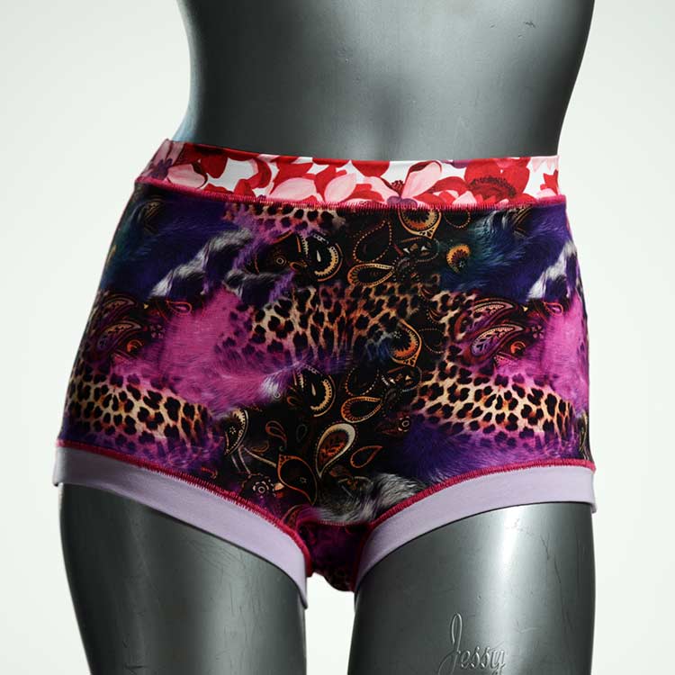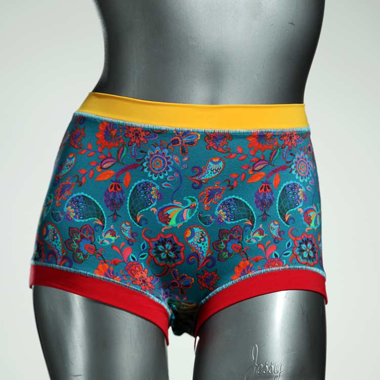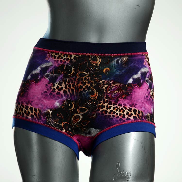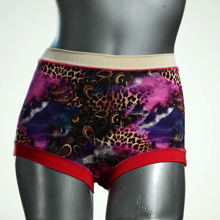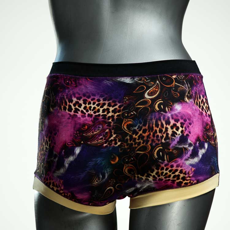 Diese besonders hoch geschnittenen Hotpants sind sehr beliebt. Echte Unikate aus Handarbeit, made in Berlin. Aus weichem und elastischem Bio-Baumwolljersey ohne klemmende Gummis. Bedeckt den Po vollständig und klemmt sich nirgends ein. Hautfreundlich und sehr bequem.