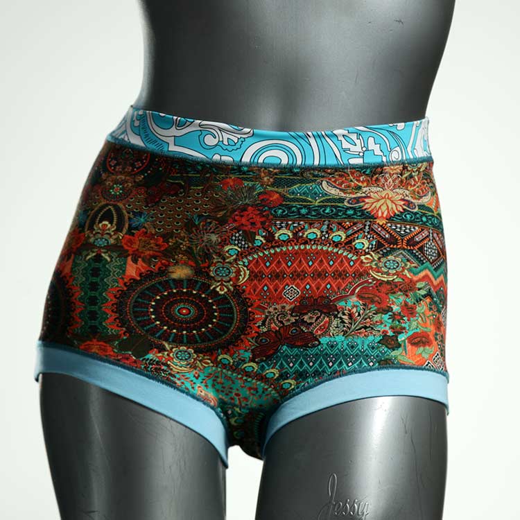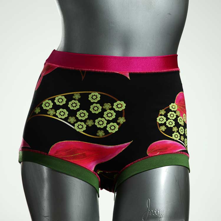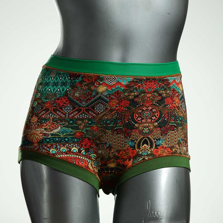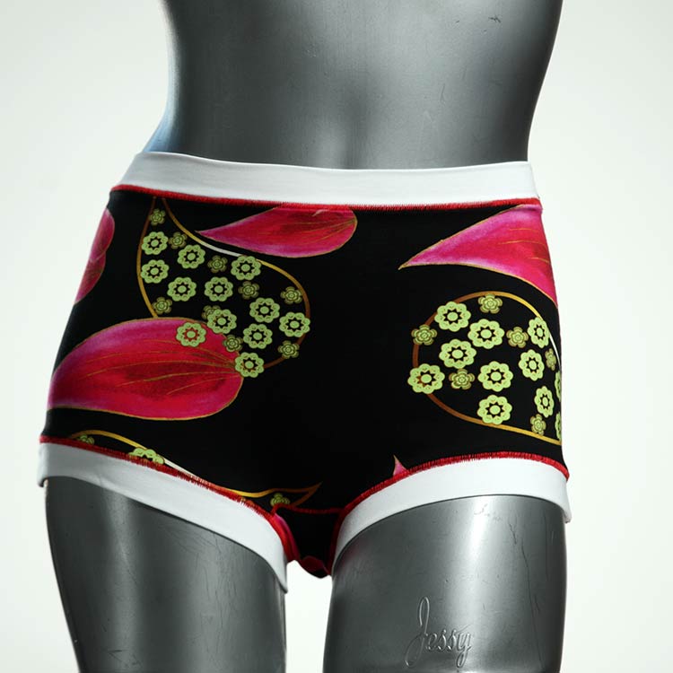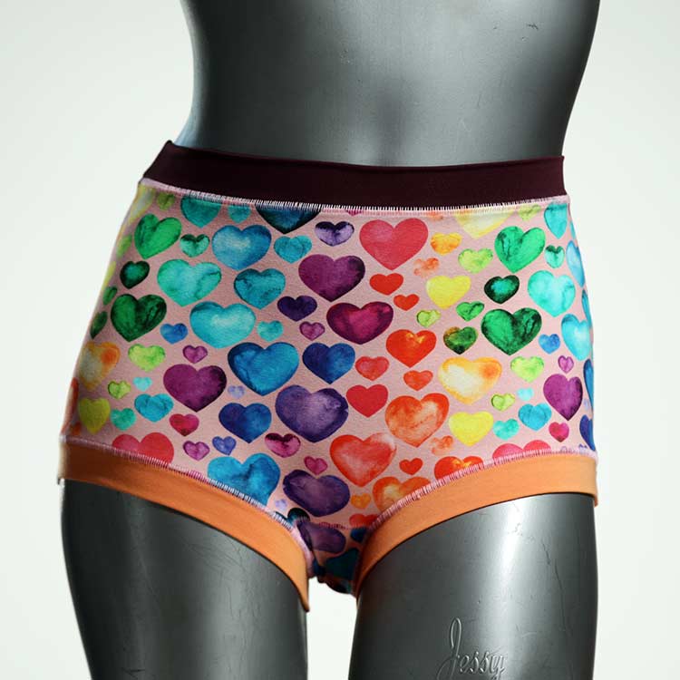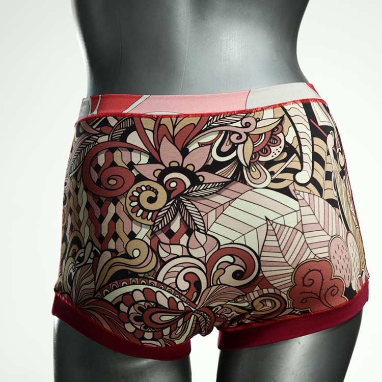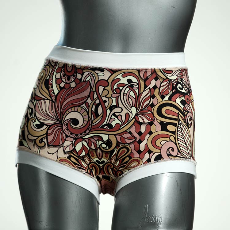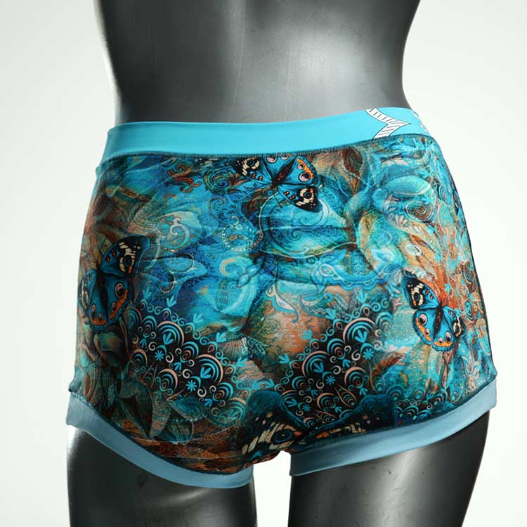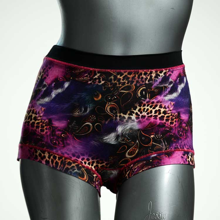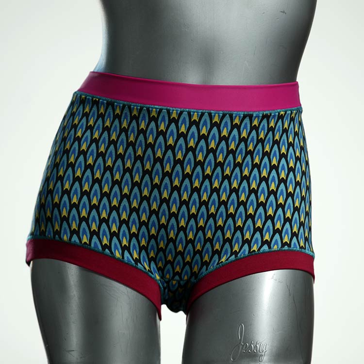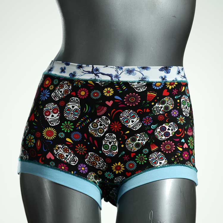 Diese besonders hoch geschnittenen Hotpants sind sehr beliebt. Echte Unikate aus Handarbeit, made in Berlin. Aus weichem und elastischem Bio-Baumwolljersey ohne klemmende Gummis. Bedeckt den Po vollständig und klemmt sich nirgends ein. Hautfreundlich und sehr bequem.