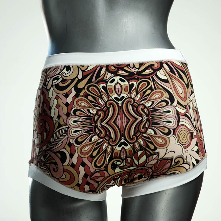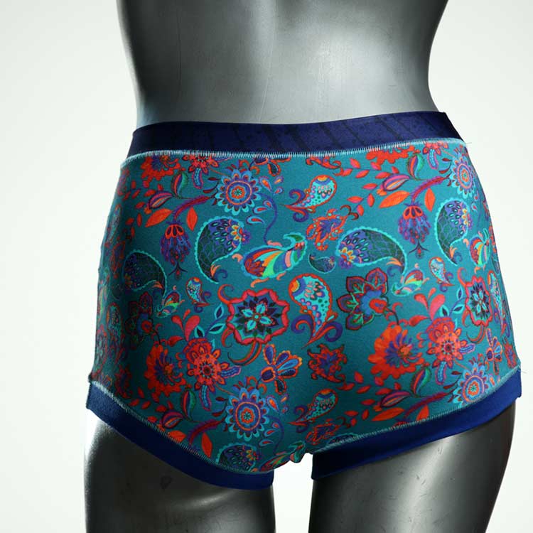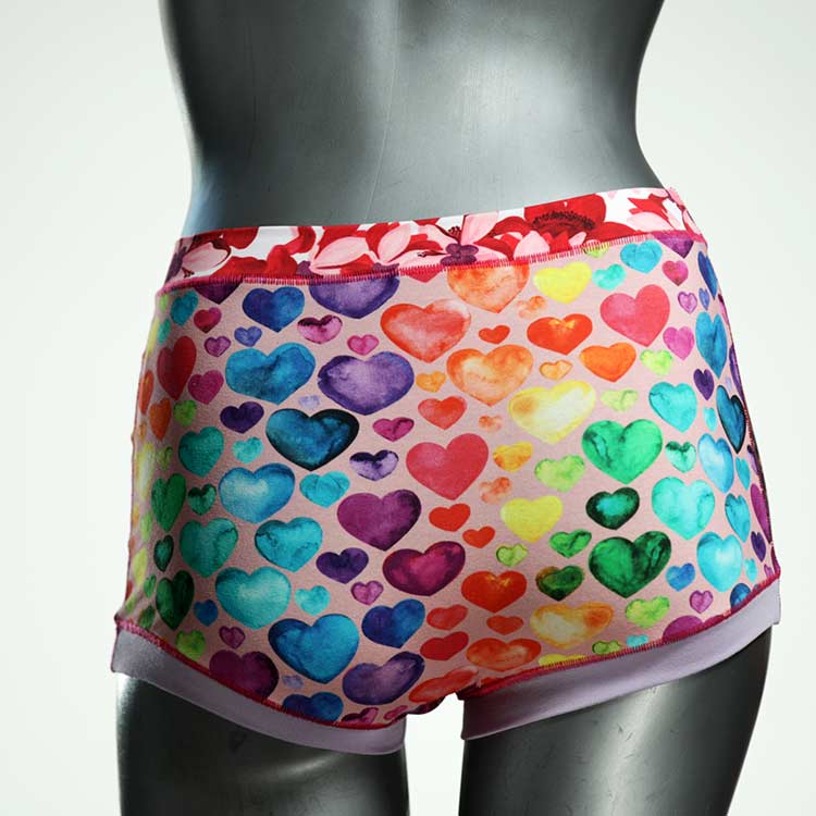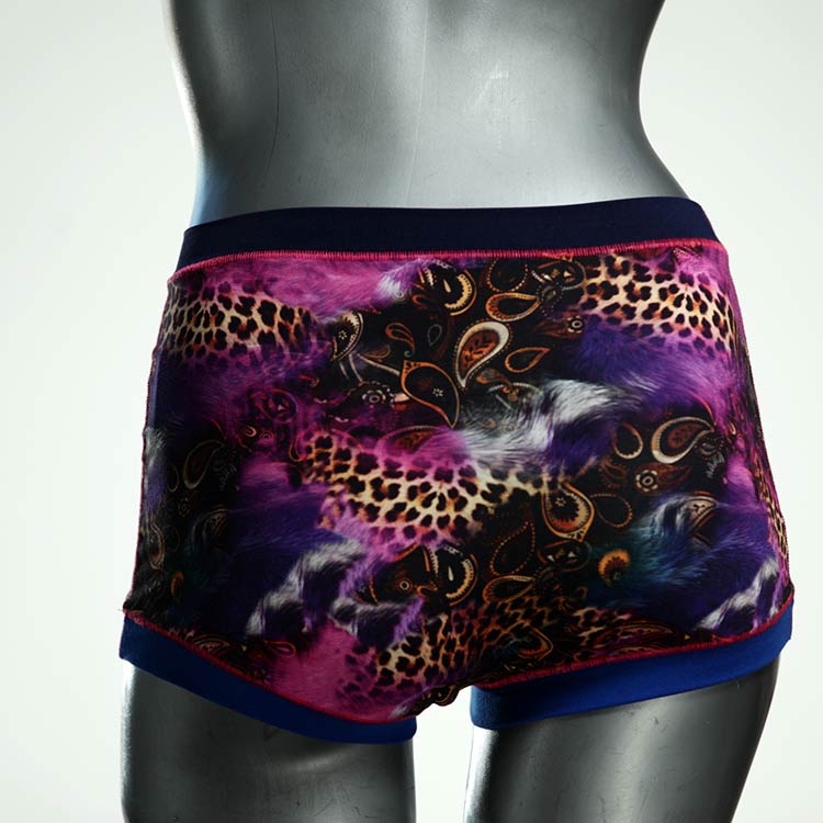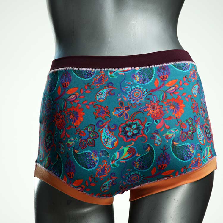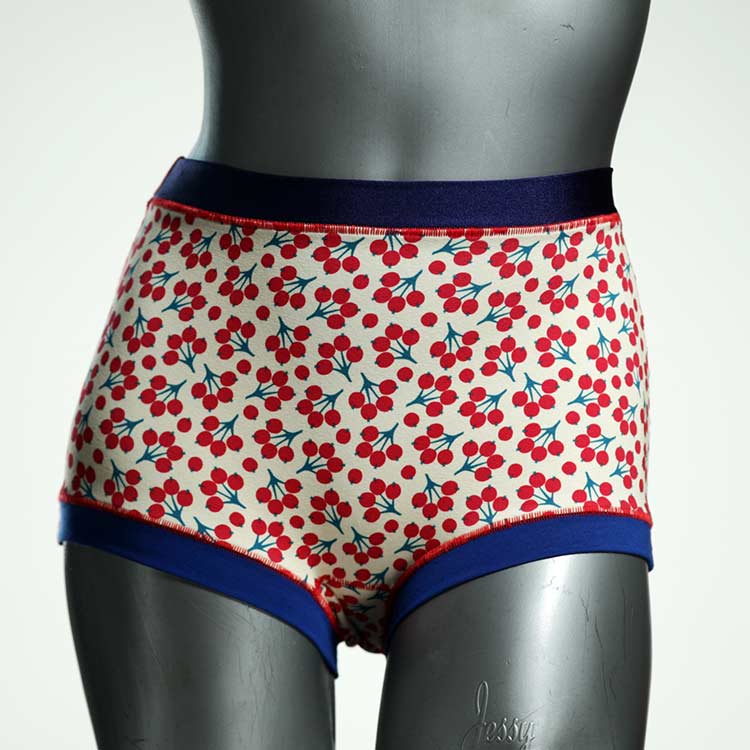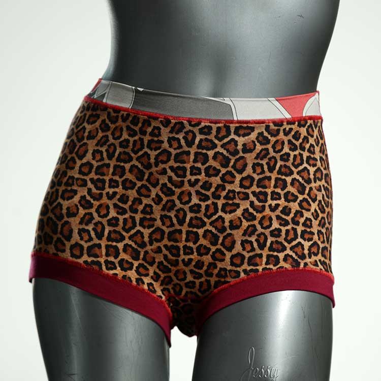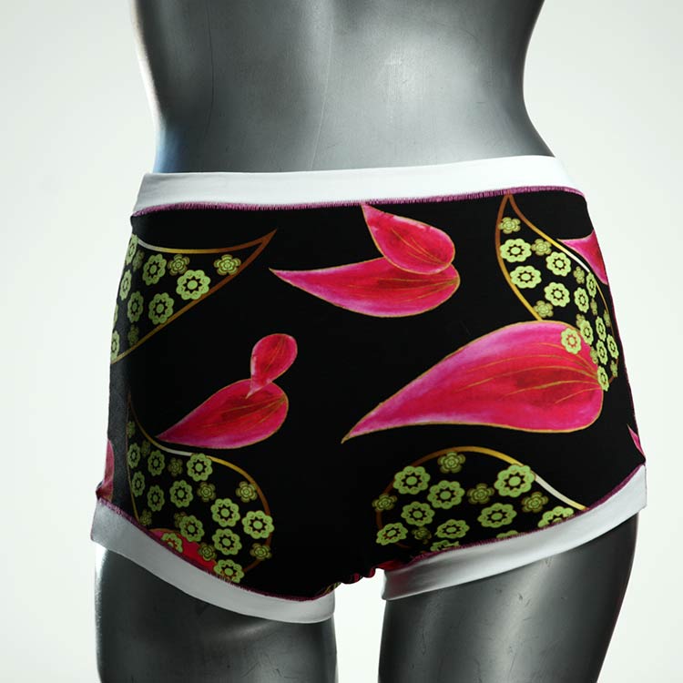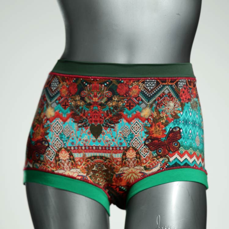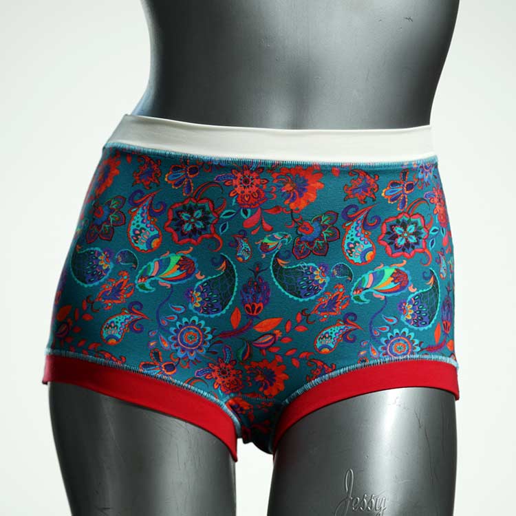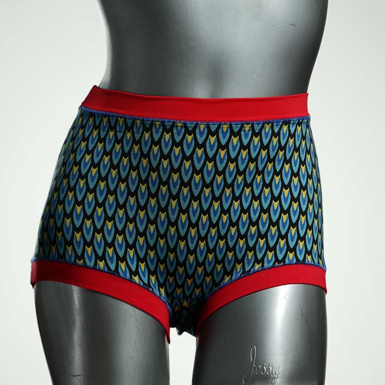 Diese besonders hoch geschnittenen Hotpants sind sehr beliebt. Echte Unikate aus Handarbeit, made in Berlin. Aus weichem und elastischem Bio-Baumwolljersey ohne klemmende Gummis. Bedeckt den Po vollständig und klemmt sich nirgends ein. Hautfreundlich und sehr bequem.