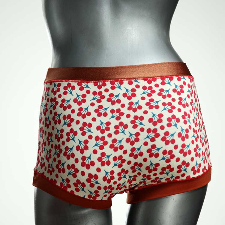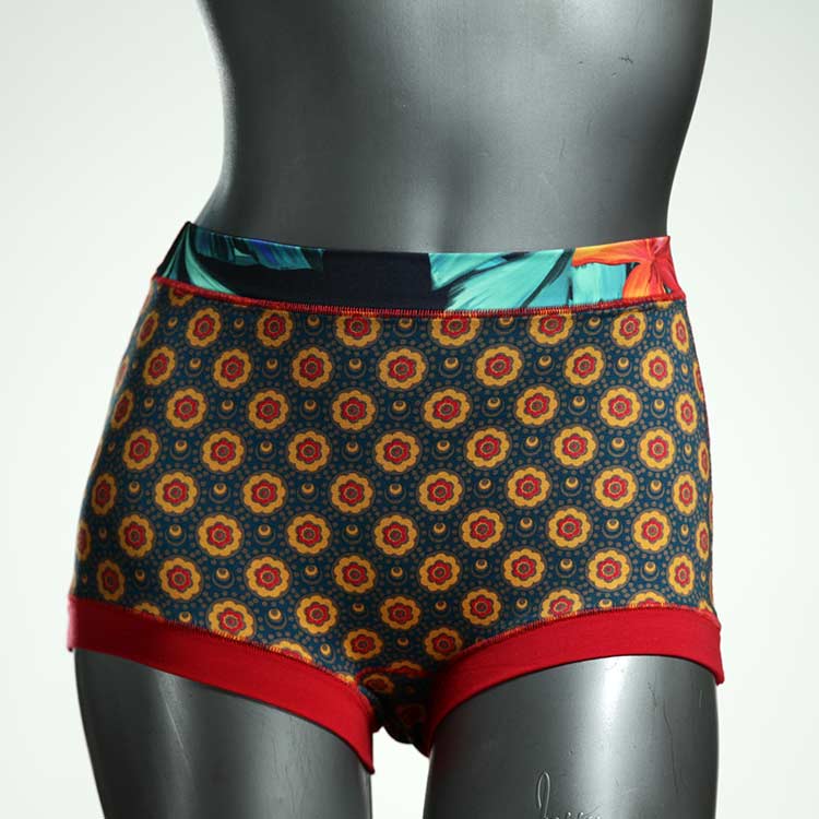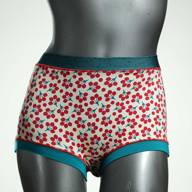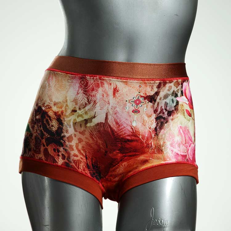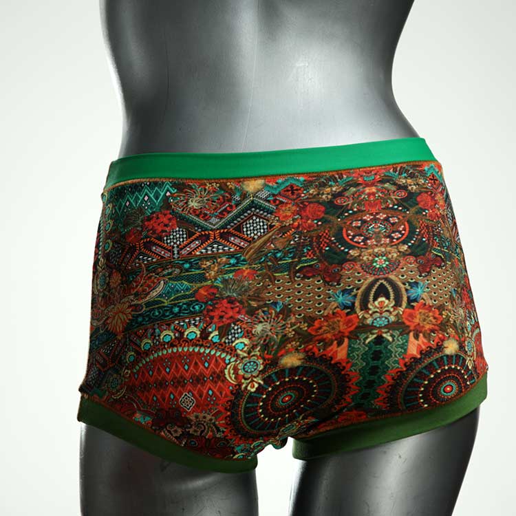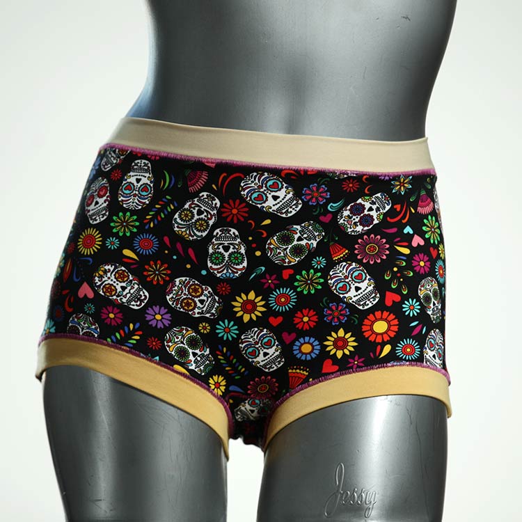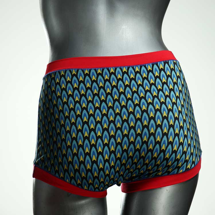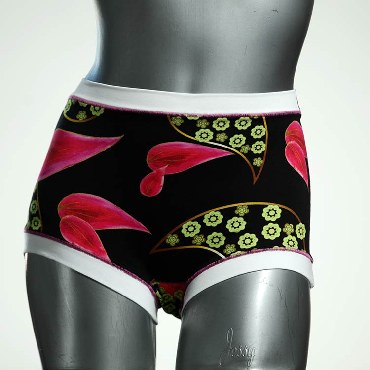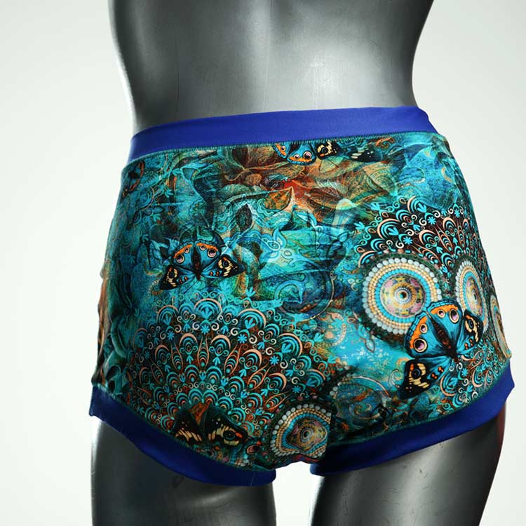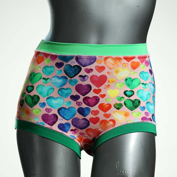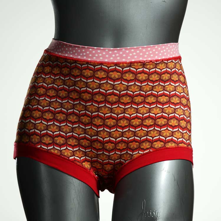 Diese besonders hoch geschnittenen Hotpants sind sehr beliebt. Echte Unikate aus Handarbeit, made in Berlin. Aus weichem und elastischem Bio-Baumwolljersey ohne klemmende Gummis. Bedeckt den Po vollständig und klemmt sich nirgends ein. Hautfreundlich und sehr bequem.