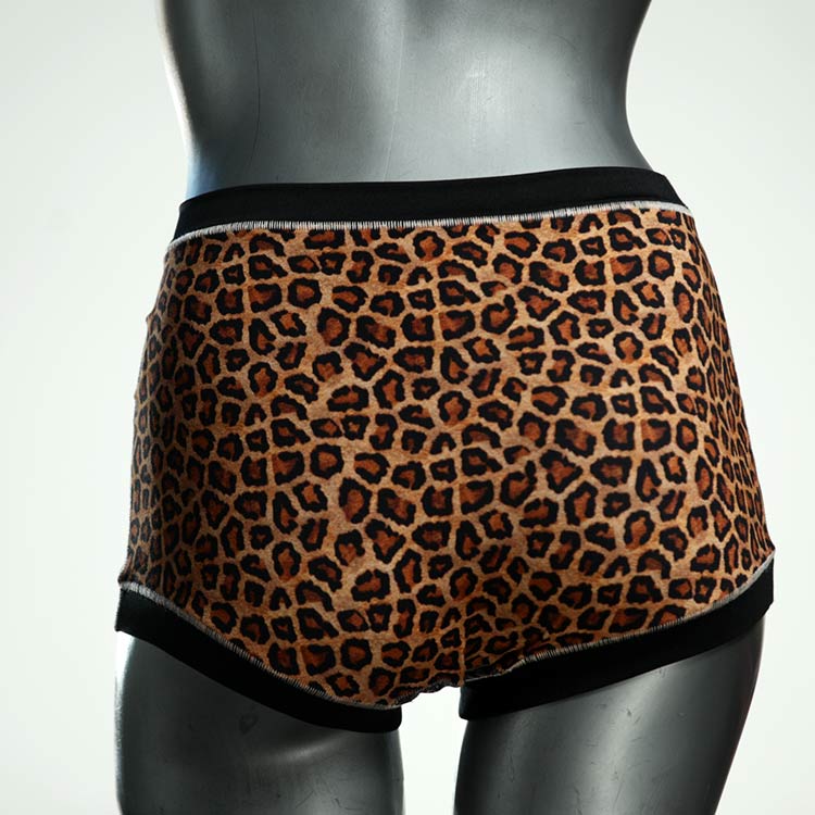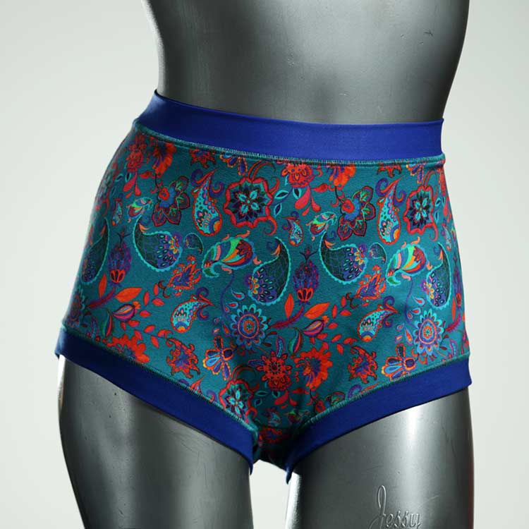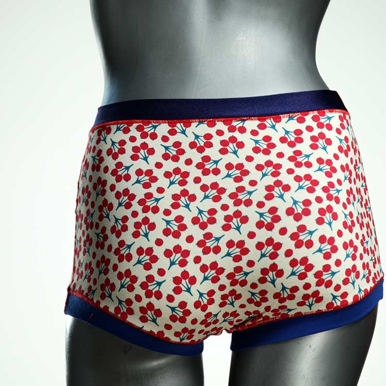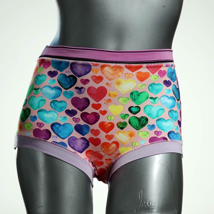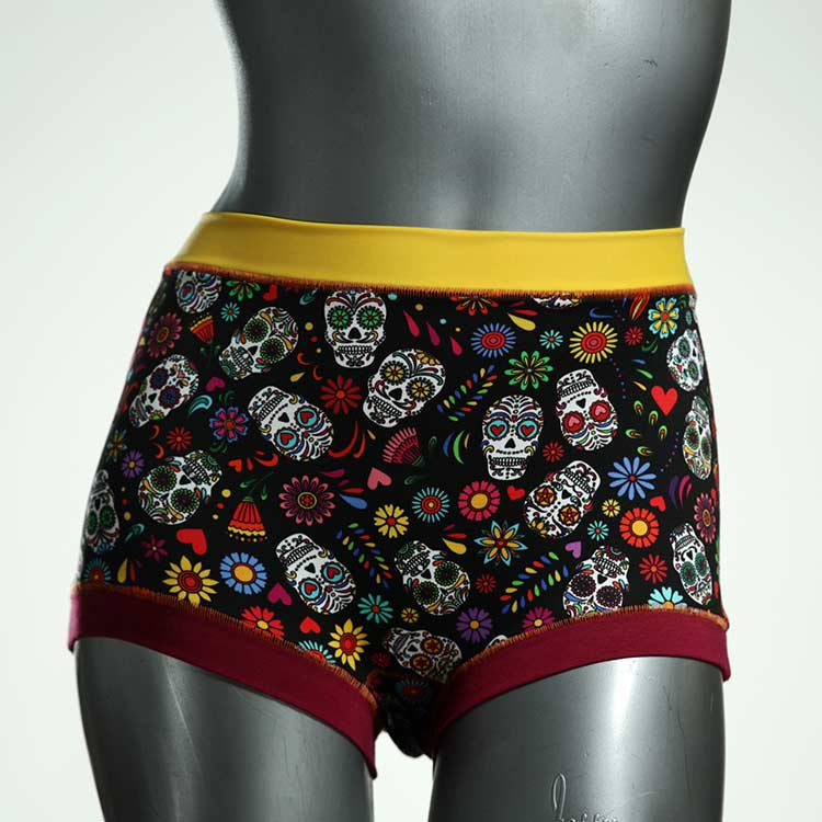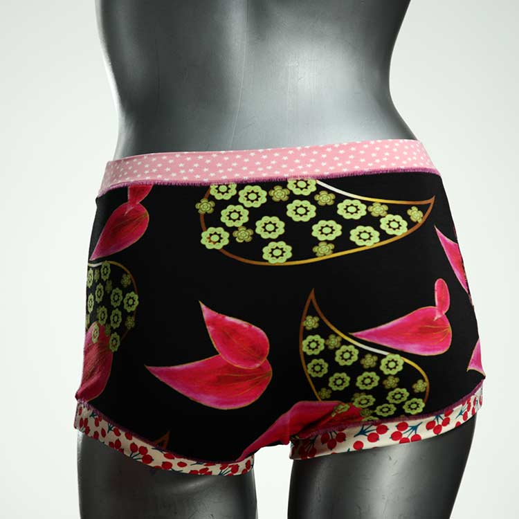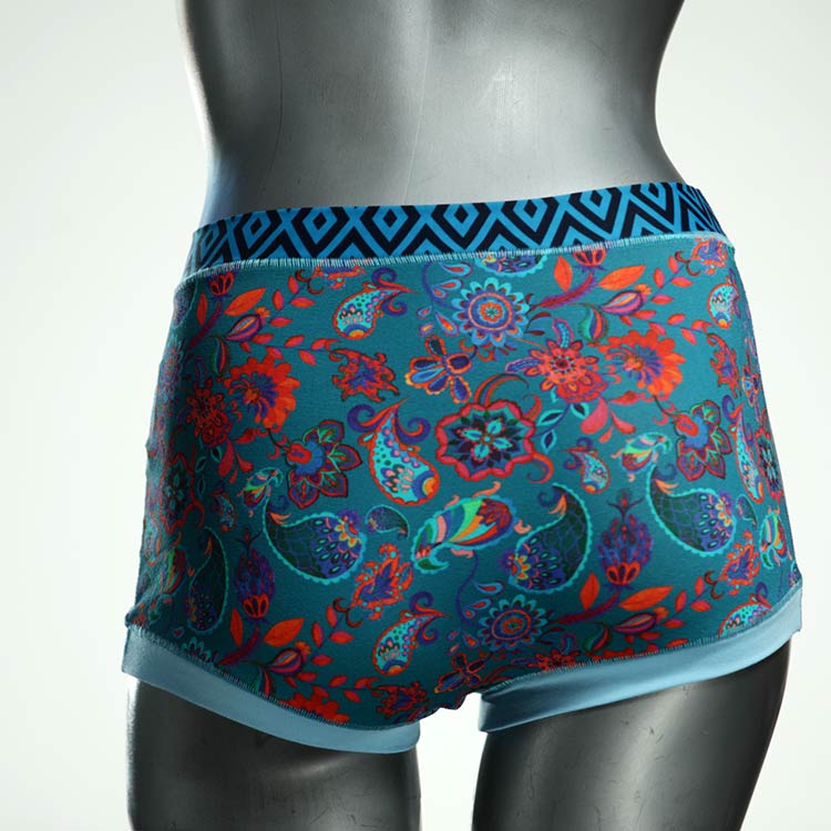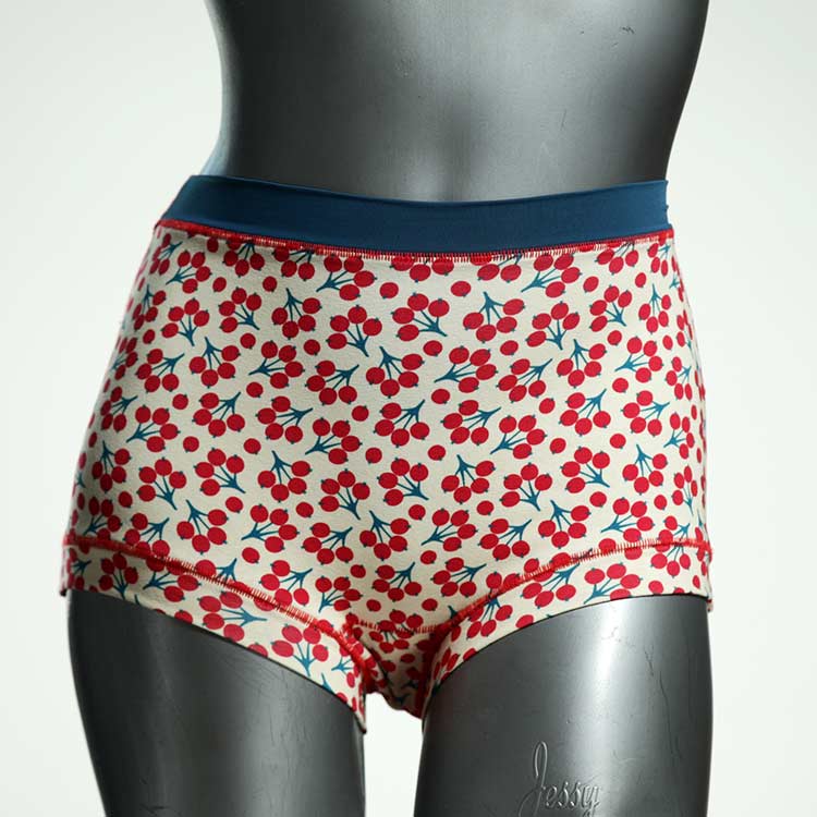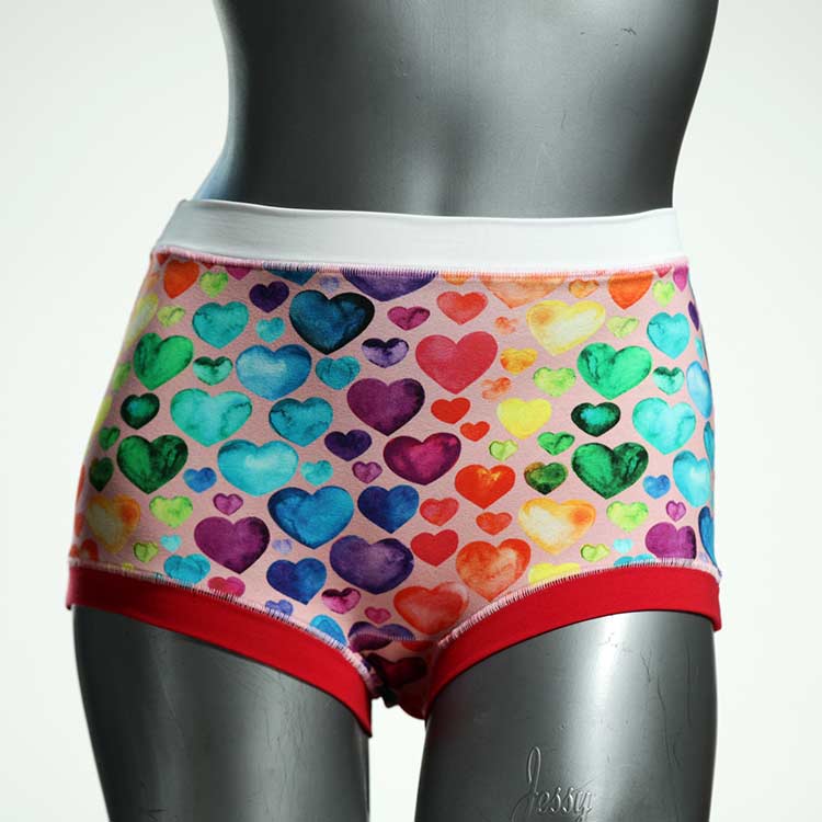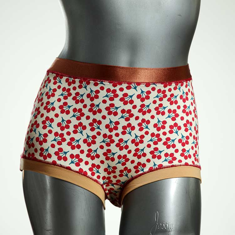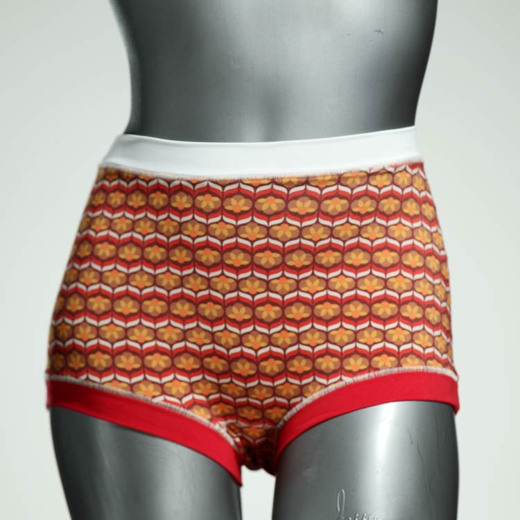 Diese besonders hoch geschnittenen Hotpants sind sehr beliebt. Echte Unikate aus Handarbeit, made in Berlin. Aus weichem und elastischem Bio-Baumwolljersey ohne klemmende Gummis. Bedeckt den Po vollständig und klemmt sich nirgends ein. Hautfreundlich und sehr bequem.