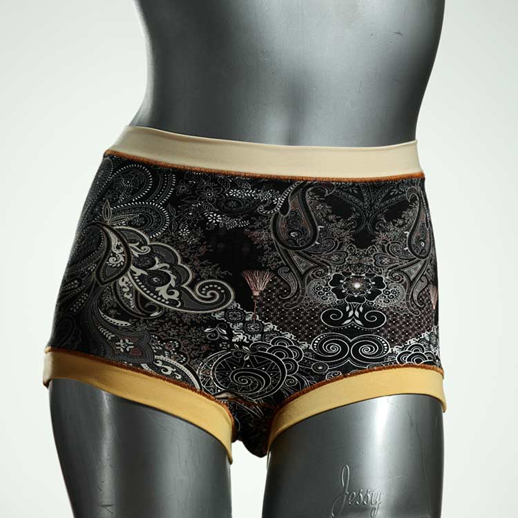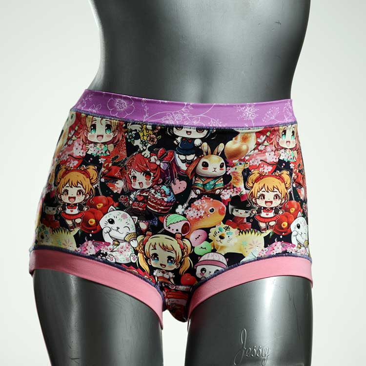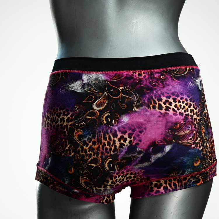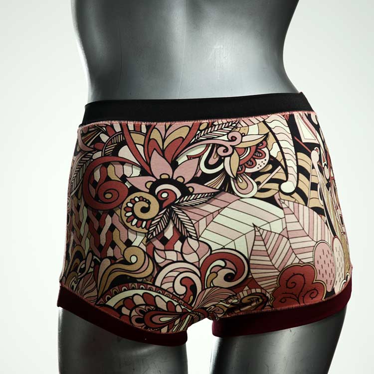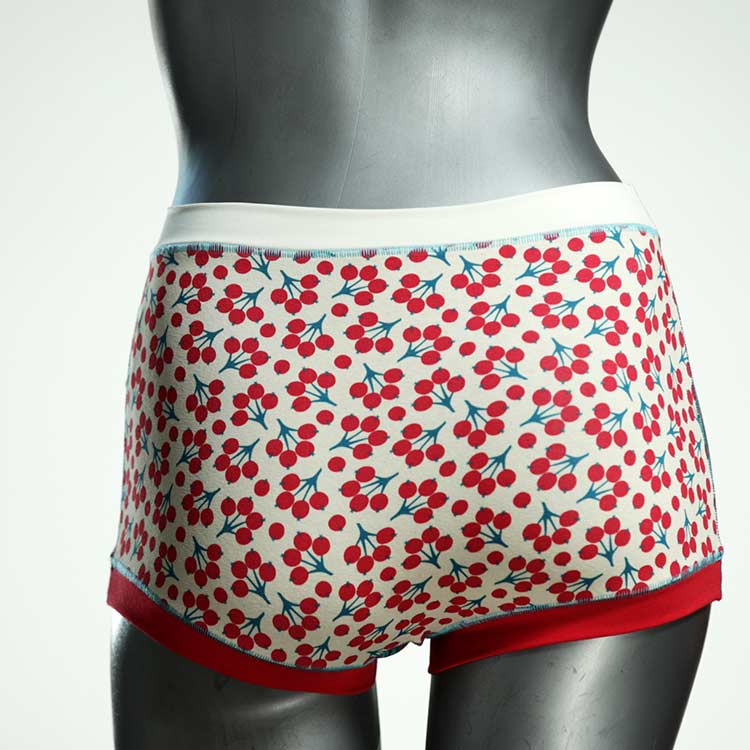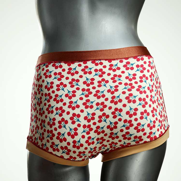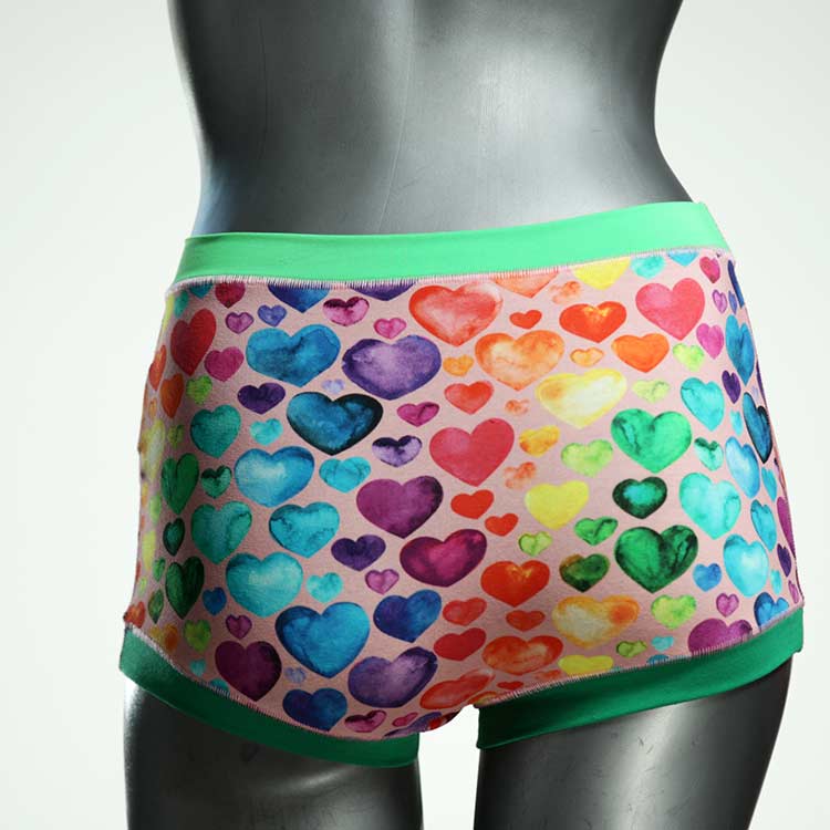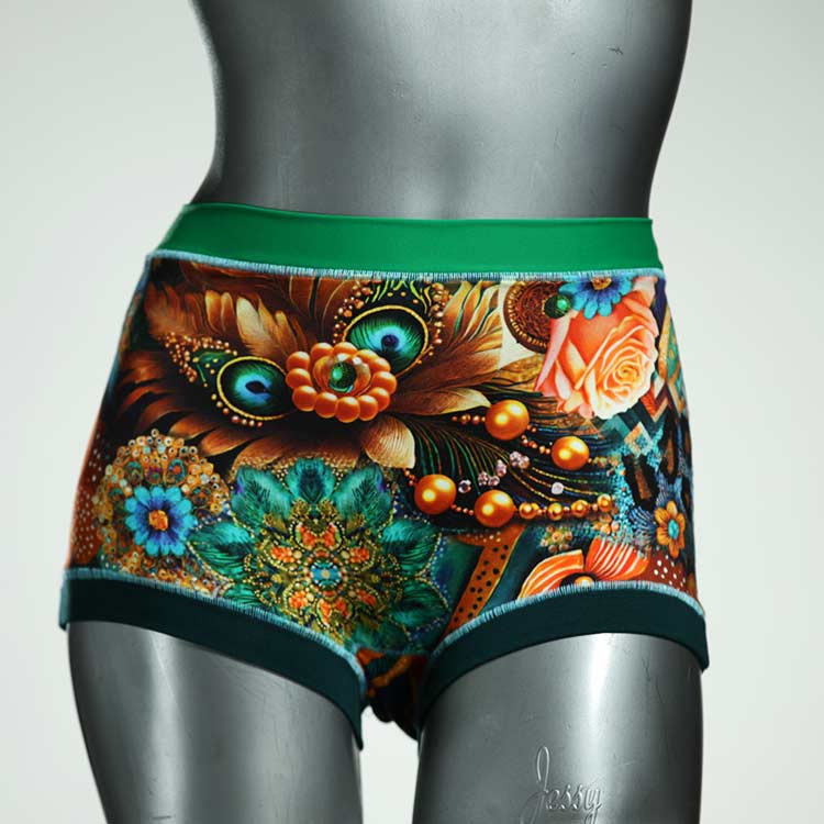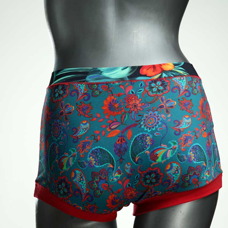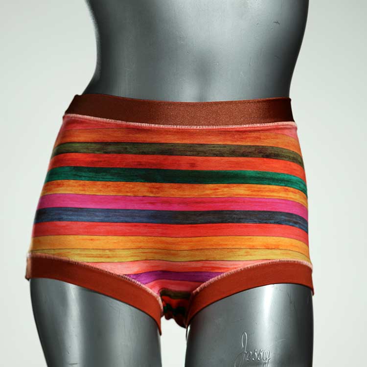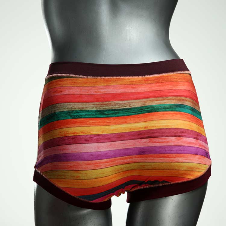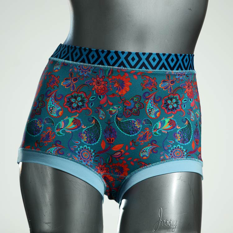 Diese besonders hoch geschnittenen Hotpants sind sehr beliebt. Echte Unikate aus Handarbeit, made in Berlin. Aus weichem und elastischem Bio-Baumwolljersey ohne klemmende Gummis. Bedeckt den Po vollständig und klemmt sich nirgends ein. Hautfreundlich und sehr bequem.