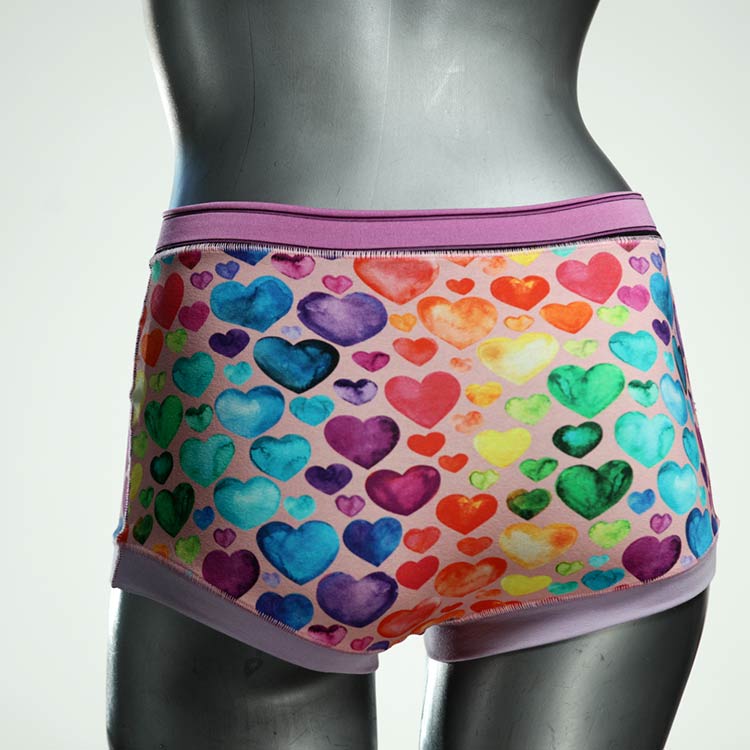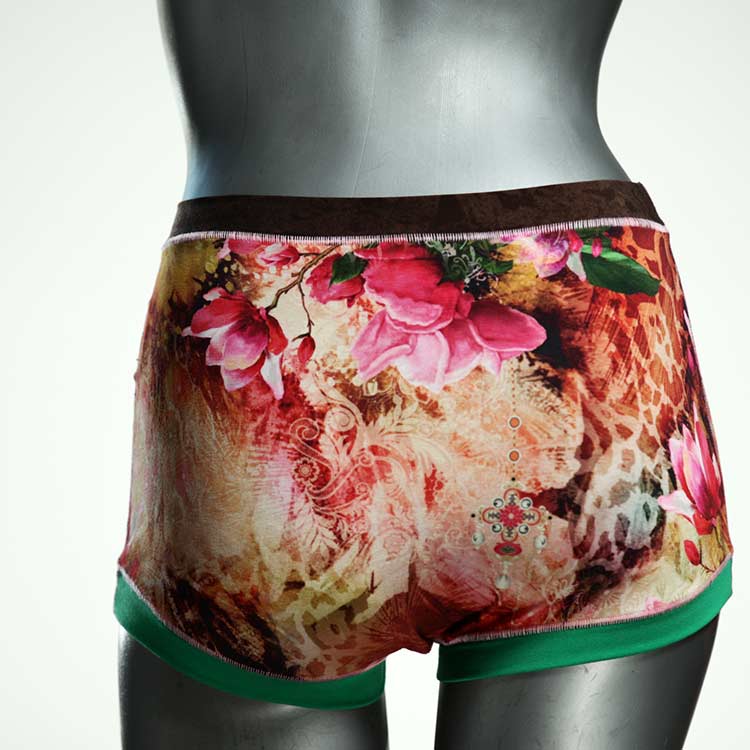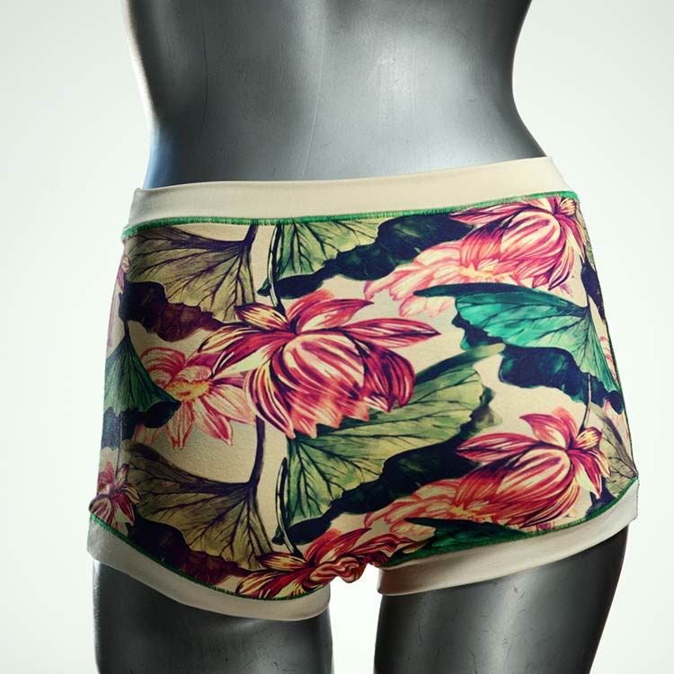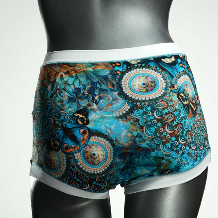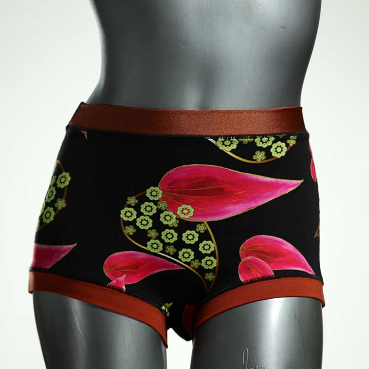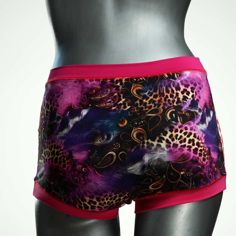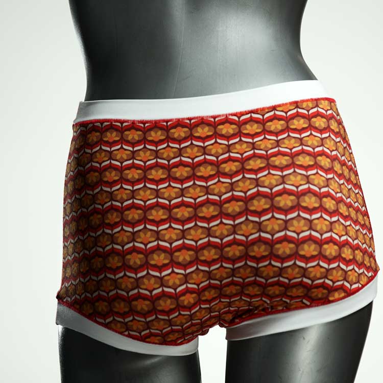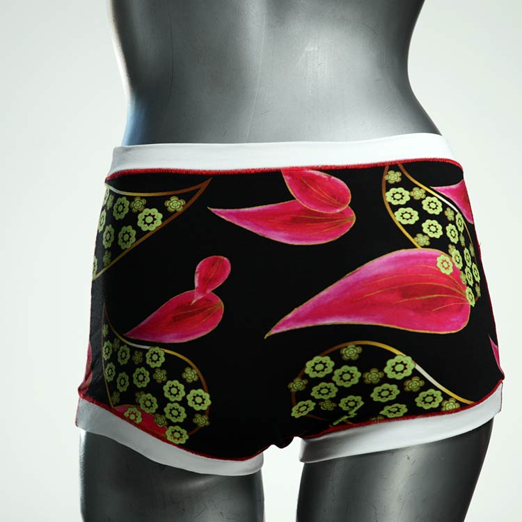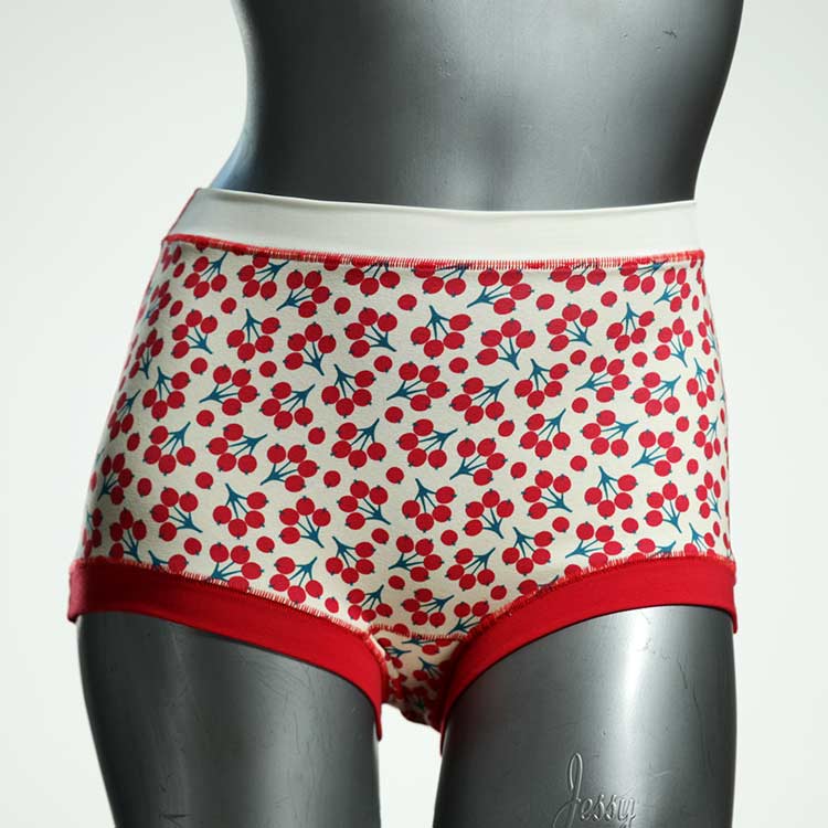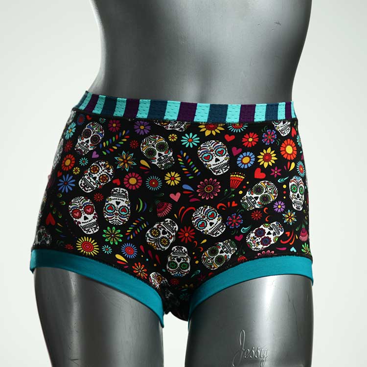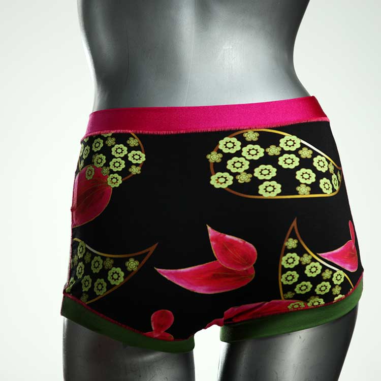 Diese besonders hoch geschnittenen Hotpants sind sehr beliebt. Echte Unikate aus Handarbeit, made in Berlin. Aus weichem und elastischem Bio-Baumwolljersey ohne klemmende Gummis. Bedeckt den Po vollständig und klemmt sich nirgends ein. Hautfreundlich und sehr bequem.