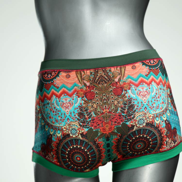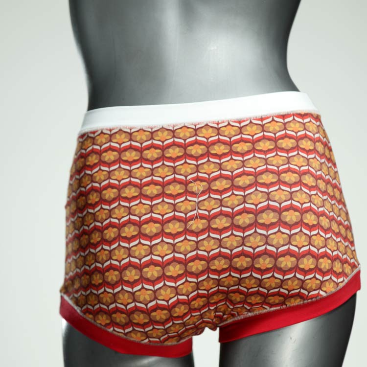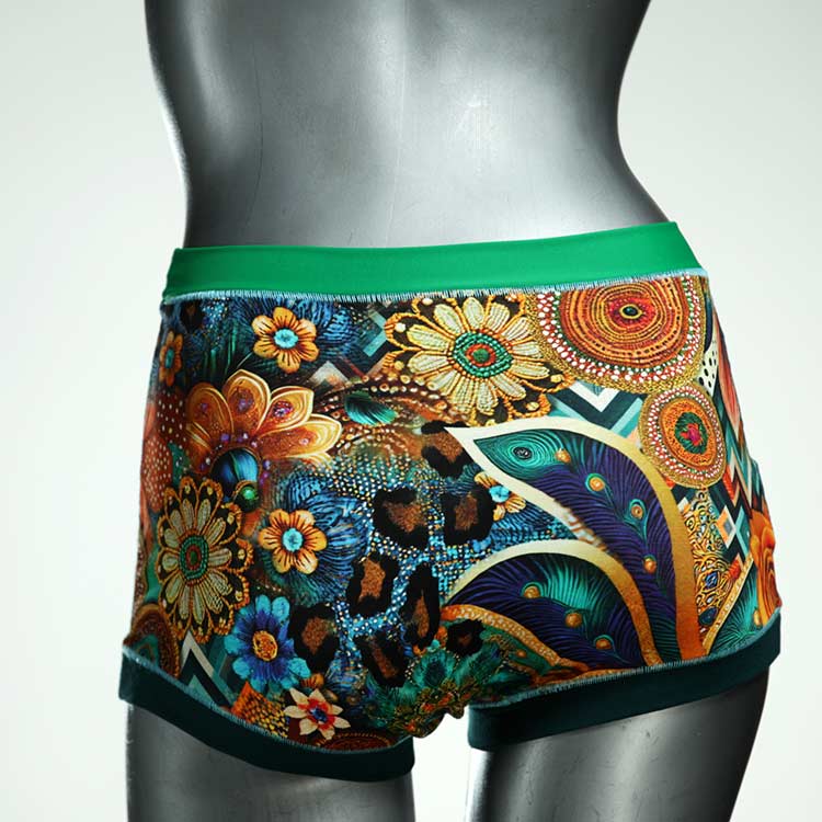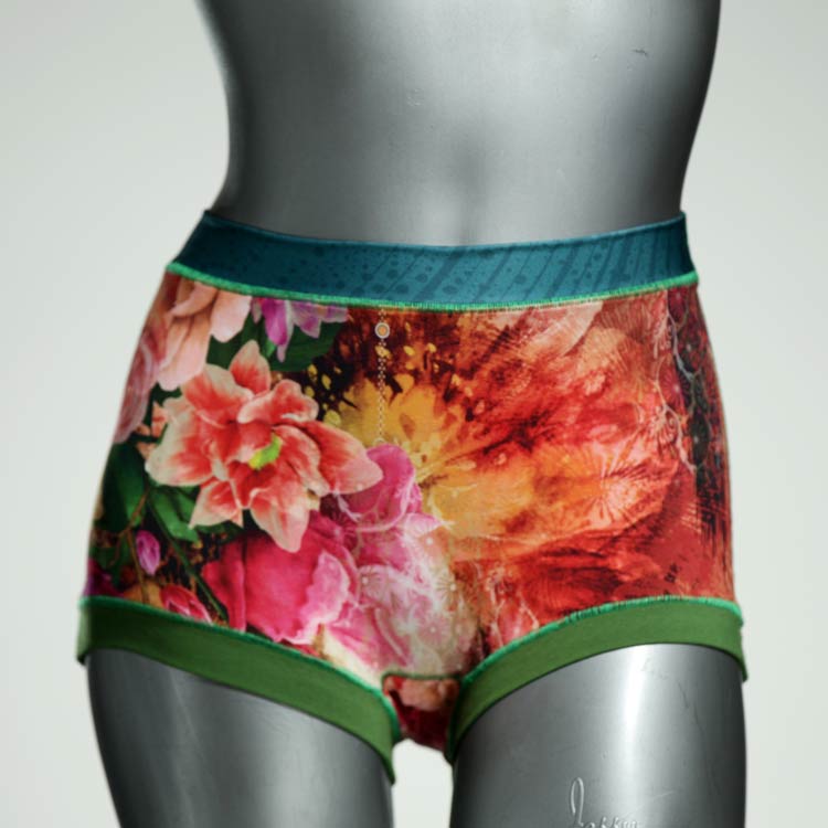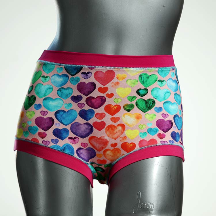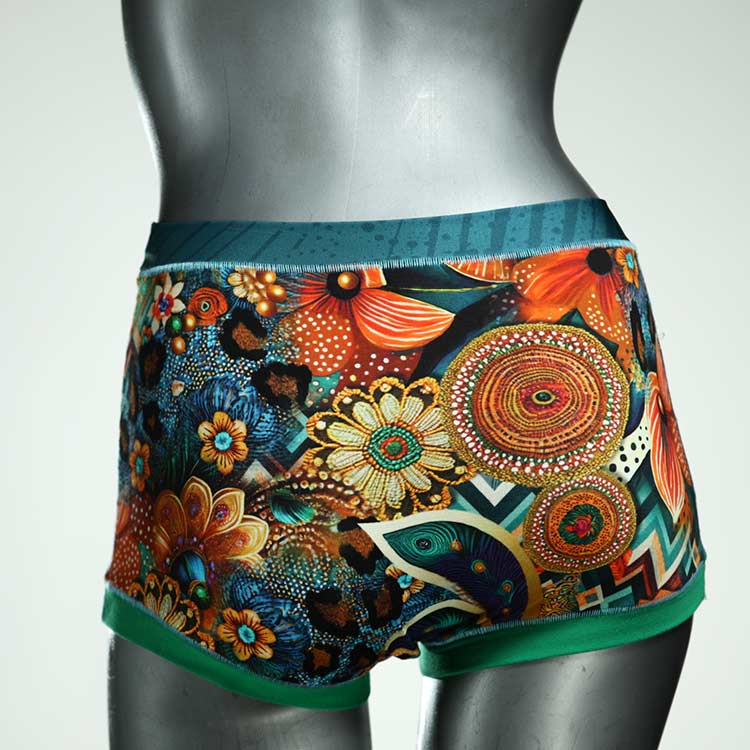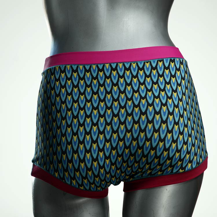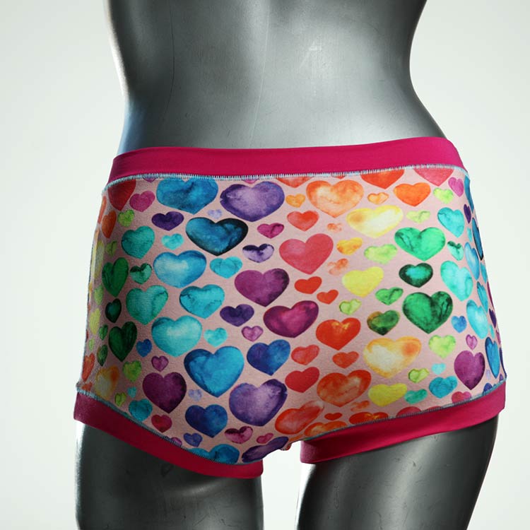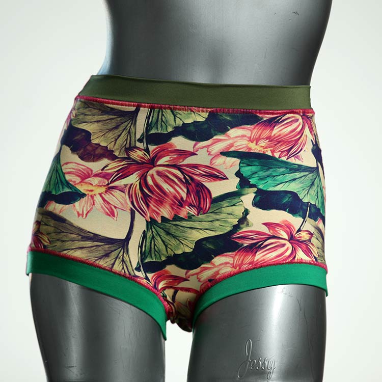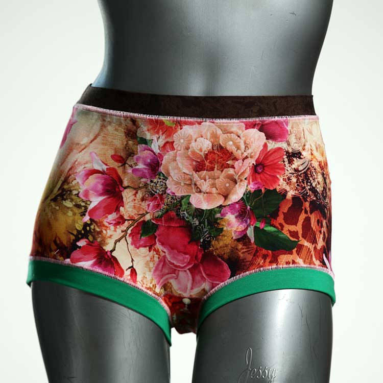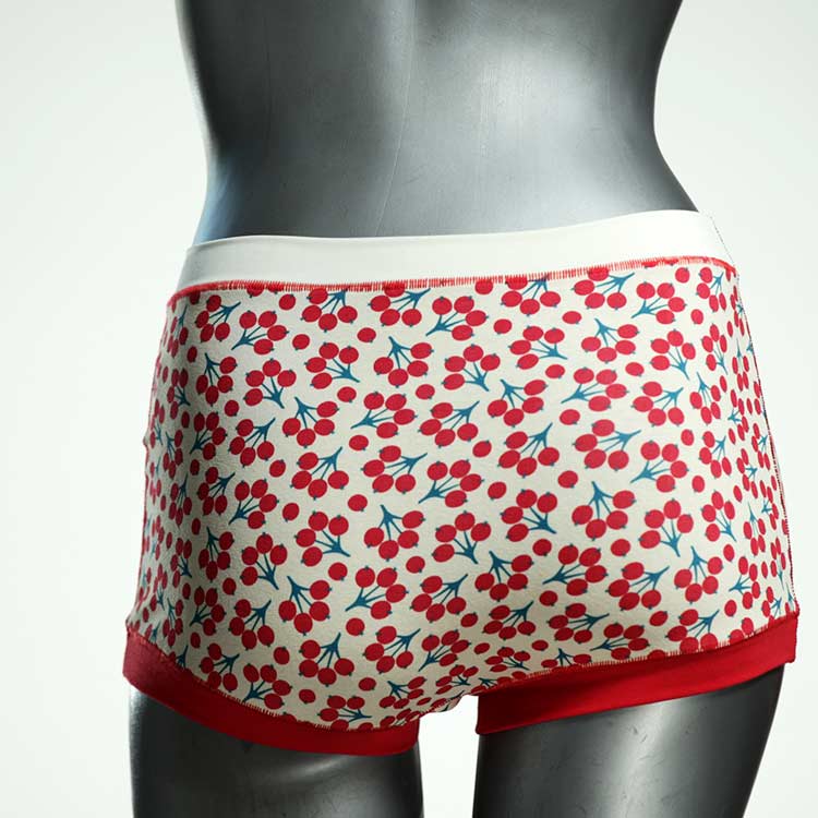 Diese besonders hoch geschnittenen Hotpants sind sehr beliebt. Echte Unikate aus Handarbeit, made in Berlin. Aus weichem und elastischem Bio-Baumwolljersey ohne klemmende Gummis. Bedeckt den Po vollständig und klemmt sich nirgends ein. Hautfreundlich und sehr bequem.