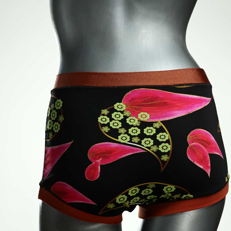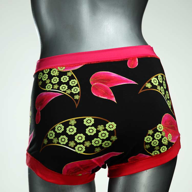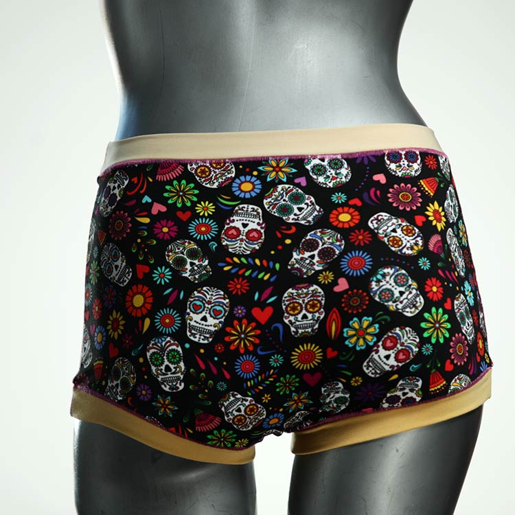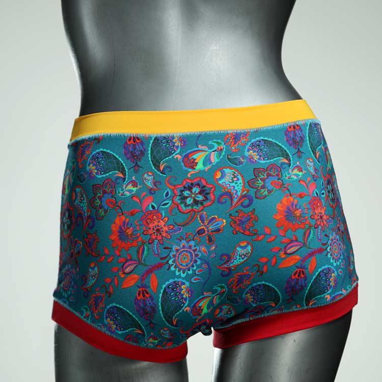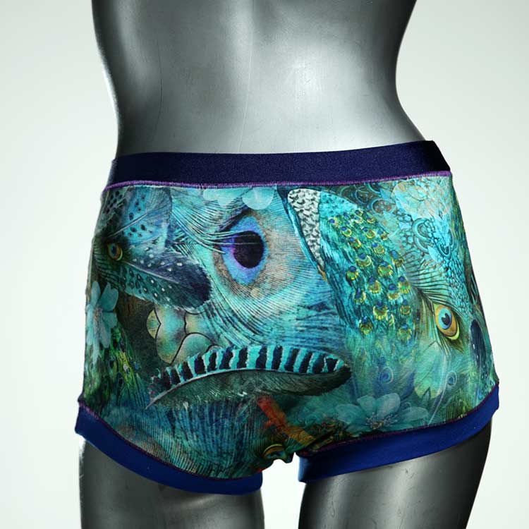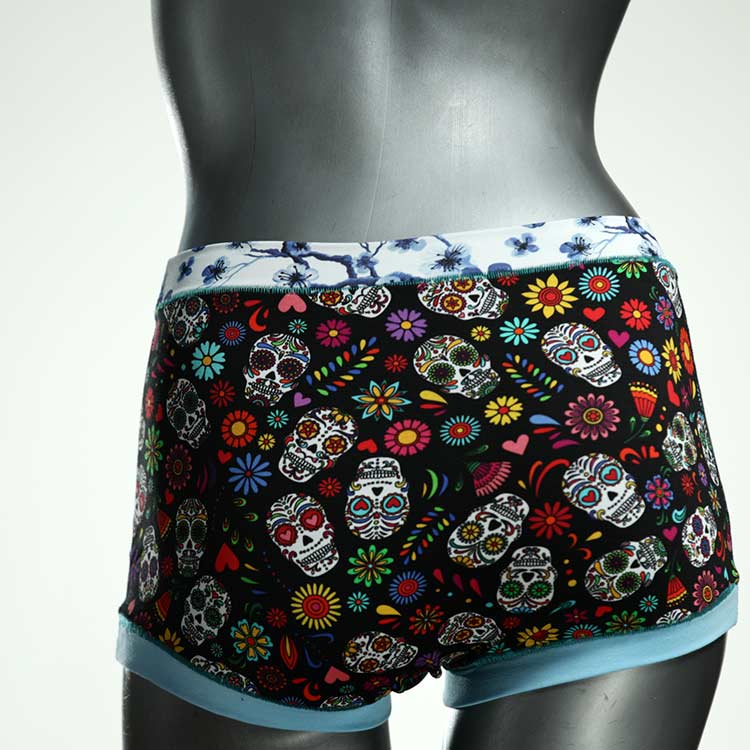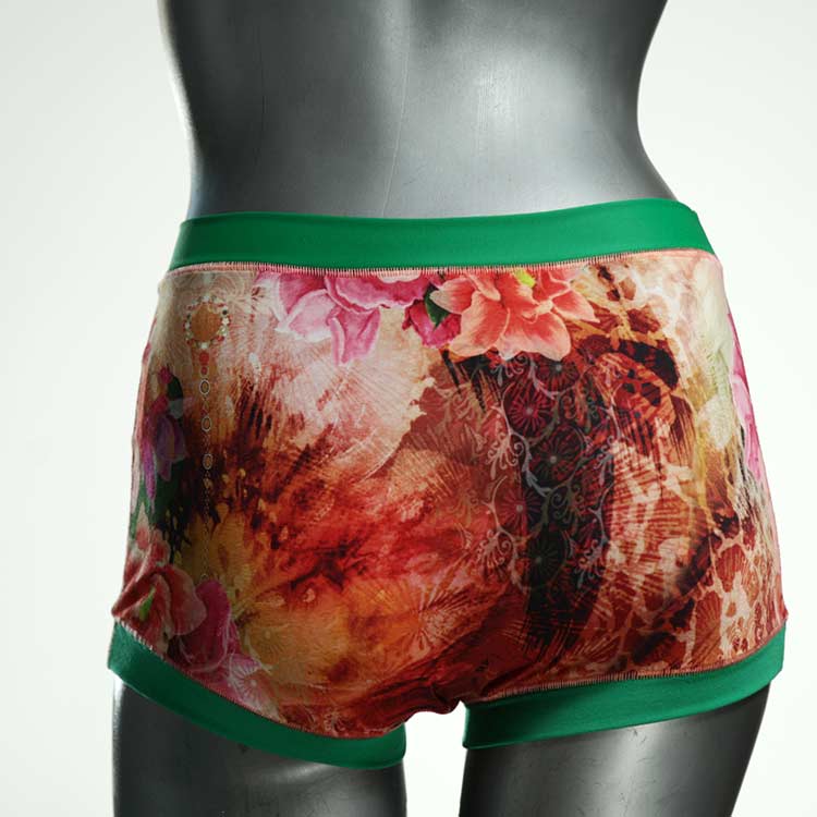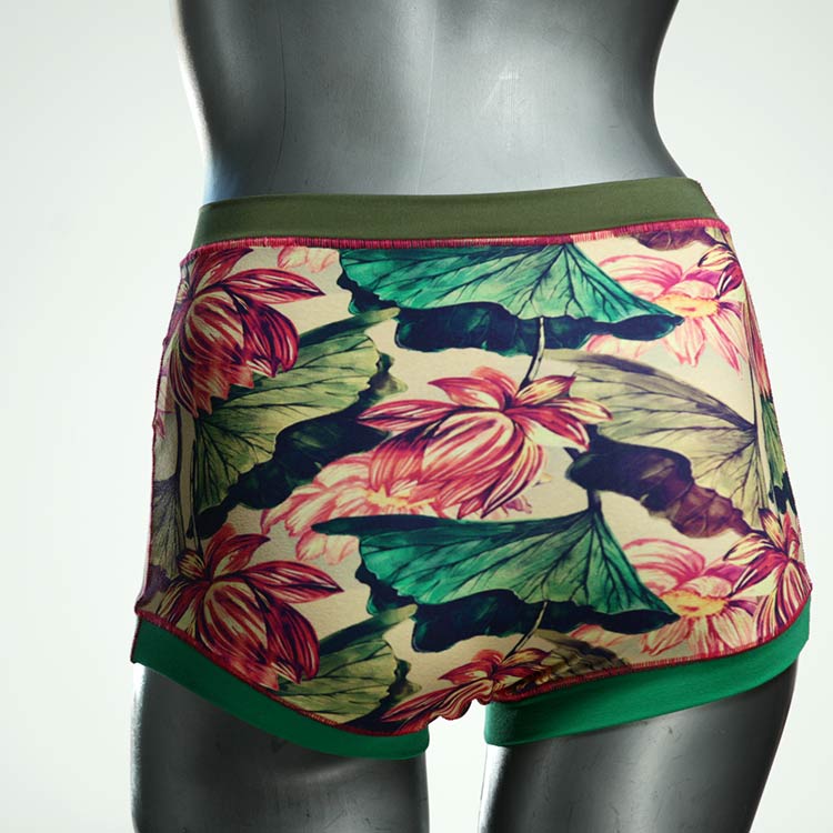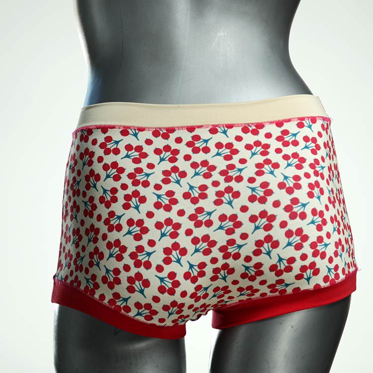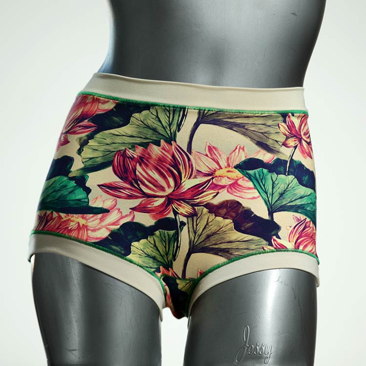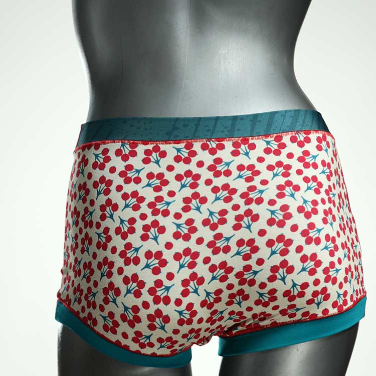 Diese besonders hoch geschnittenen Hotpants sind sehr beliebt. Echte Unikate aus Handarbeit, made in Berlin. Aus weichem und elastischem Bio-Baumwolljersey ohne klemmende Gummis. Bedeckt den Po vollständig und klemmt sich nirgends ein. Hautfreundlich und sehr bequem.