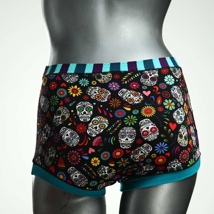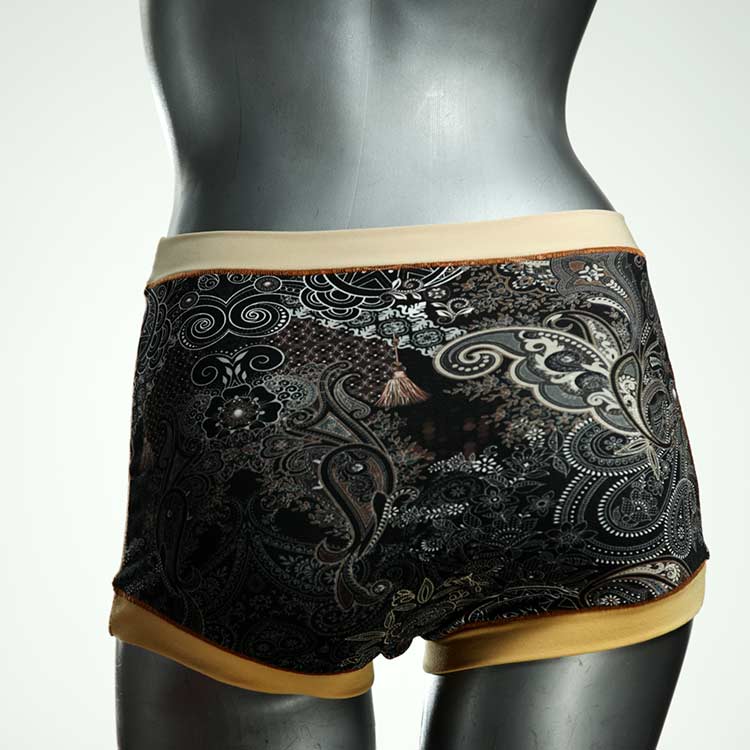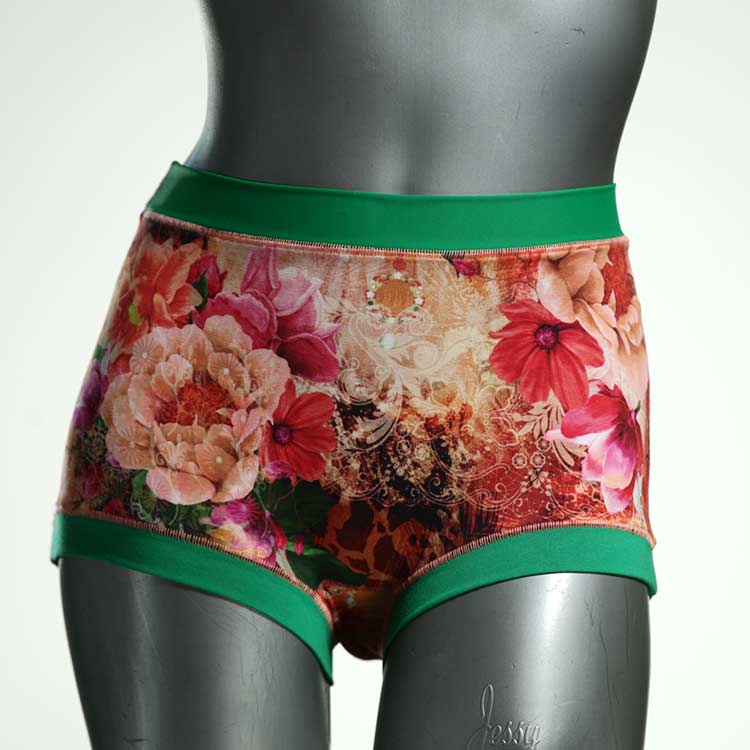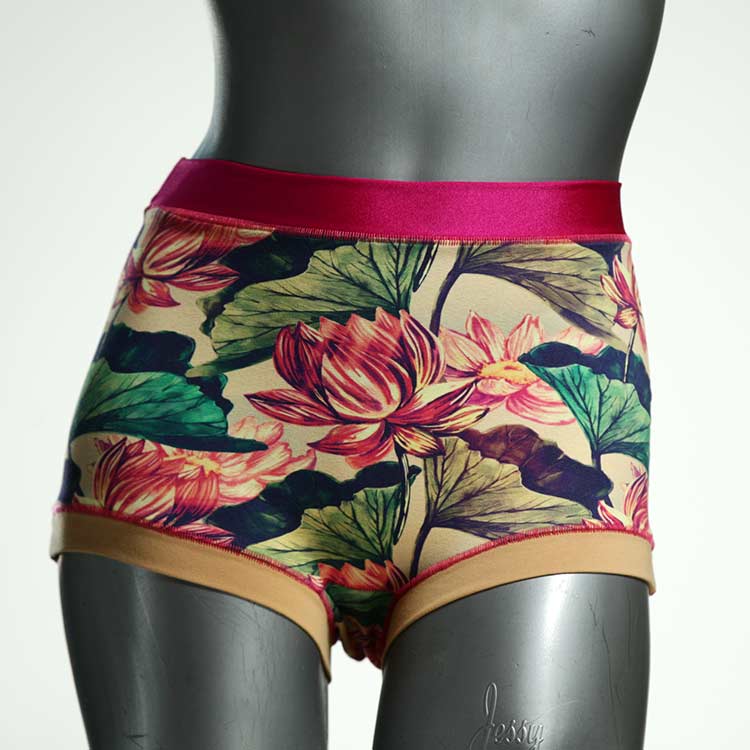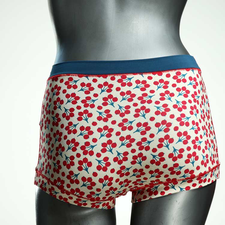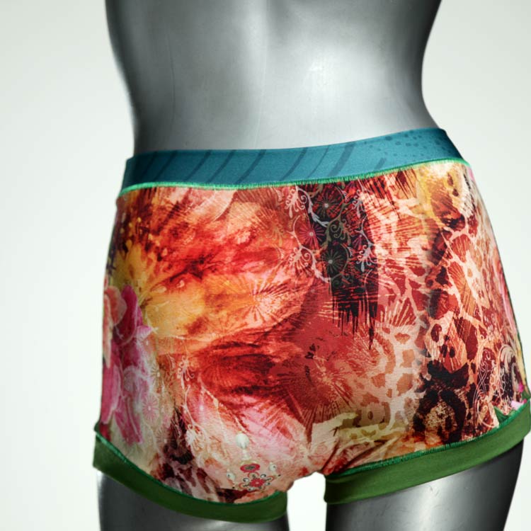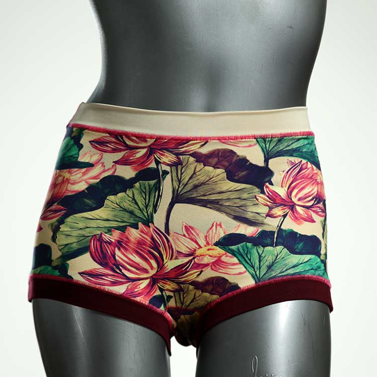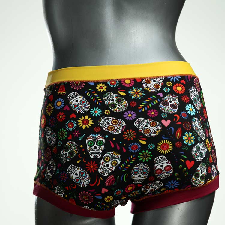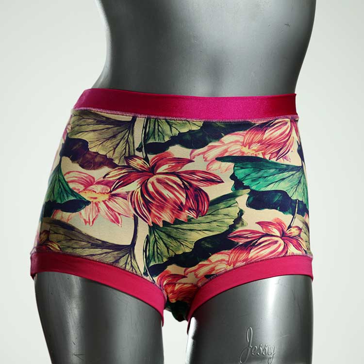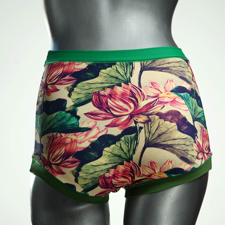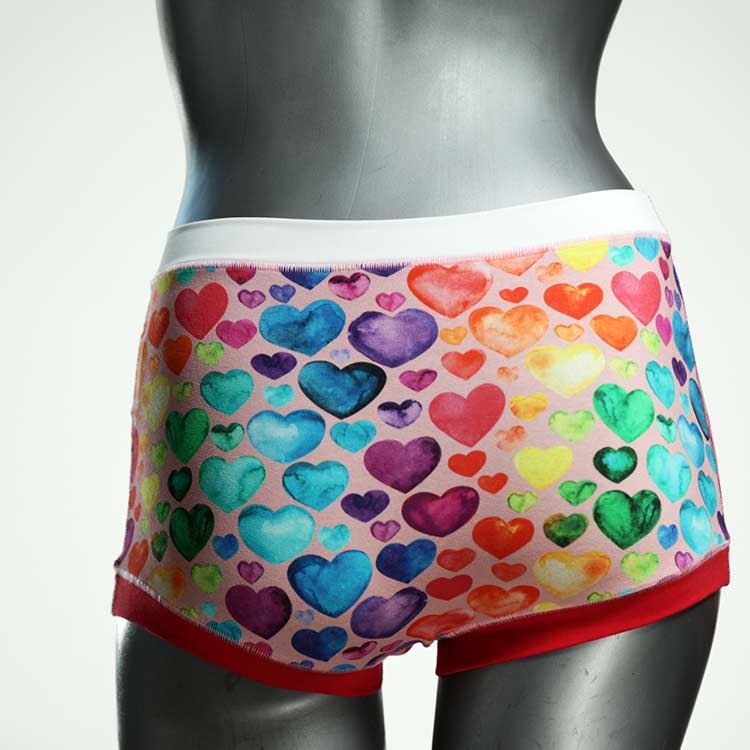 Diese besonders hoch geschnittenen Hotpants sind sehr beliebt. Echte Unikate aus Handarbeit, made in Berlin. Aus weichem und elastischem Bio-Baumwolljersey ohne klemmende Gummis. Bedeckt den Po vollständig und klemmt sich nirgends ein. Hautfreundlich und sehr bequem.
