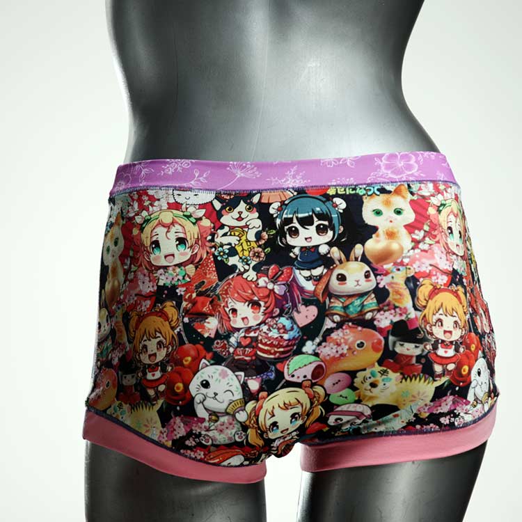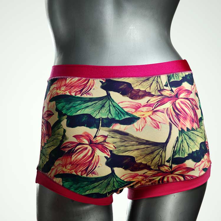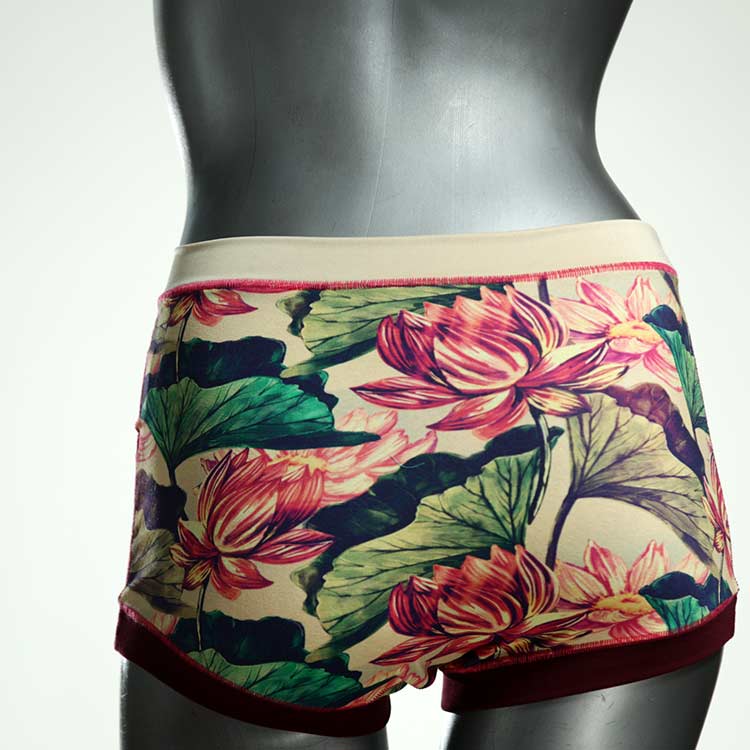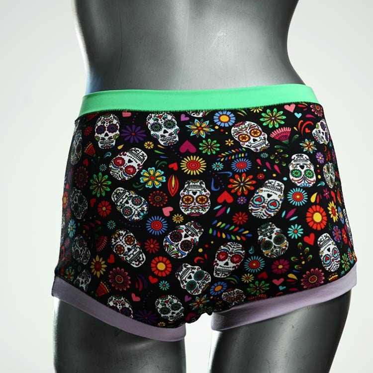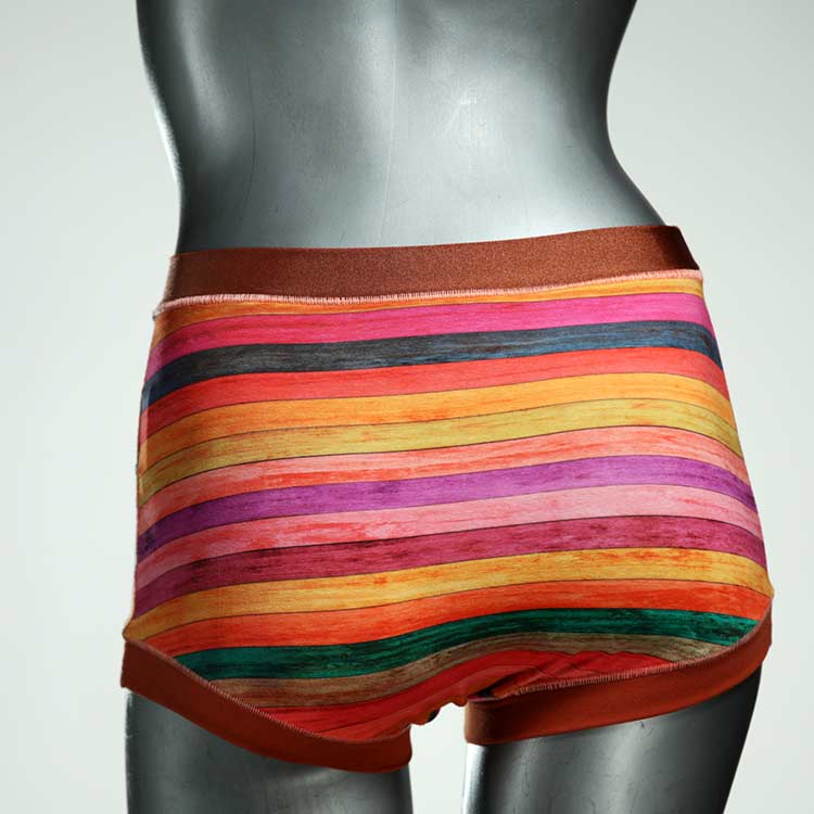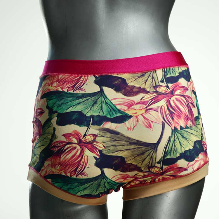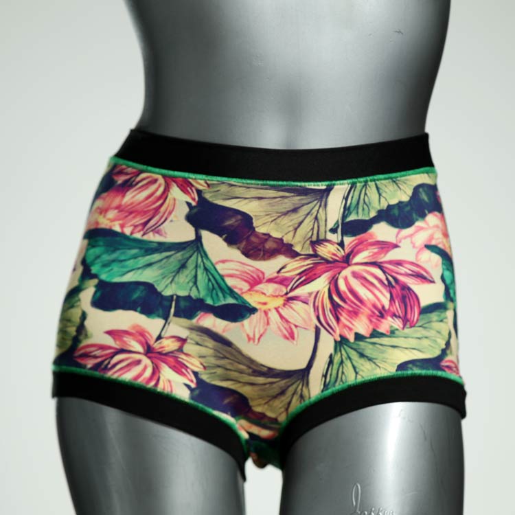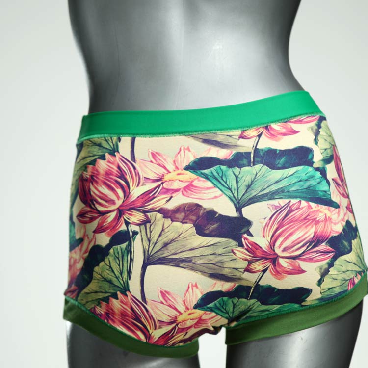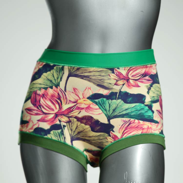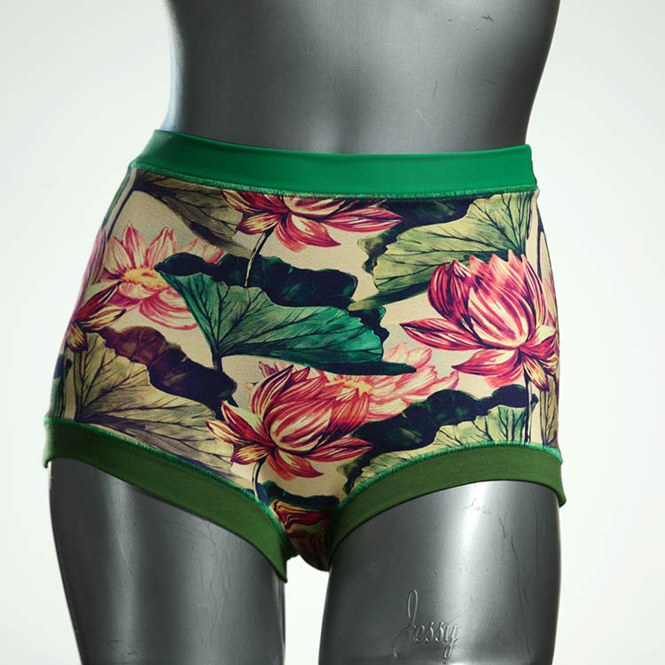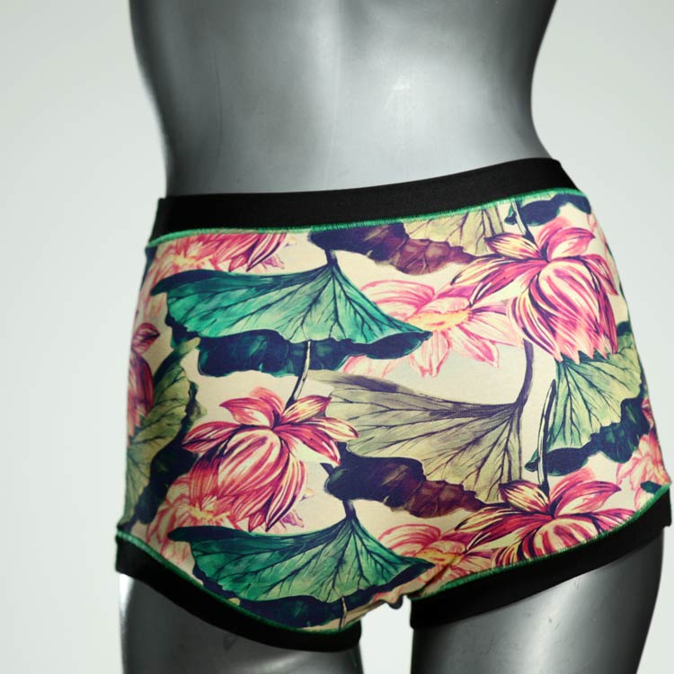 Diese besonders hoch geschnittenen Hotpants sind sehr beliebt. Echte Unikate aus Handarbeit, made in Berlin. Aus weichem und elastischem Bio-Baumwolljersey ohne klemmende Gummis. Bedeckt den Po vollständig und klemmt sich nirgends ein. Hautfreundlich und sehr bequem.