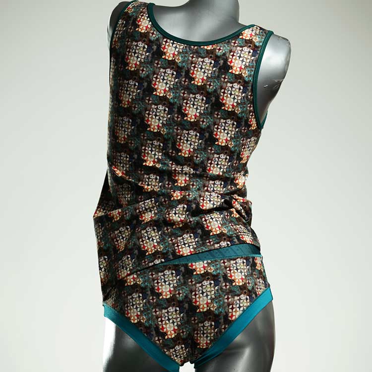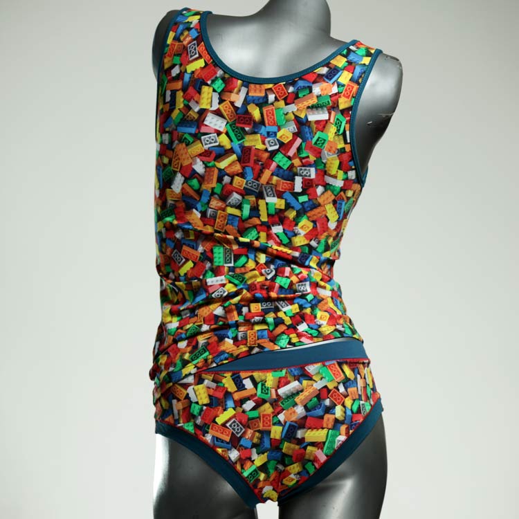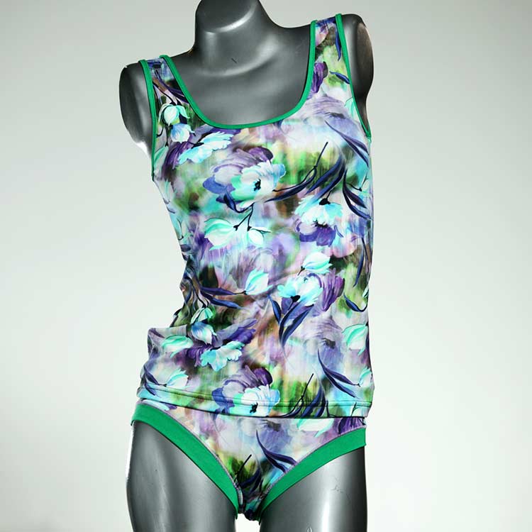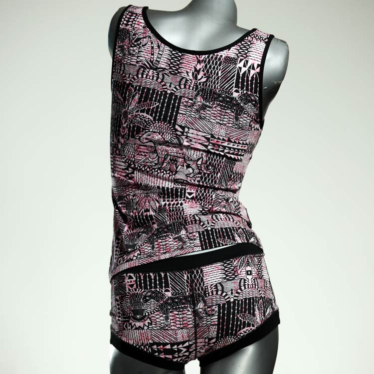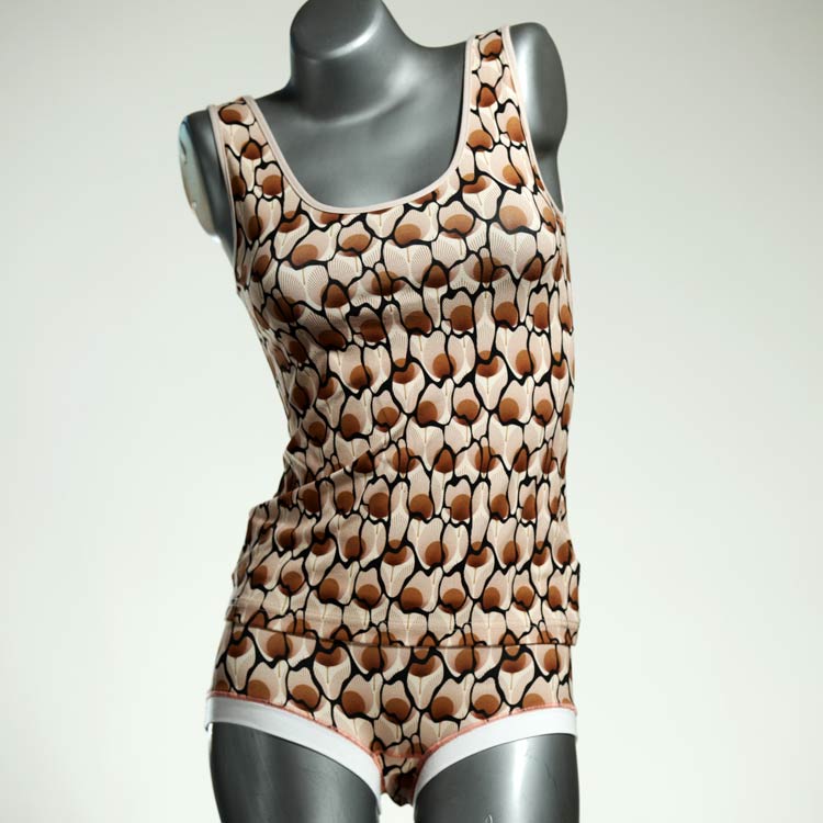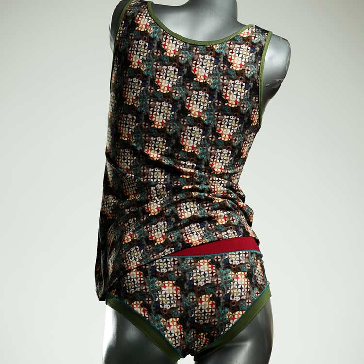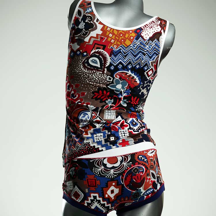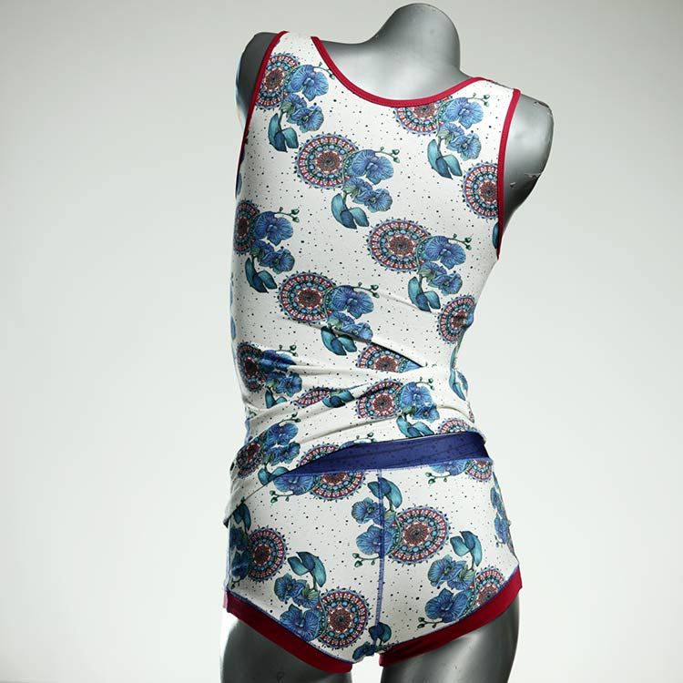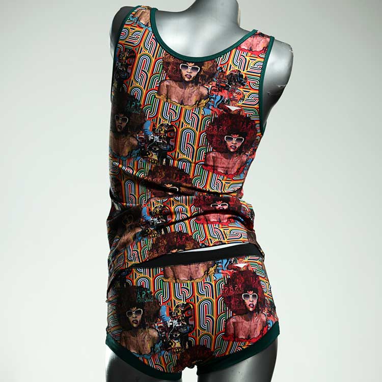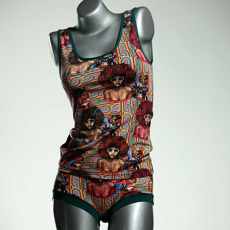 Dieses schöne und bequeme Unterwäsche Ensemble bestehend aus Top und Höschen aus Baumwolle gibt es nur einmal und es wurde in unserem Atelier in Berlin für Sie zugeschnitten, entworfen und genäht. Wir erschaffen täglich neue Unterwäsche-Einzelstücke aus weichen kunterbunten Baumwoll-Jerseys.