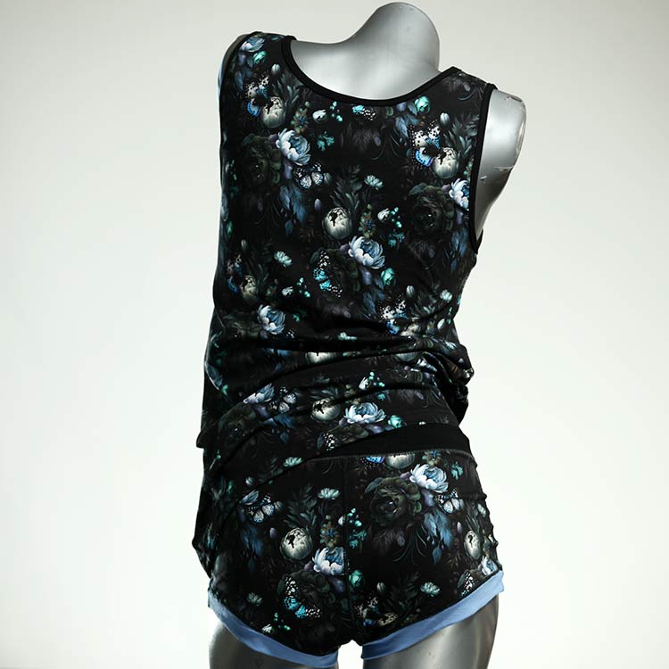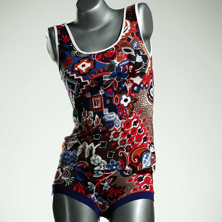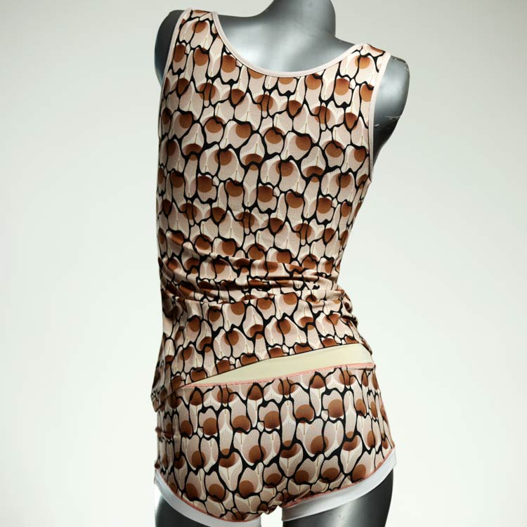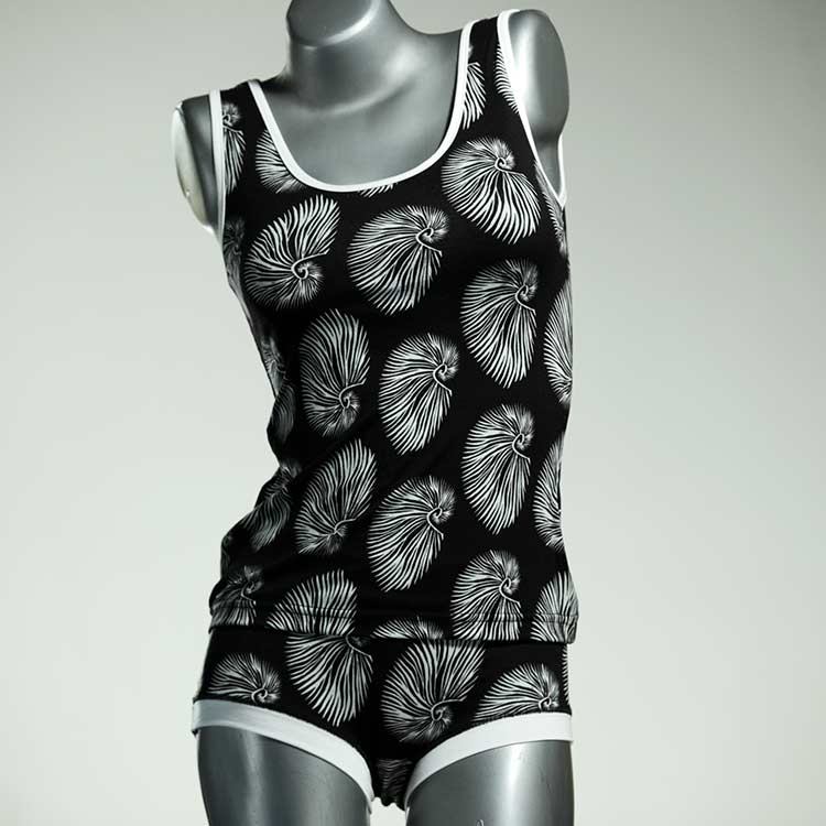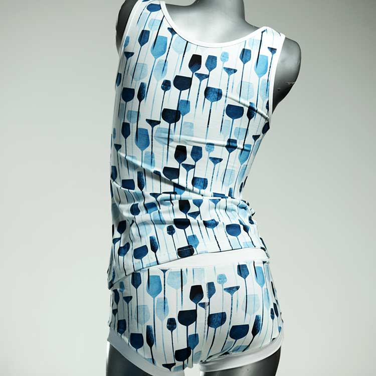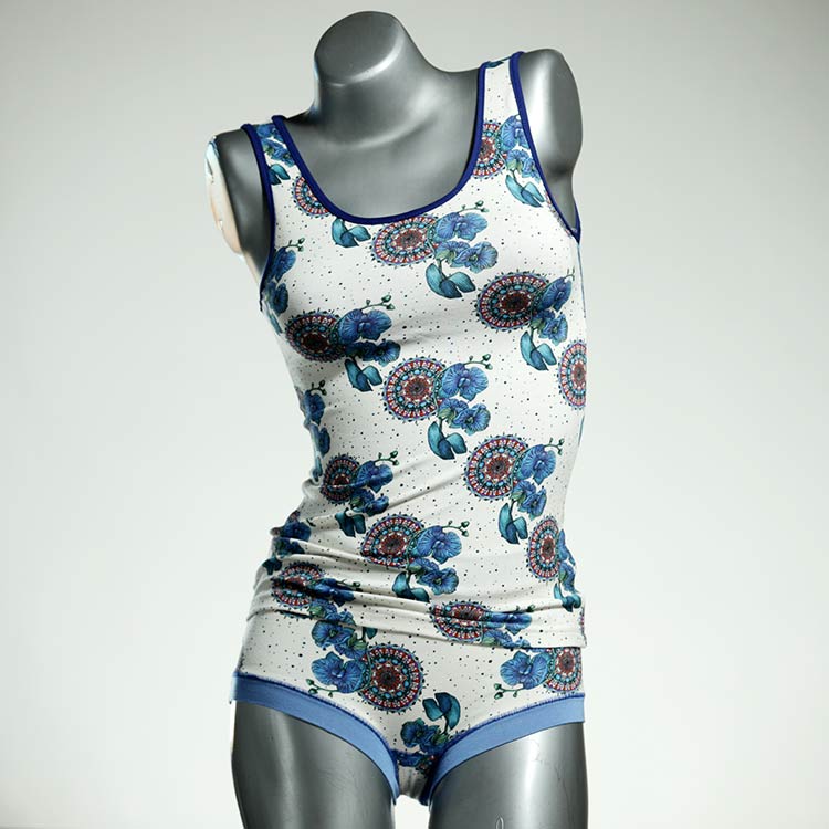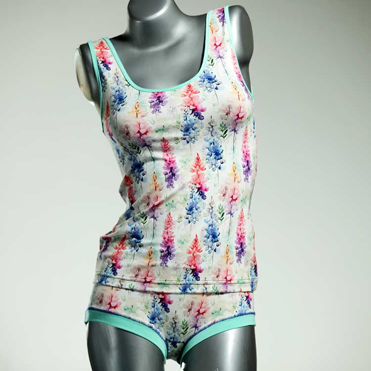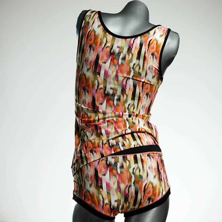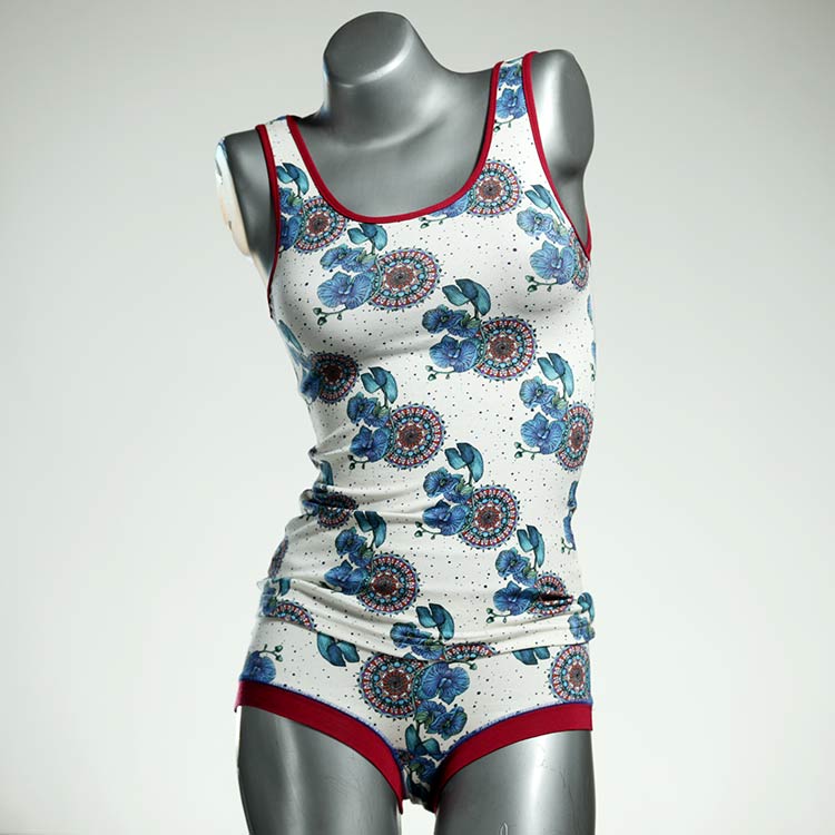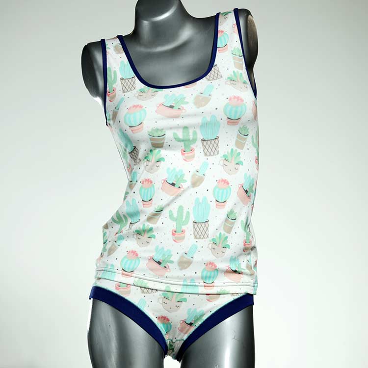 Dieses schöne und bequeme Unterwäsche Ensemble bestehend aus Top und Höschen aus Baumwolle gibt es nur einmal und es wurde in unserem Atelier in Berlin für Sie zugeschnitten, entworfen und genäht. Wir erschaffen täglich neue Unterwäsche-Einzelstücke aus weichen kunterbunten Baumwoll-Jerseys.