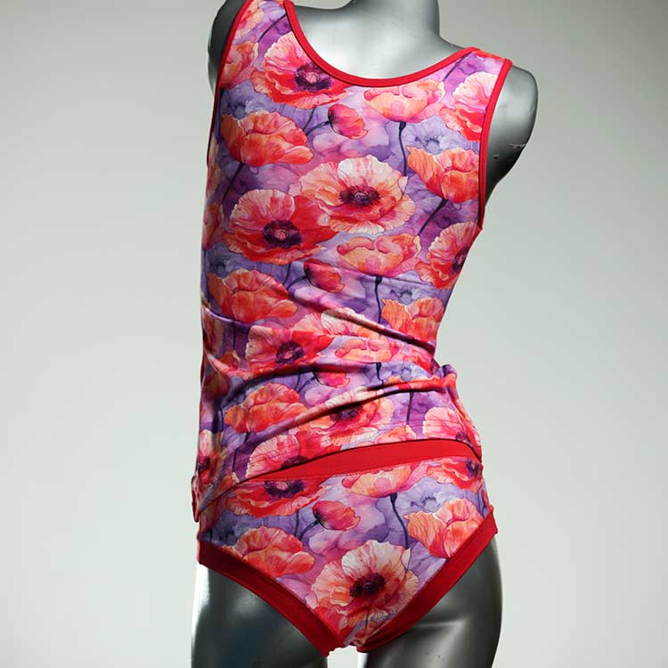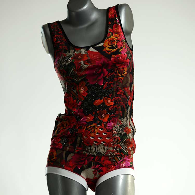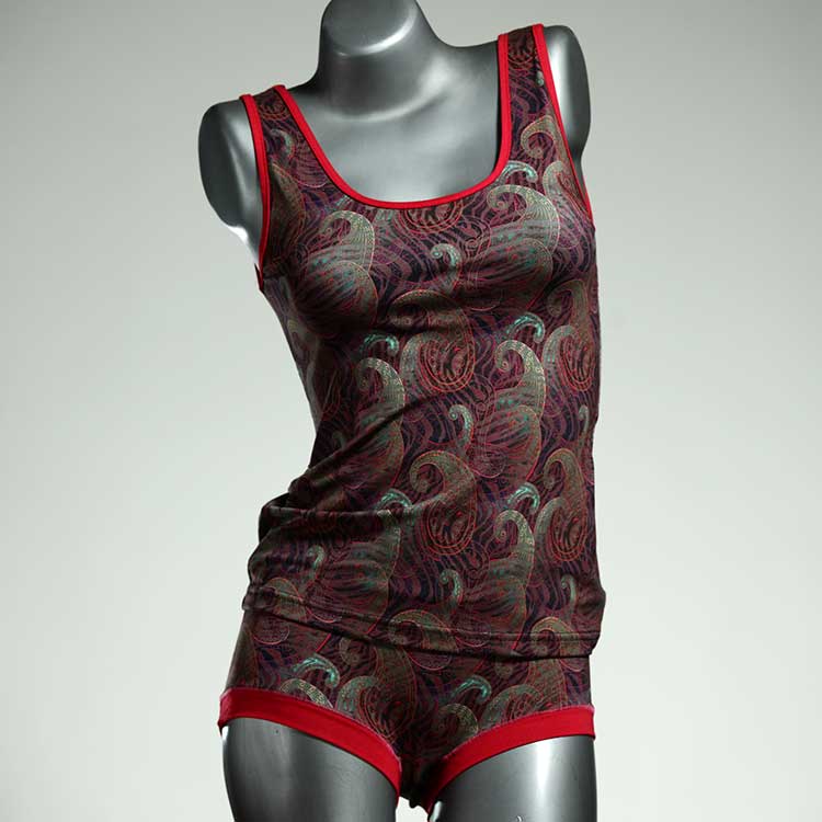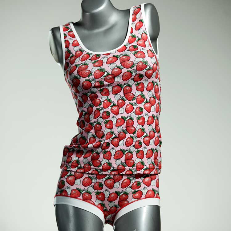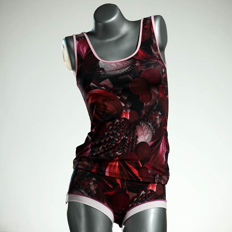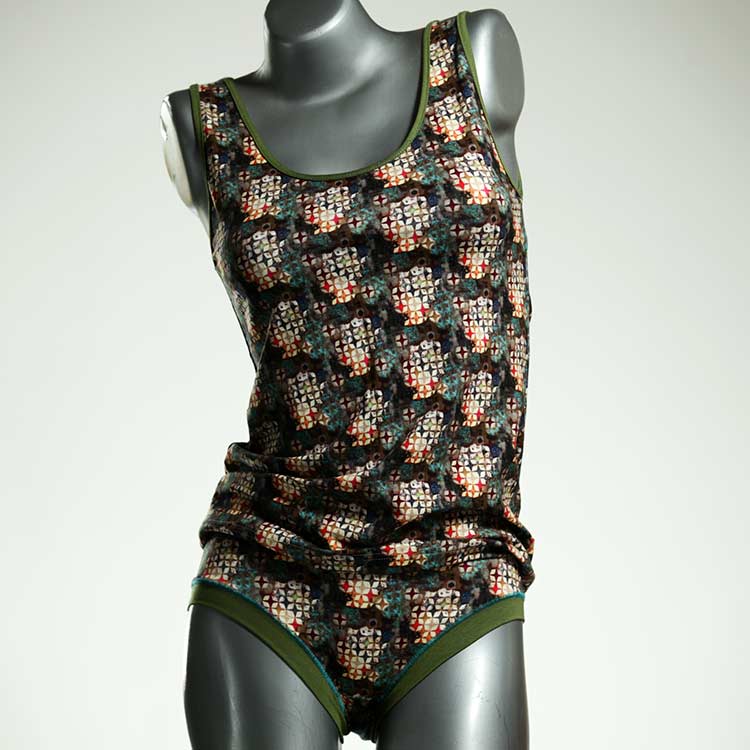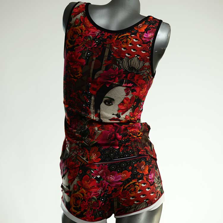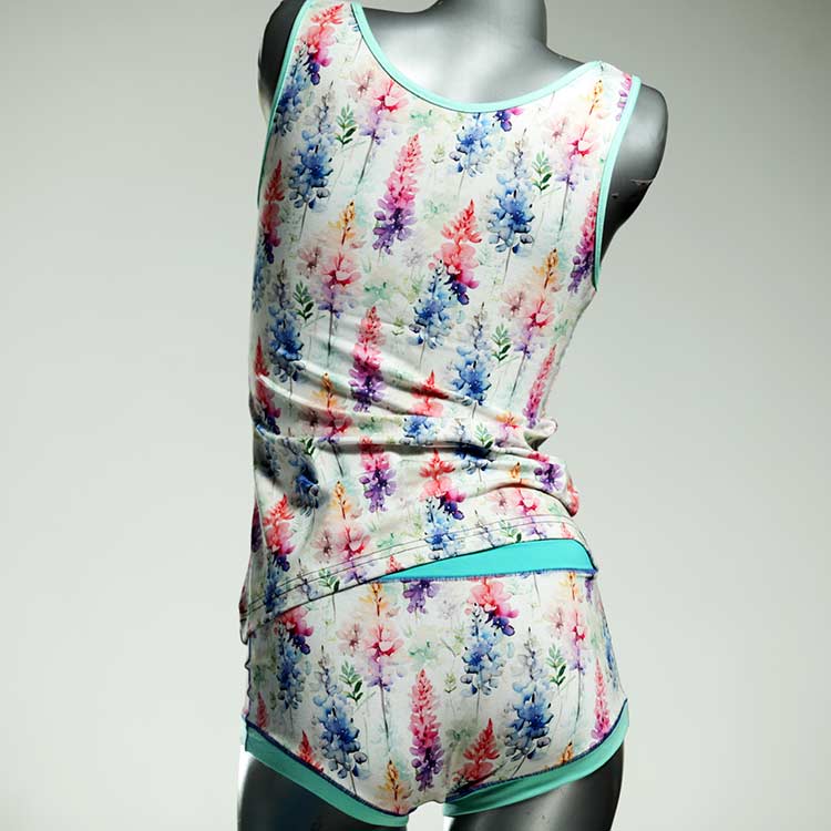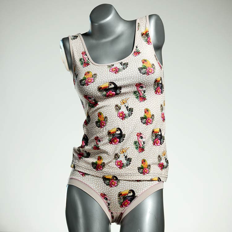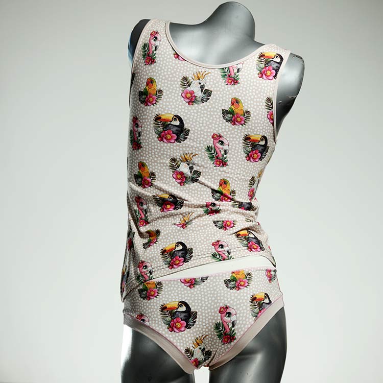 Dieses schöne und bequeme Unterwäsche Ensemble bestehend aus Top und Höschen aus Baumwolle gibt es nur einmal und es wurde in unserem Atelier in Berlin für Sie zugeschnitten, entworfen und genäht. Wir erschaffen täglich neue Unterwäsche-Einzelstücke aus weichen kunterbunten Baumwoll-Jerseys.