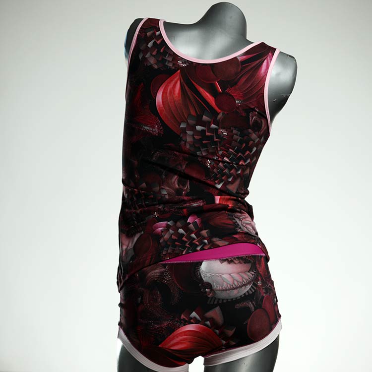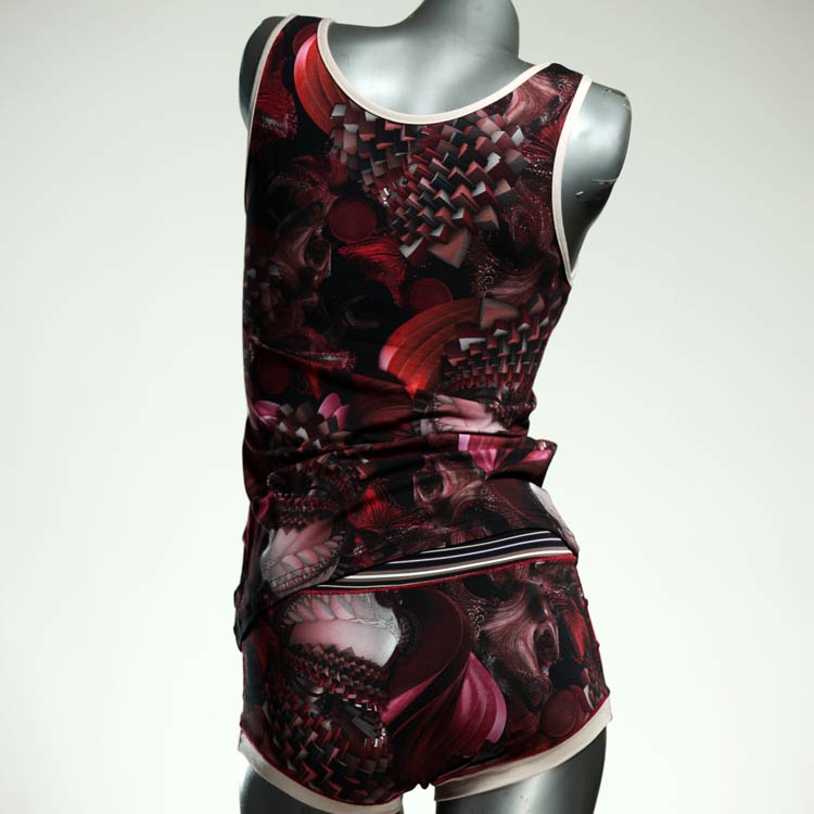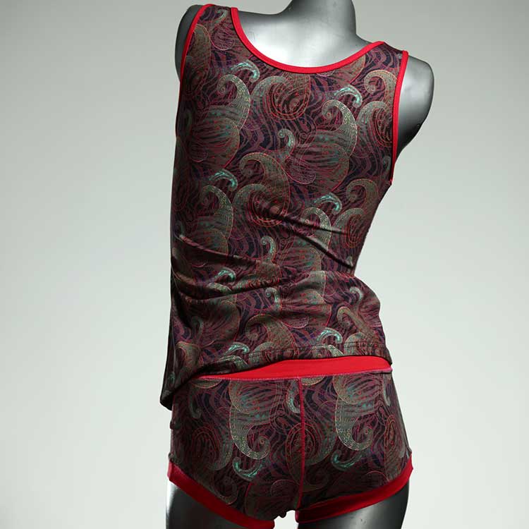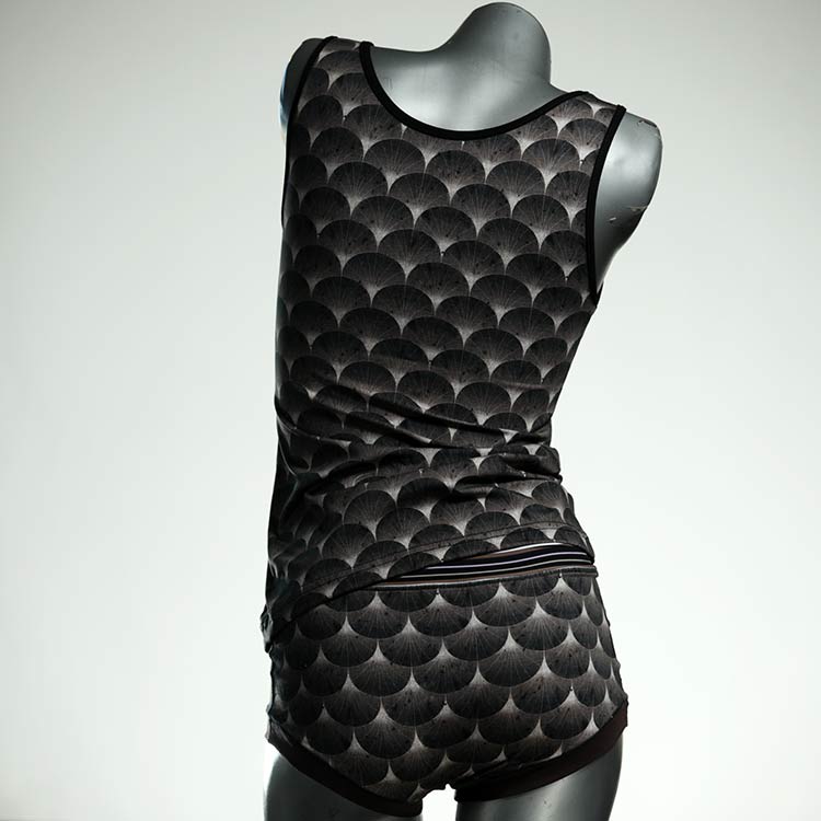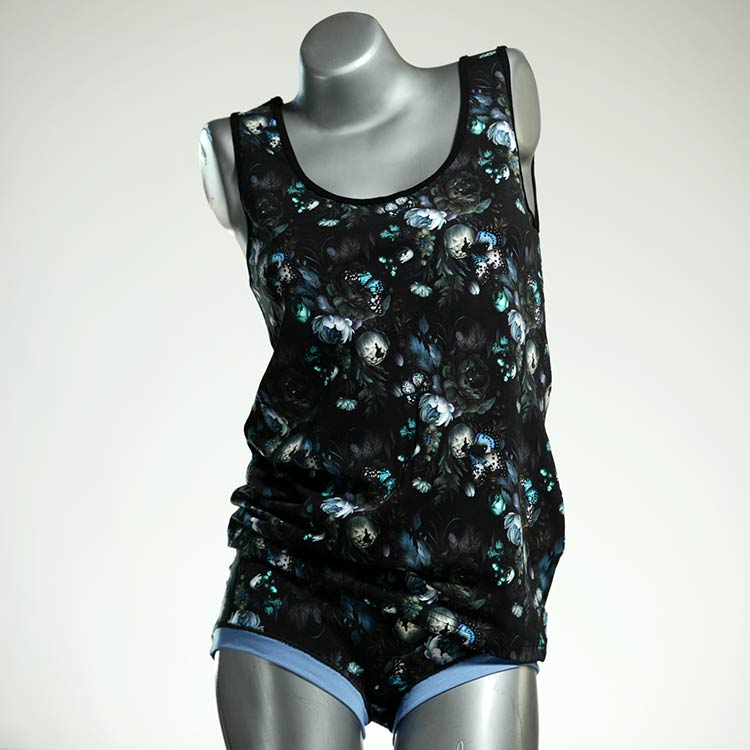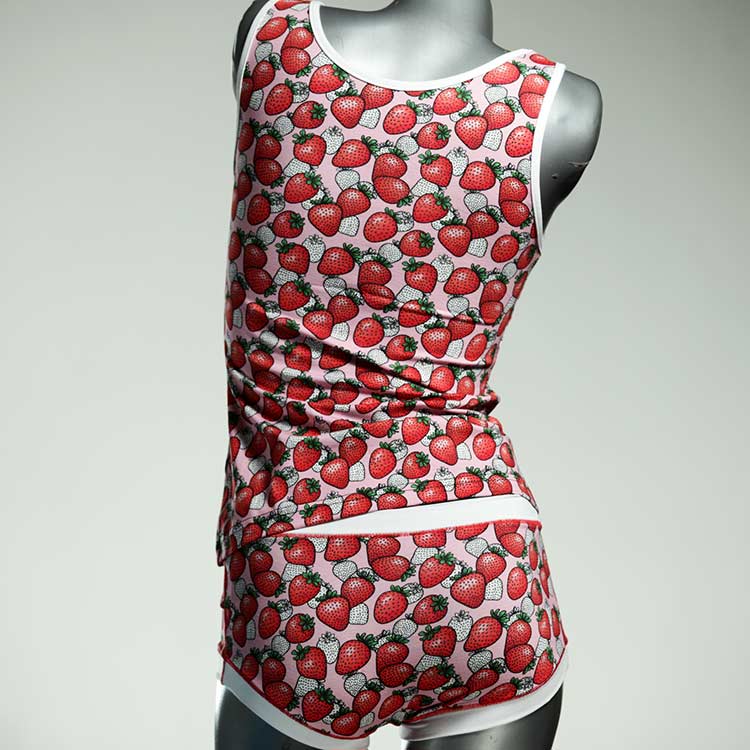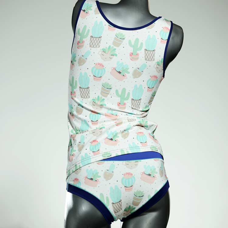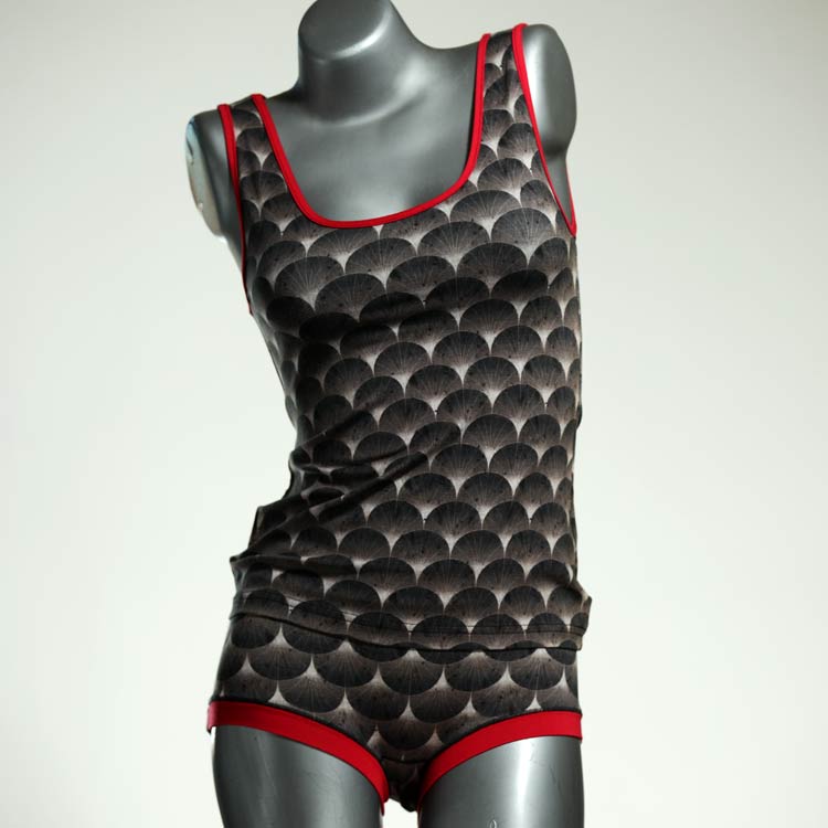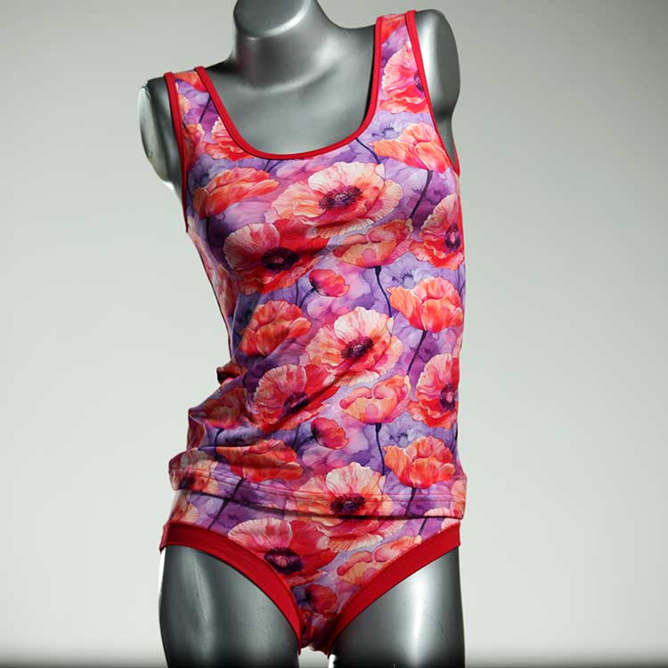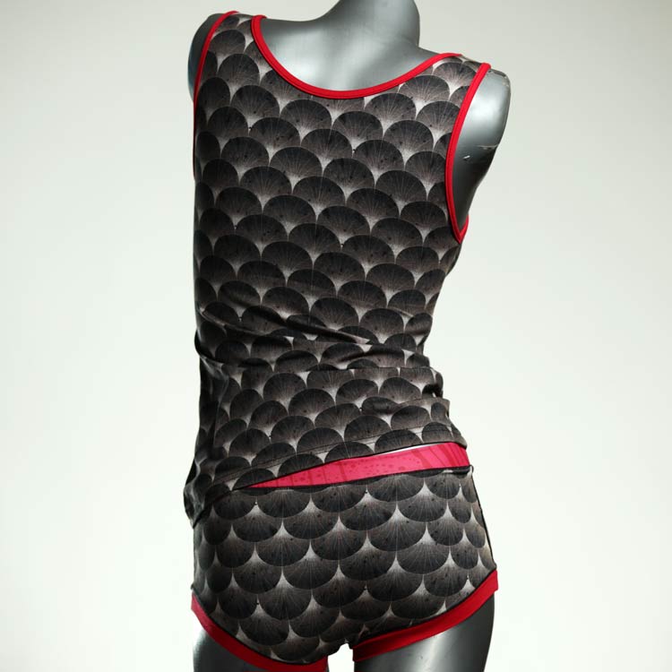 Dieses schöne und bequeme Unterwäsche Ensemble bestehend aus Top und Höschen aus Baumwolle gibt es nur einmal und es wurde in unserem Atelier in Berlin für Sie zugeschnitten, entworfen und genäht. Wir erschaffen täglich neue Unterwäsche-Einzelstücke aus weichen kunterbunten Baumwoll-Jerseys.