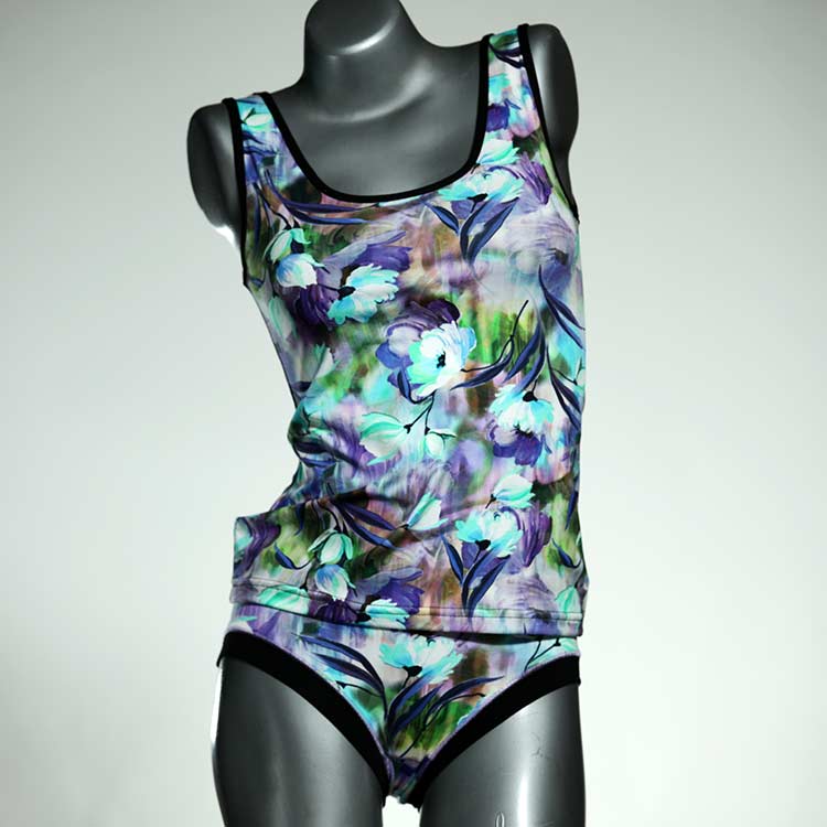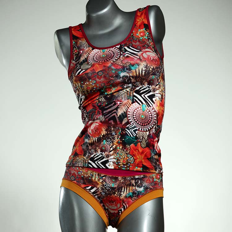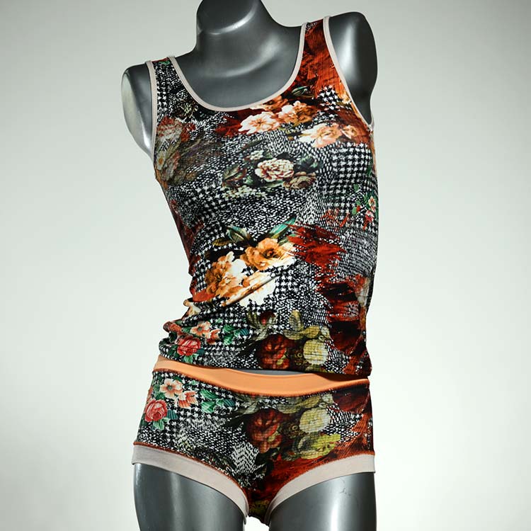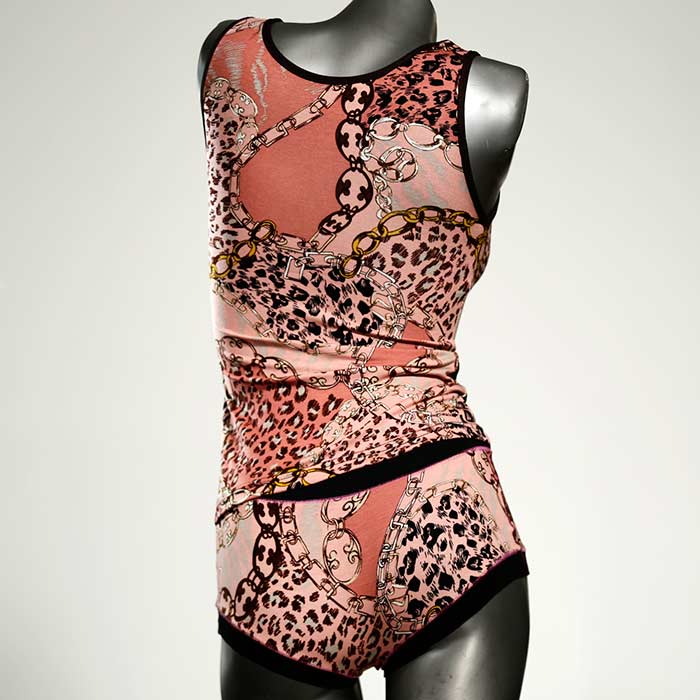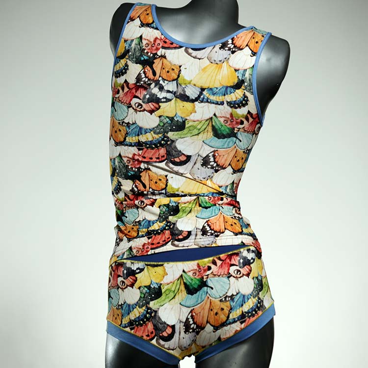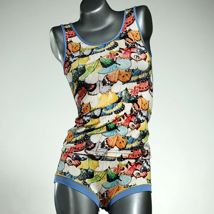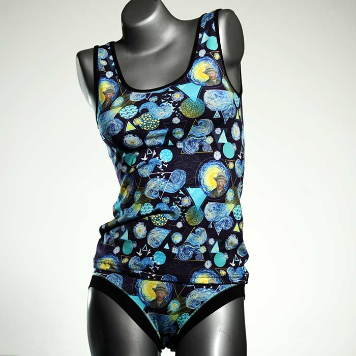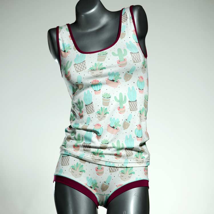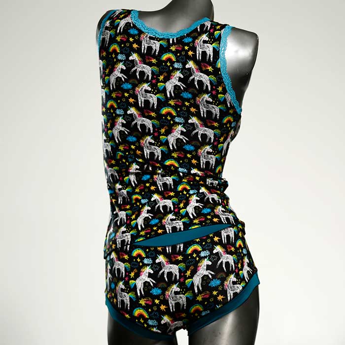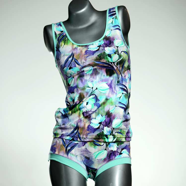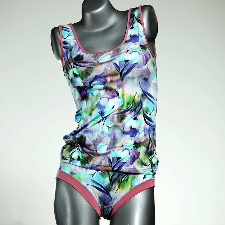 Dieses schöne und bequeme Unterwäsche Ensemble bestehend aus Top und Höschen aus Baumwolle gibt es nur einmal und es wurde in unserem Atelier in Berlin für Sie zugeschnitten, entworfen und genäht. Wir erschaffen täglich neue Unterwäsche-Einzelstücke aus weichen kunterbunten Baumwoll-Jerseys.