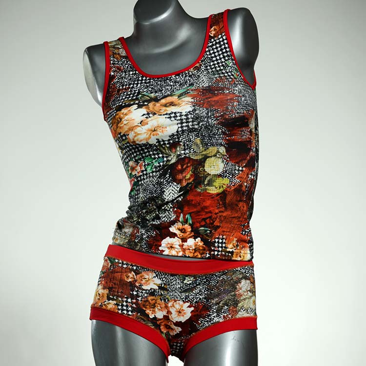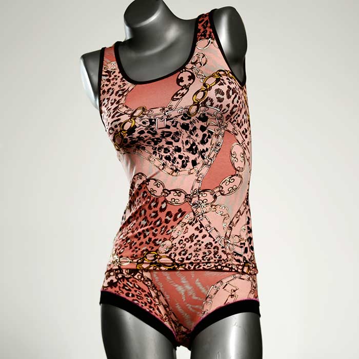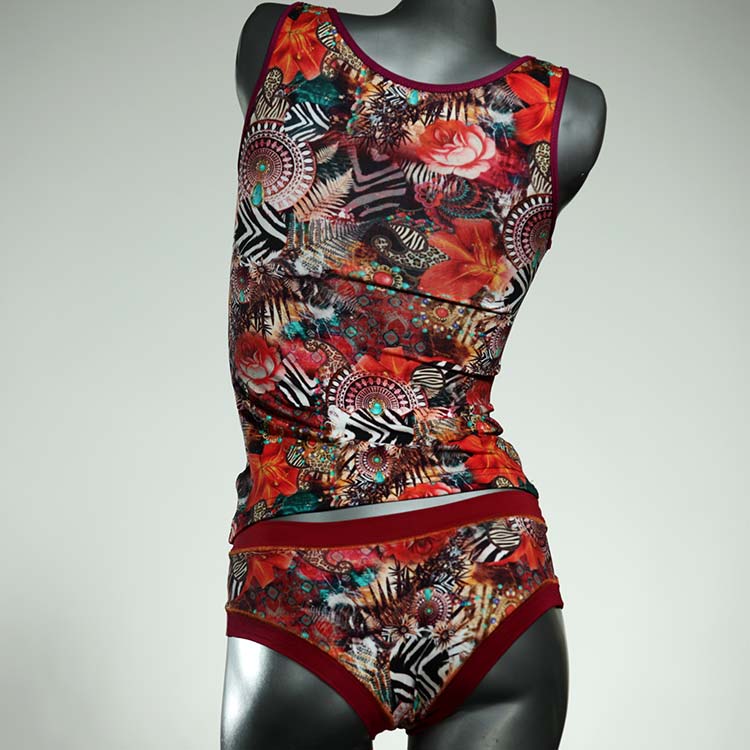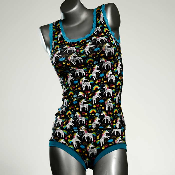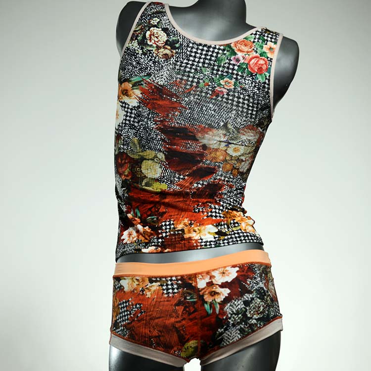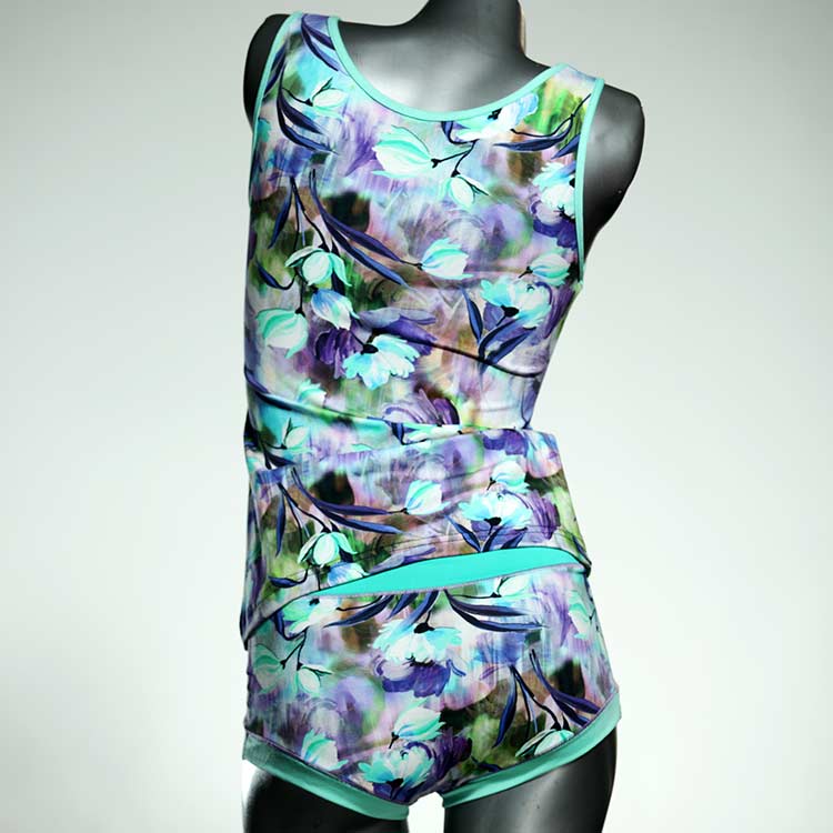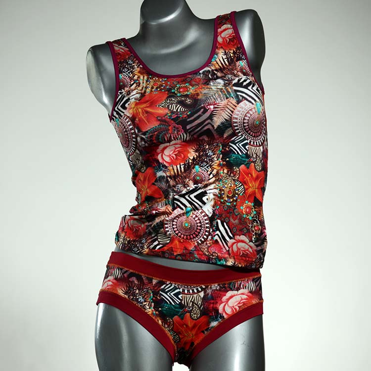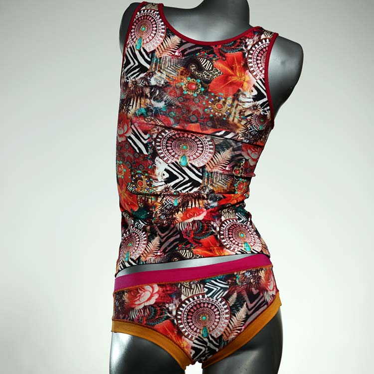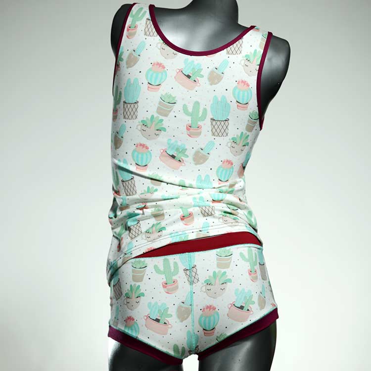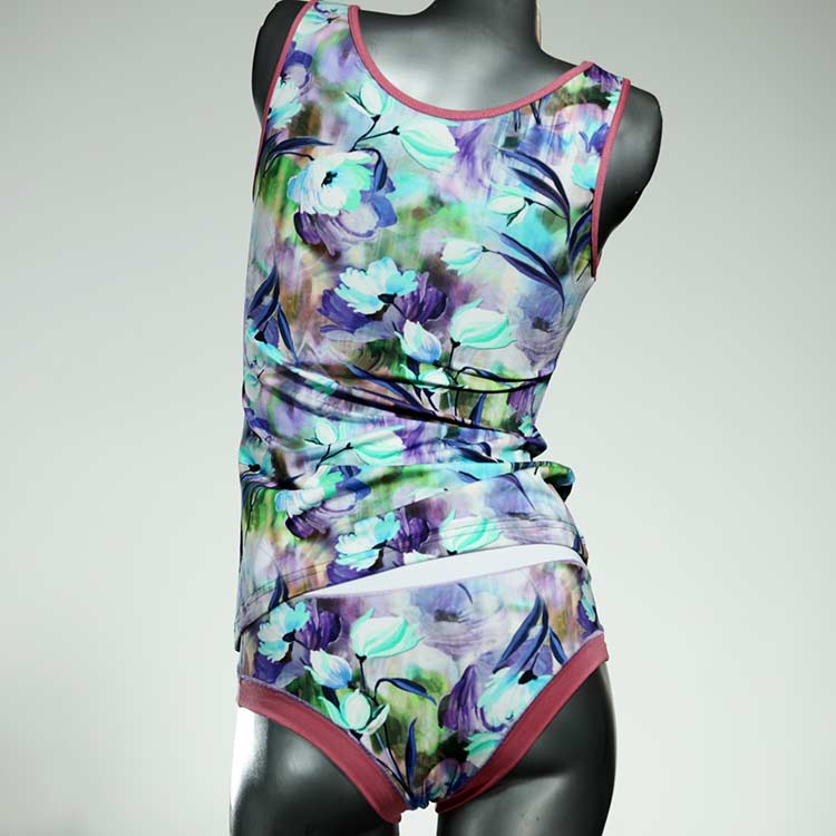 Dieses schöne und bequeme Unterwäsche Ensemble bestehend aus Top und Höschen aus Baumwolle gibt es nur einmal und es wurde in unserem Atelier in Berlin für Sie zugeschnitten, entworfen und genäht. Wir erschaffen täglich neue Unterwäsche-Einzelstücke aus weichen kunterbunten Baumwoll-Jerseys.