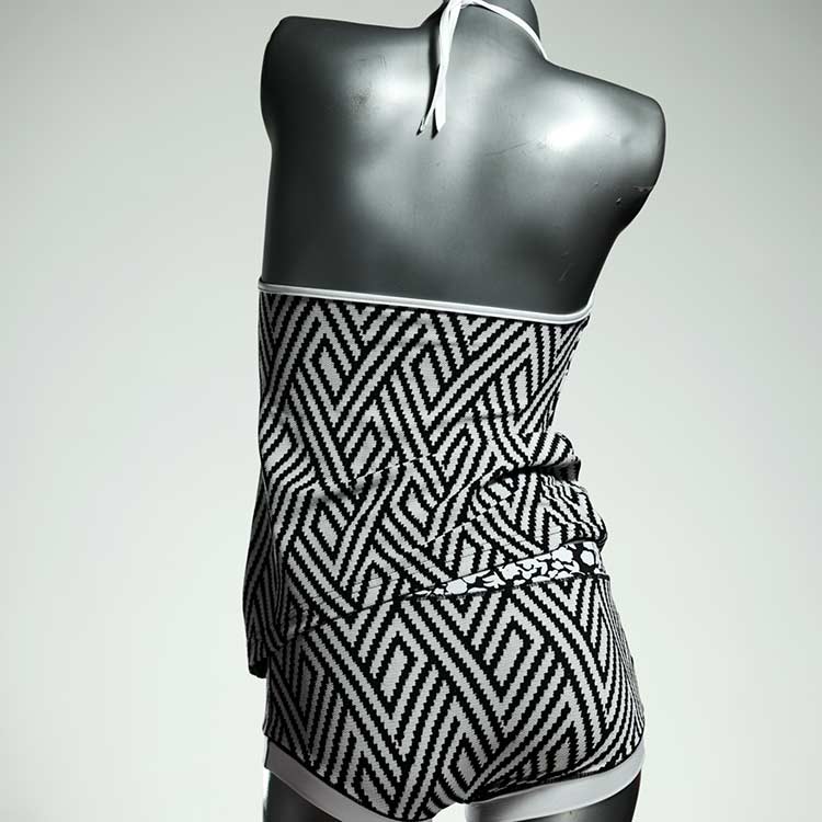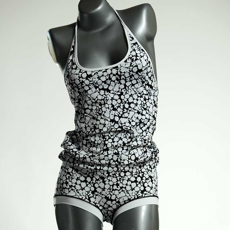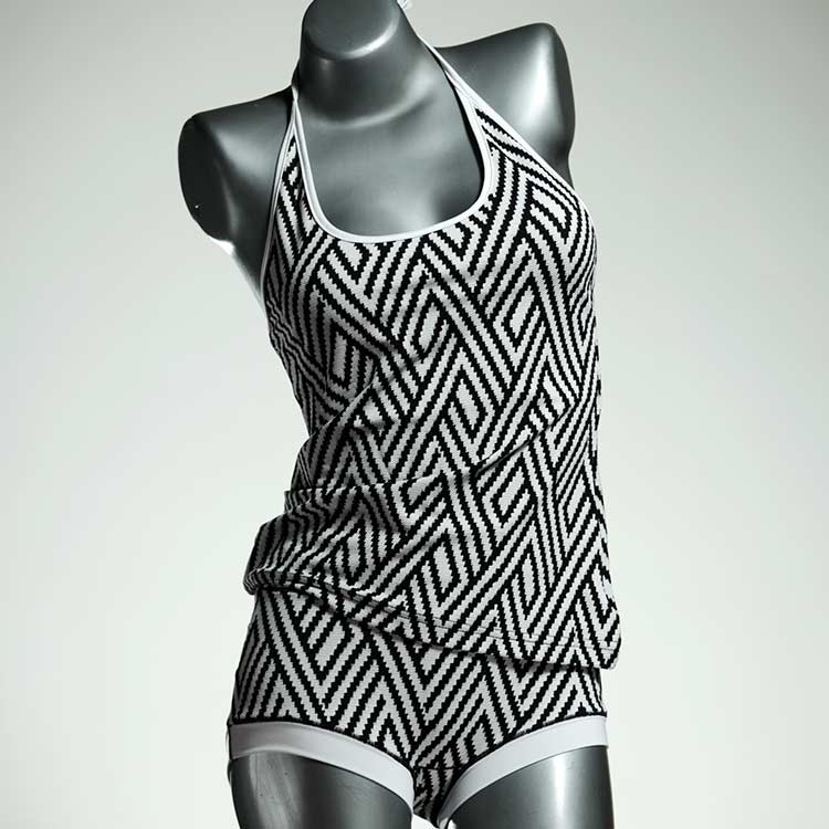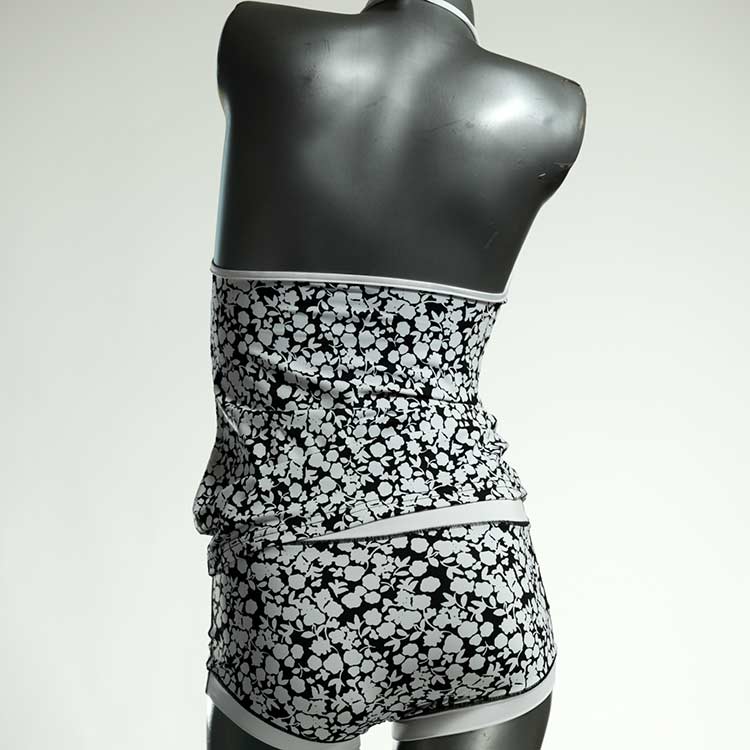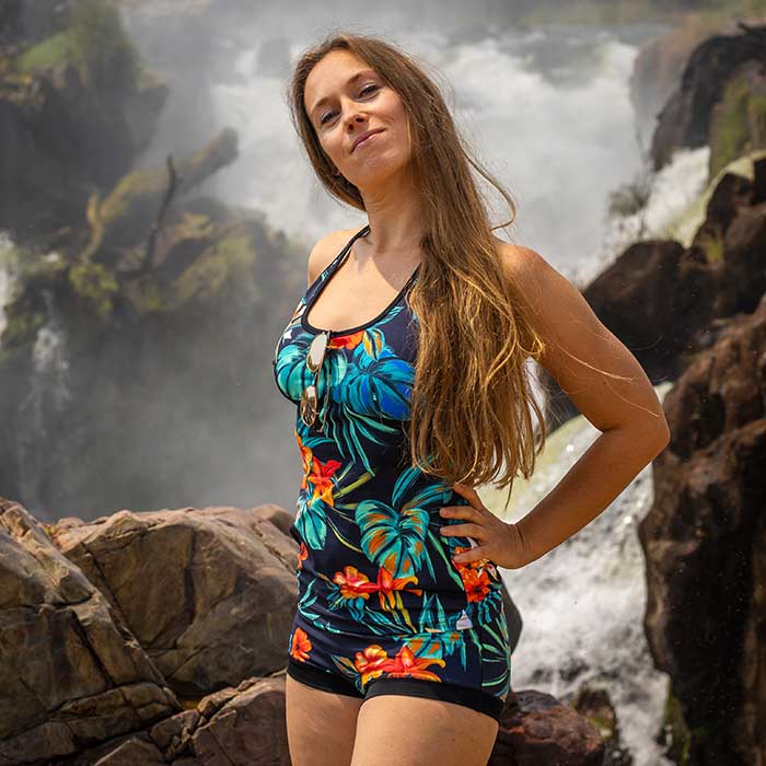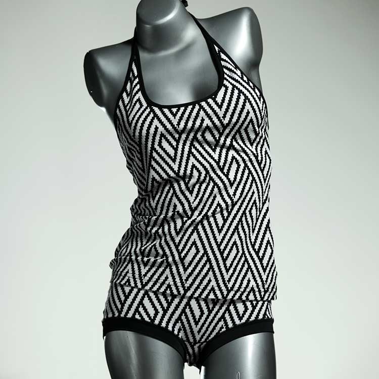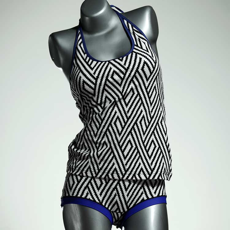 Die Tankini-Sets bestehen aus einem Badetop mit Spagetti-Trägern zum Zuknoten und einer Badepanty oder Badehotpant. Großartig zum Schwimmen und Schnorcheln. Das Material ist hochwertiges und lichtechtes Lycra aus einer kleinen Weberei bei Barcelona.