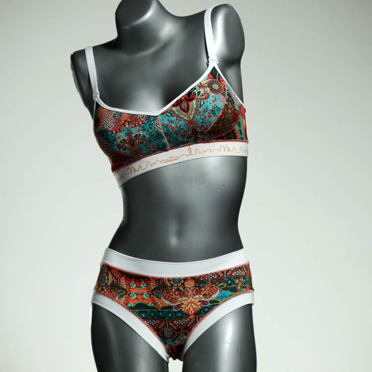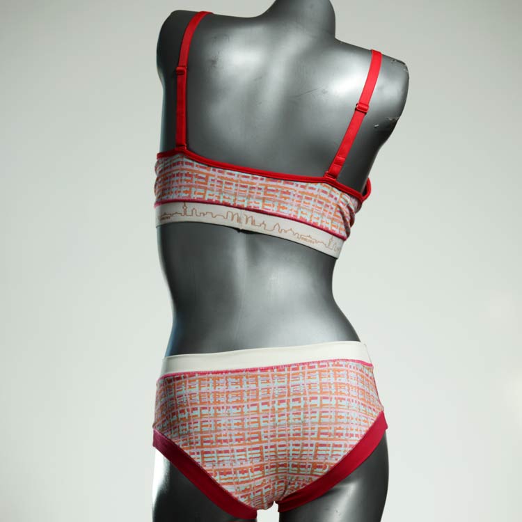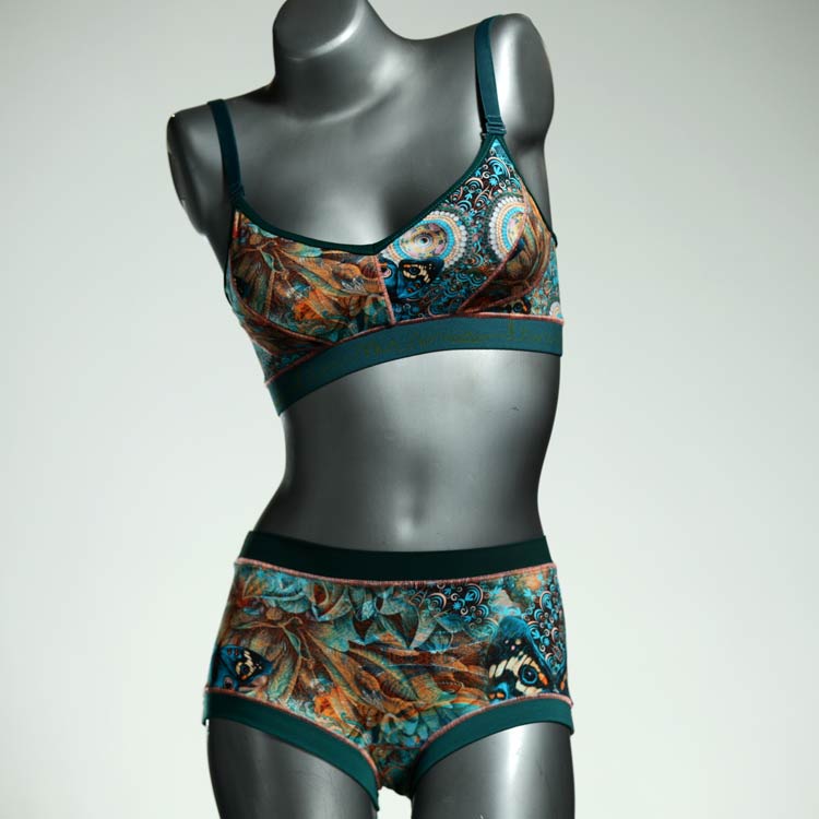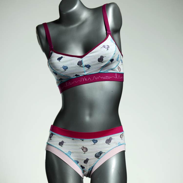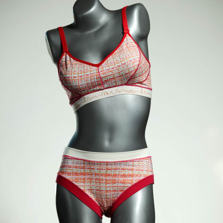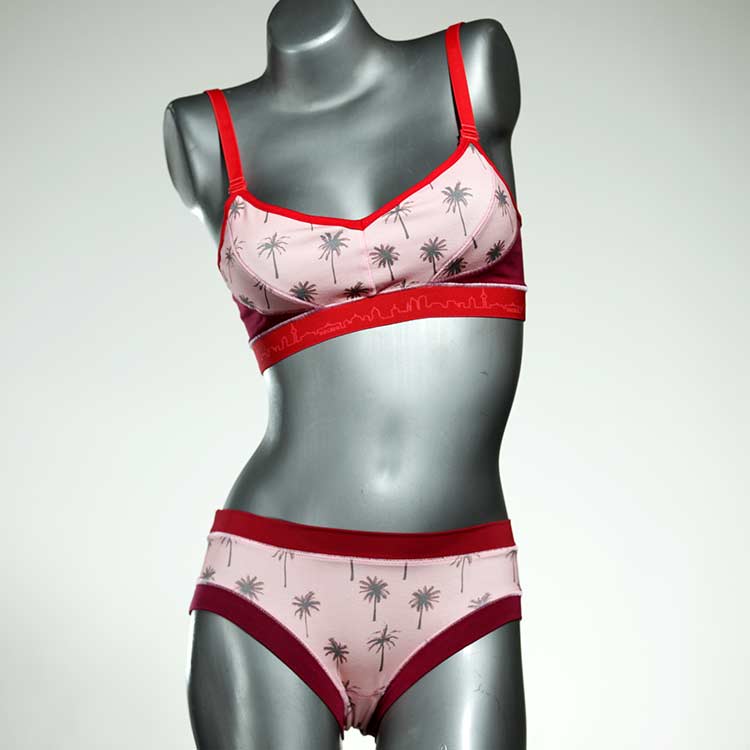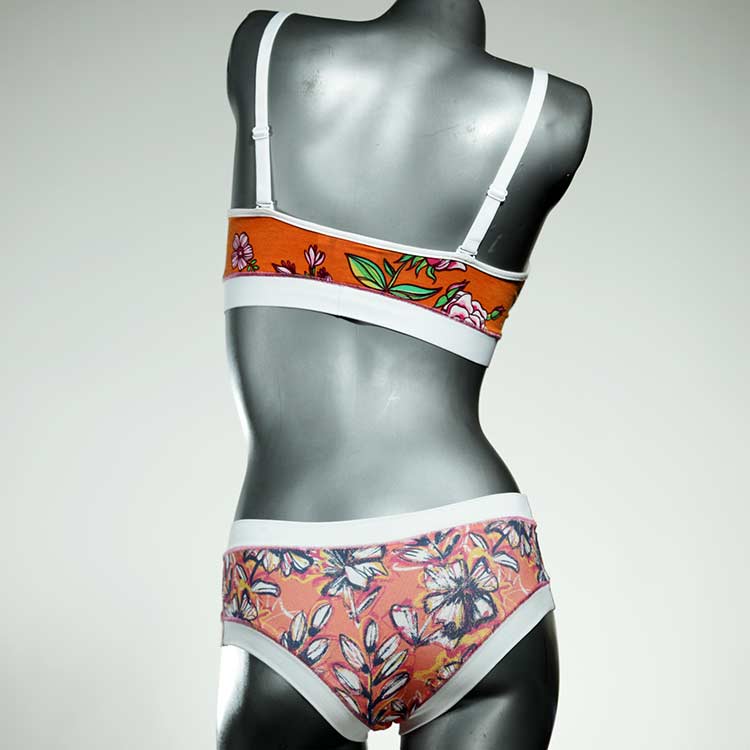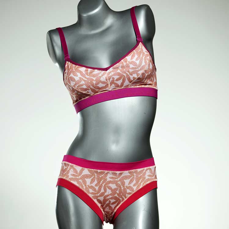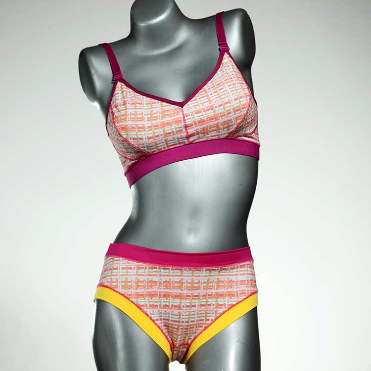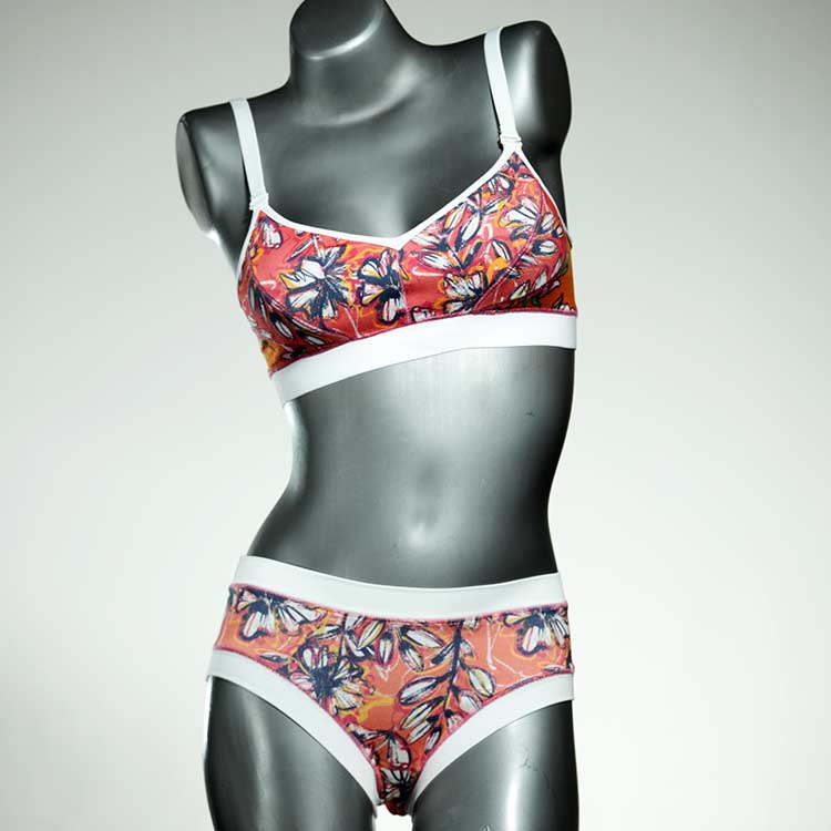 Ensemble unique de soutien-gorge en jersey de coton biologique double épaisseur et respirant avec des bretelles de 16 mm de large et une culotte assortie. Sous-vêtements uniques confortables, équitables et produits de manière durable de notre manufacture. Soutien-gorge sans armature, sans coussin ni fermoir.