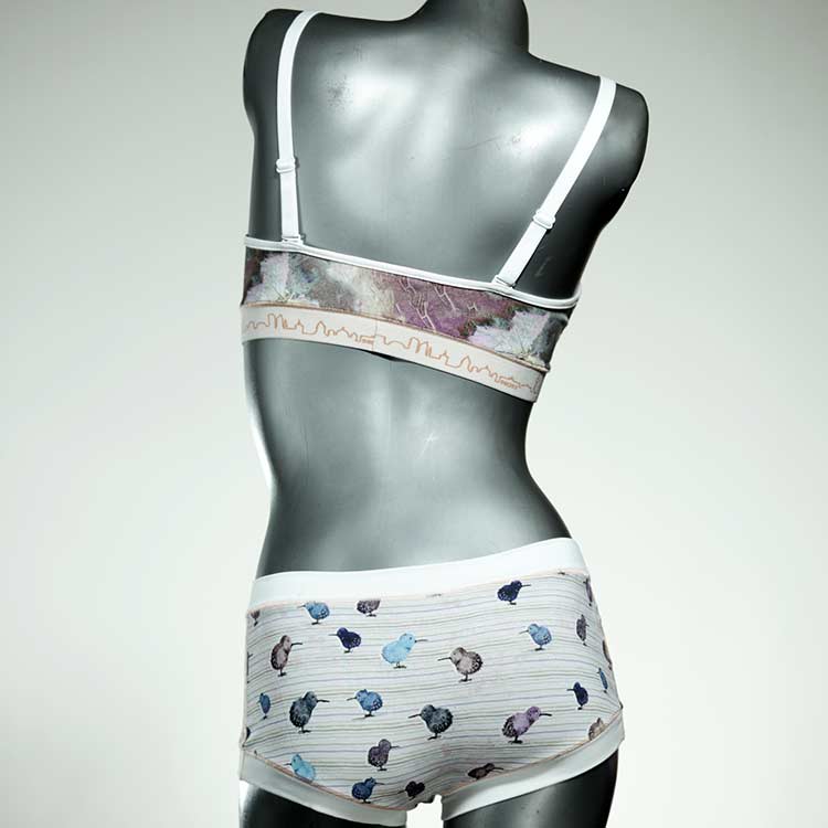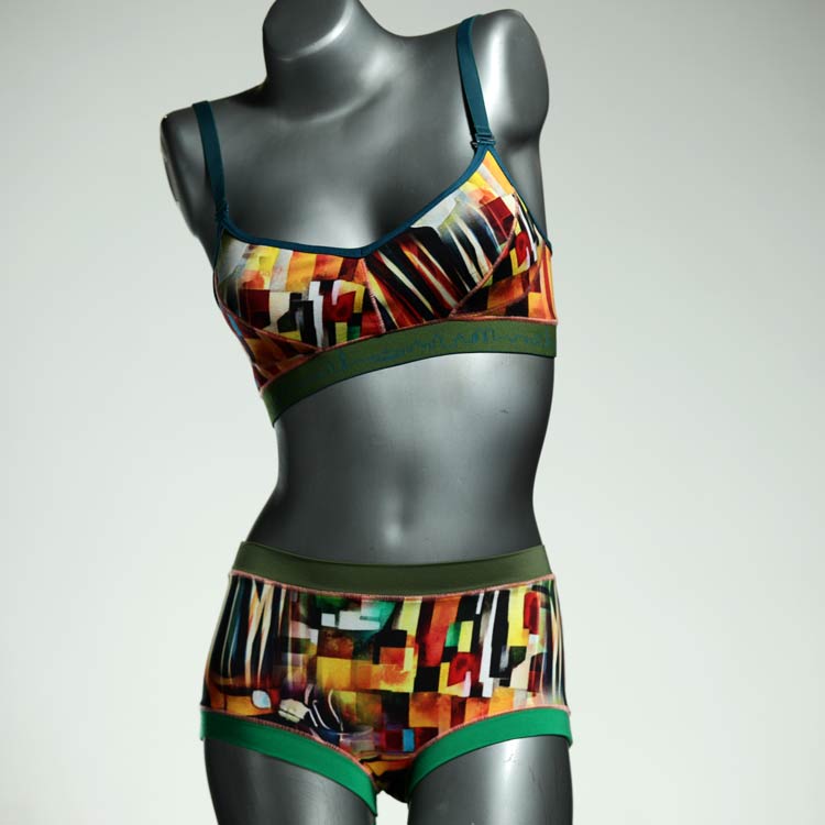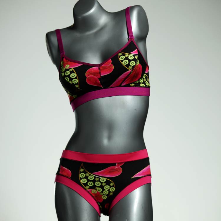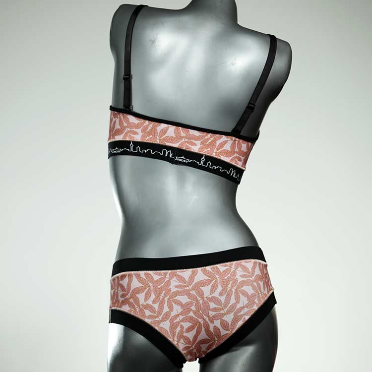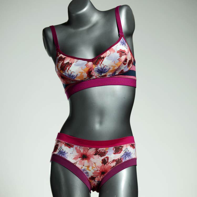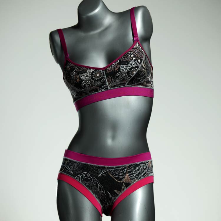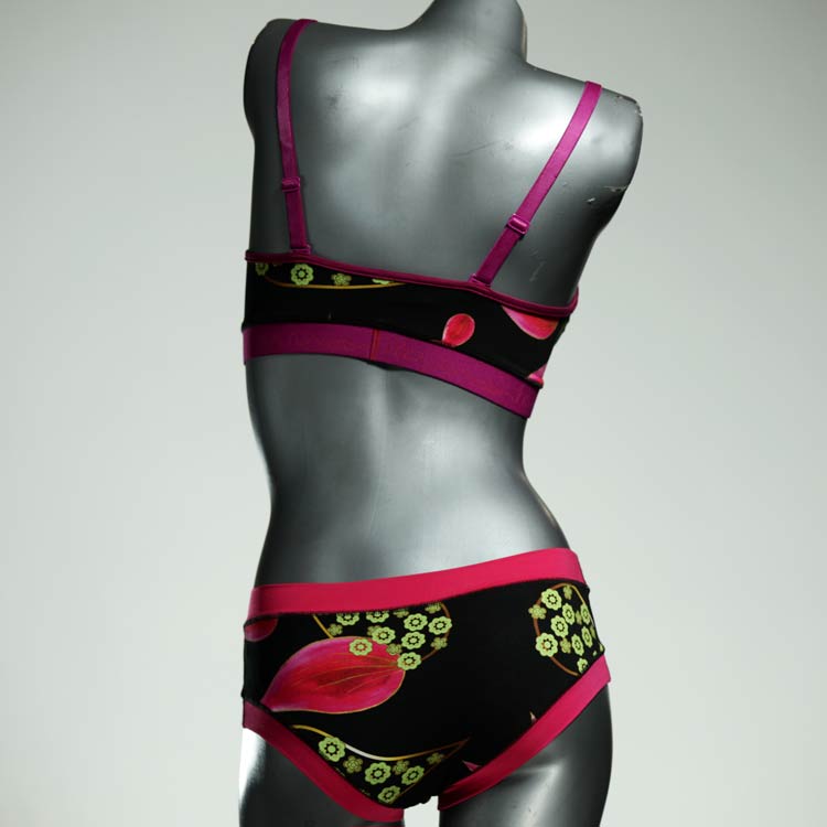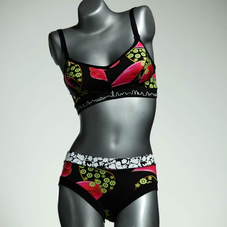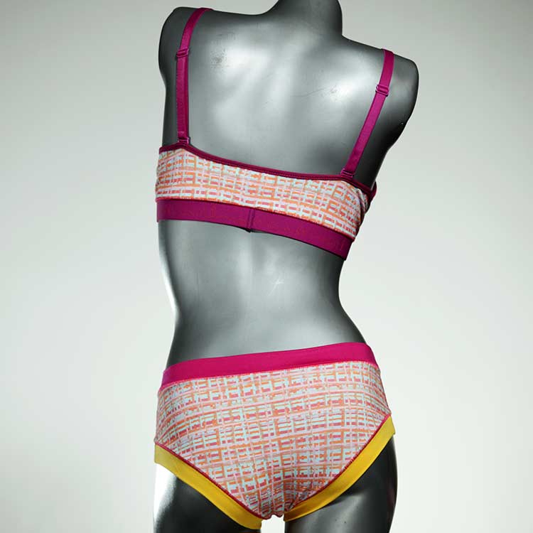 Ensemble unique de soutien-gorge en jersey de coton biologique double épaisseur et respirant avec des bretelles de 16 mm de large et une culotte assortie. Sous-vêtements uniques confortables, équitables et produits de manière durable de notre manufacture. Soutien-gorge sans armature, sans coussin ni fermoir.