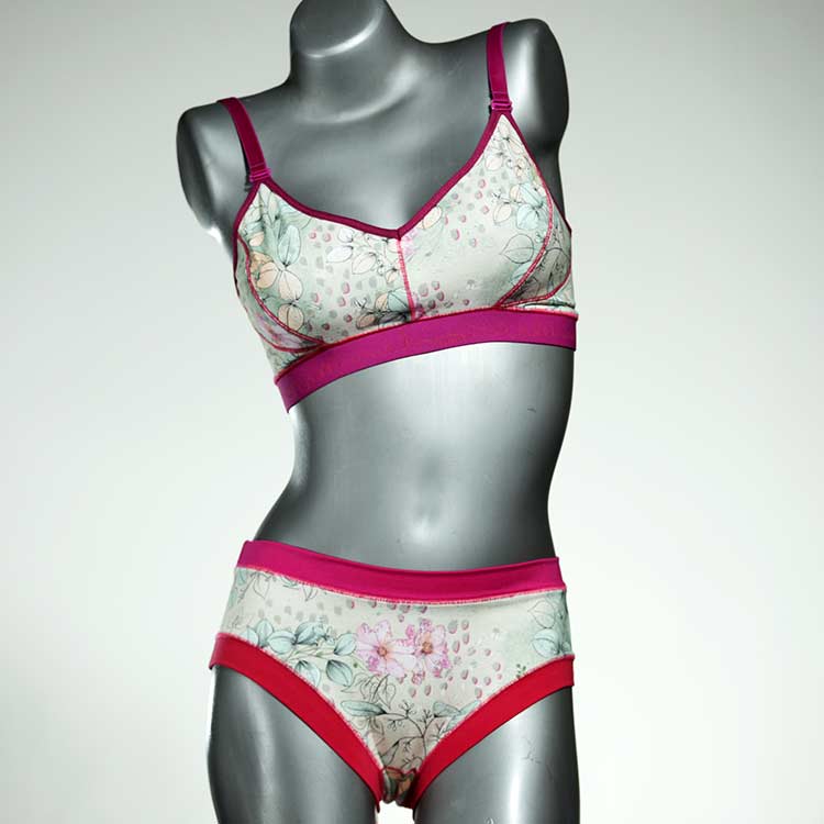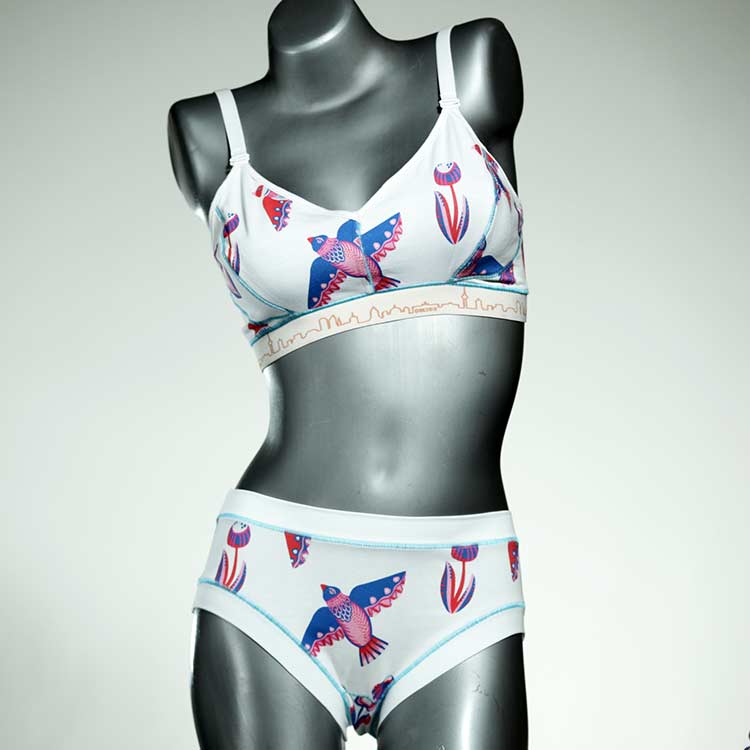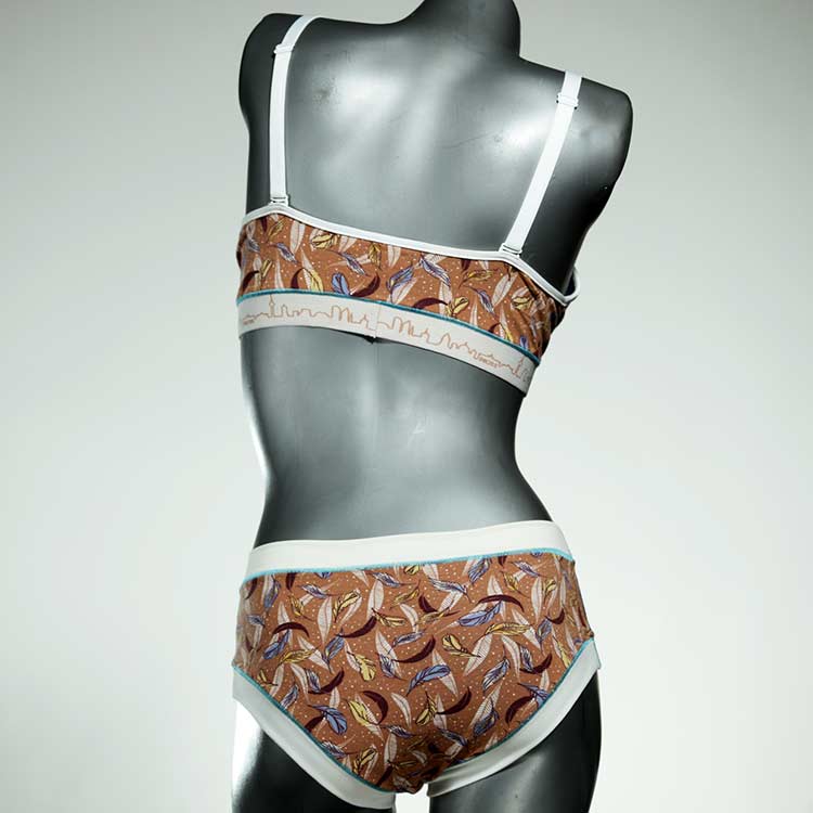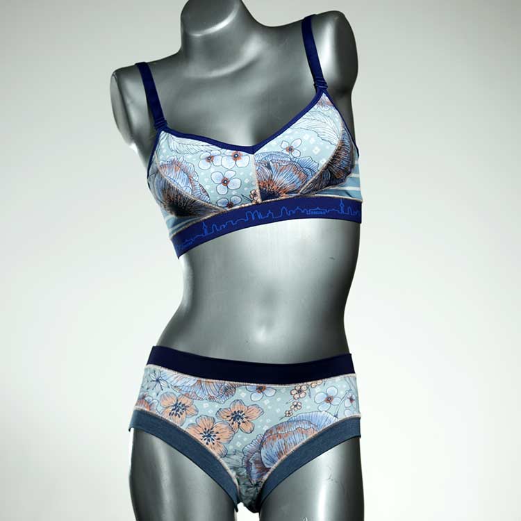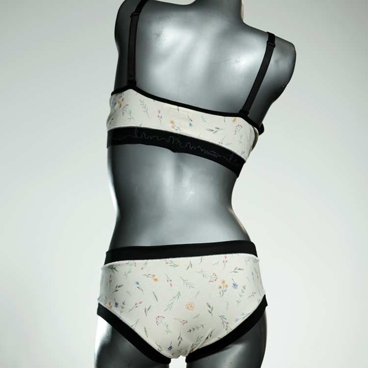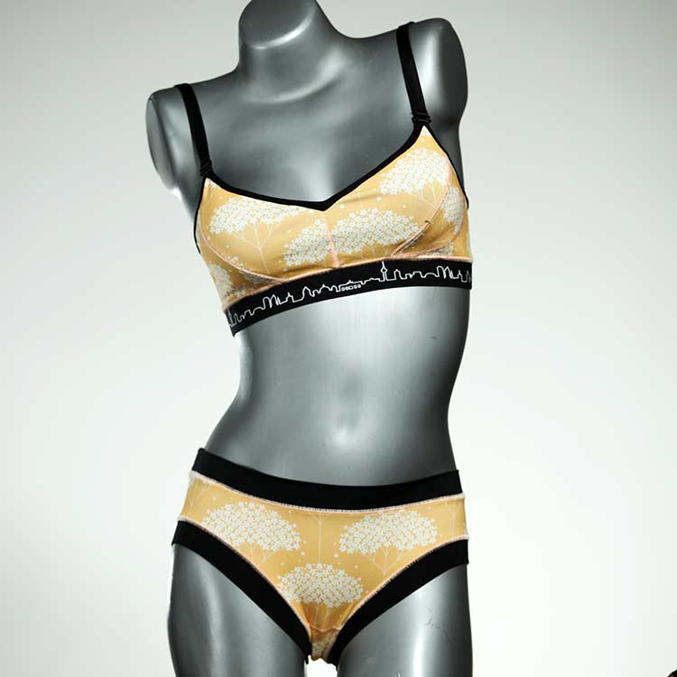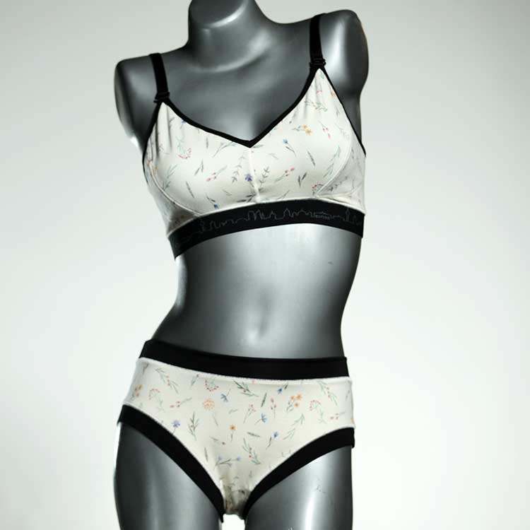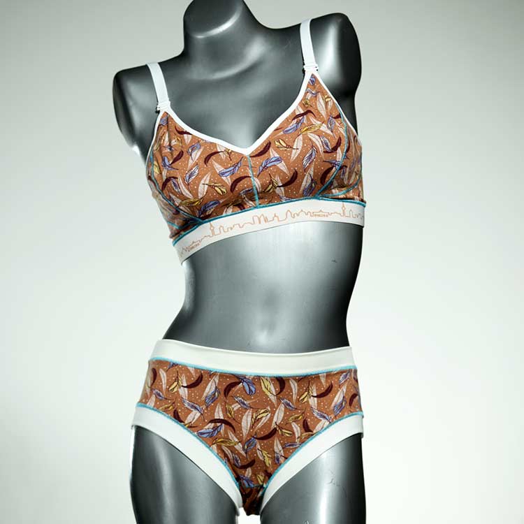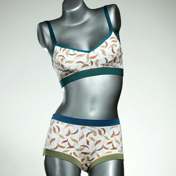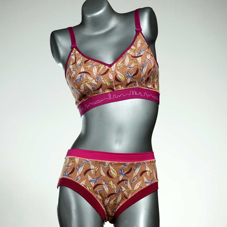 Ensemble unique de soutien-gorge en jersey de coton biologique double épaisseur et respirant avec des bretelles de 16 mm de large et une culotte assortie. Sous-vêtements uniques confortables, équitables et produits de manière durable de notre manufacture. Soutien-gorge sans armature, sans coussin ni fermoir.